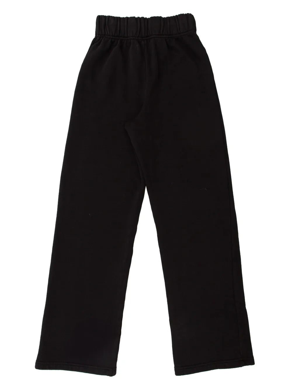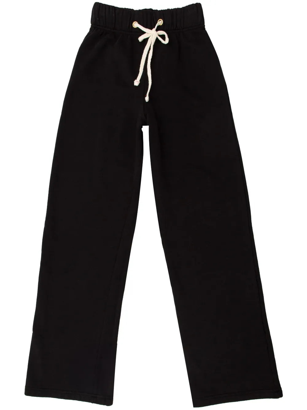 Eazy Classic Pant in jet black by Les Tien. Features a vintage brushed texture that adds a touch of elegance to any outfit. With a pre-shrunk fabric and garment dyed color, these pants offer both comfort and style. The gold Cobrax grommets and interlock cotton drawstrings with red stitching detail add fashionable accents, while the elastic waistband ensures a perfect fit.