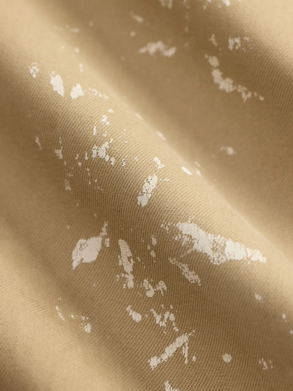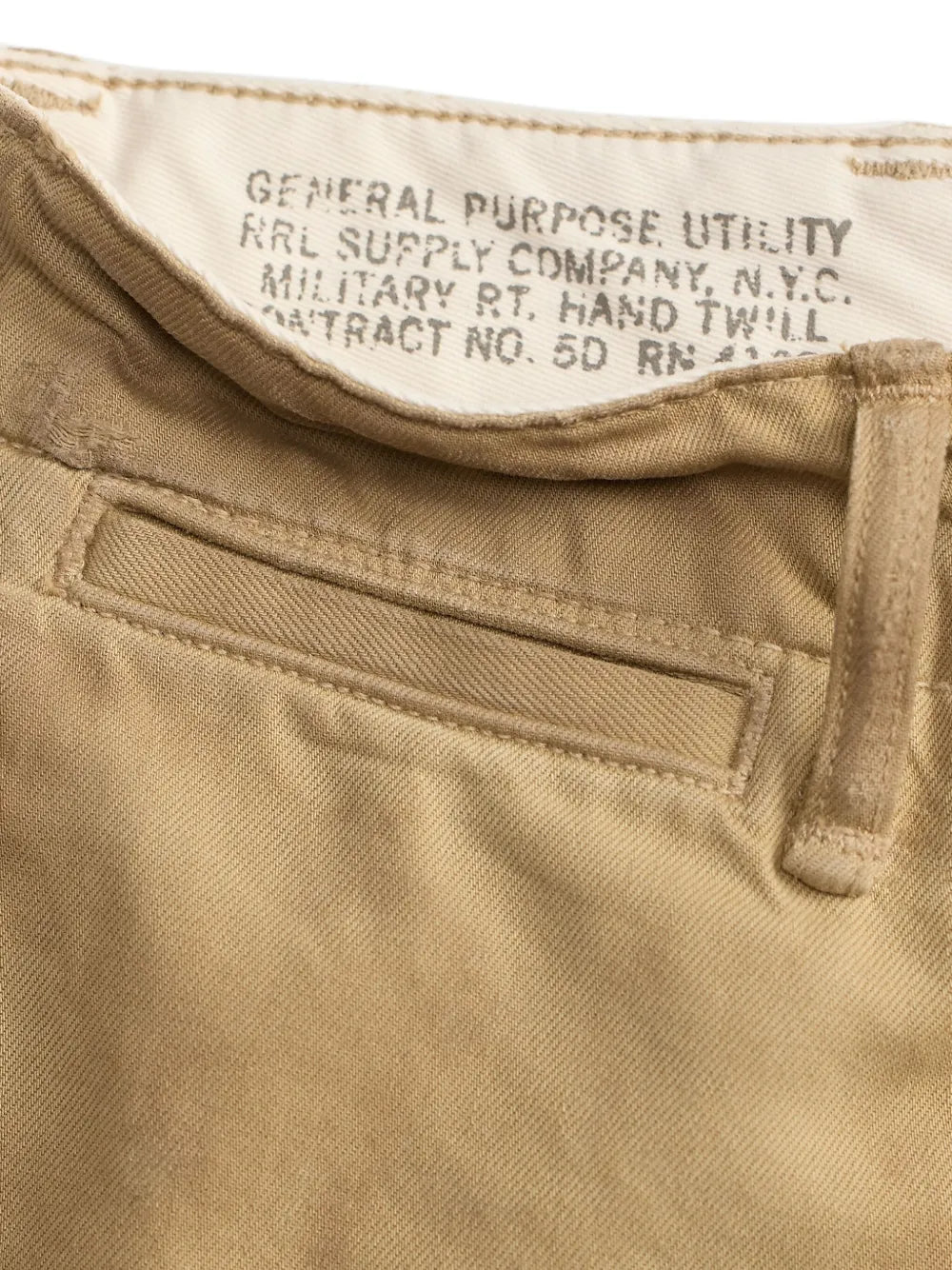 Khaki cotton chino pant by RRL with button and fly closure. Features distinctive paint splatter detailing and functional side slit pockets for everyday wear.