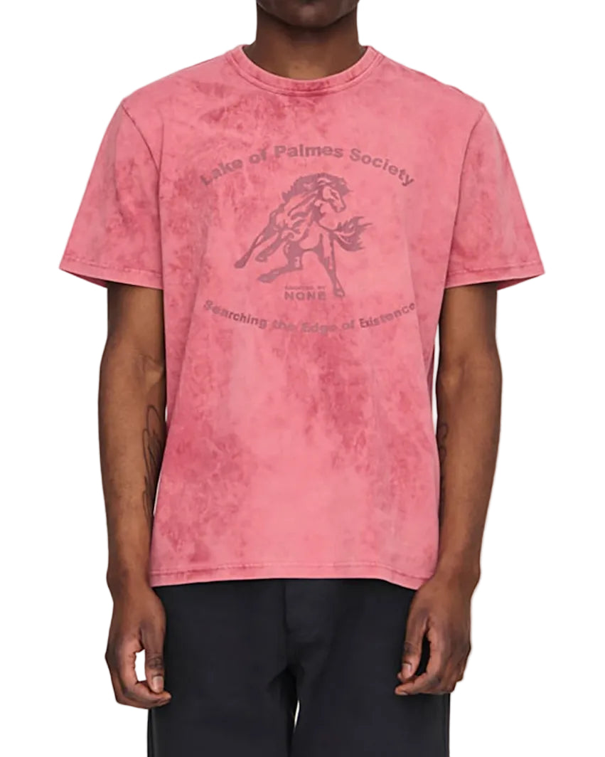 Lake T-Shirt in red by Palmes. Midweight fabric with a soft, textured feel and cracked screenprinted artwork on the front. Dyed for a distinctive, worn-in aesthetic.