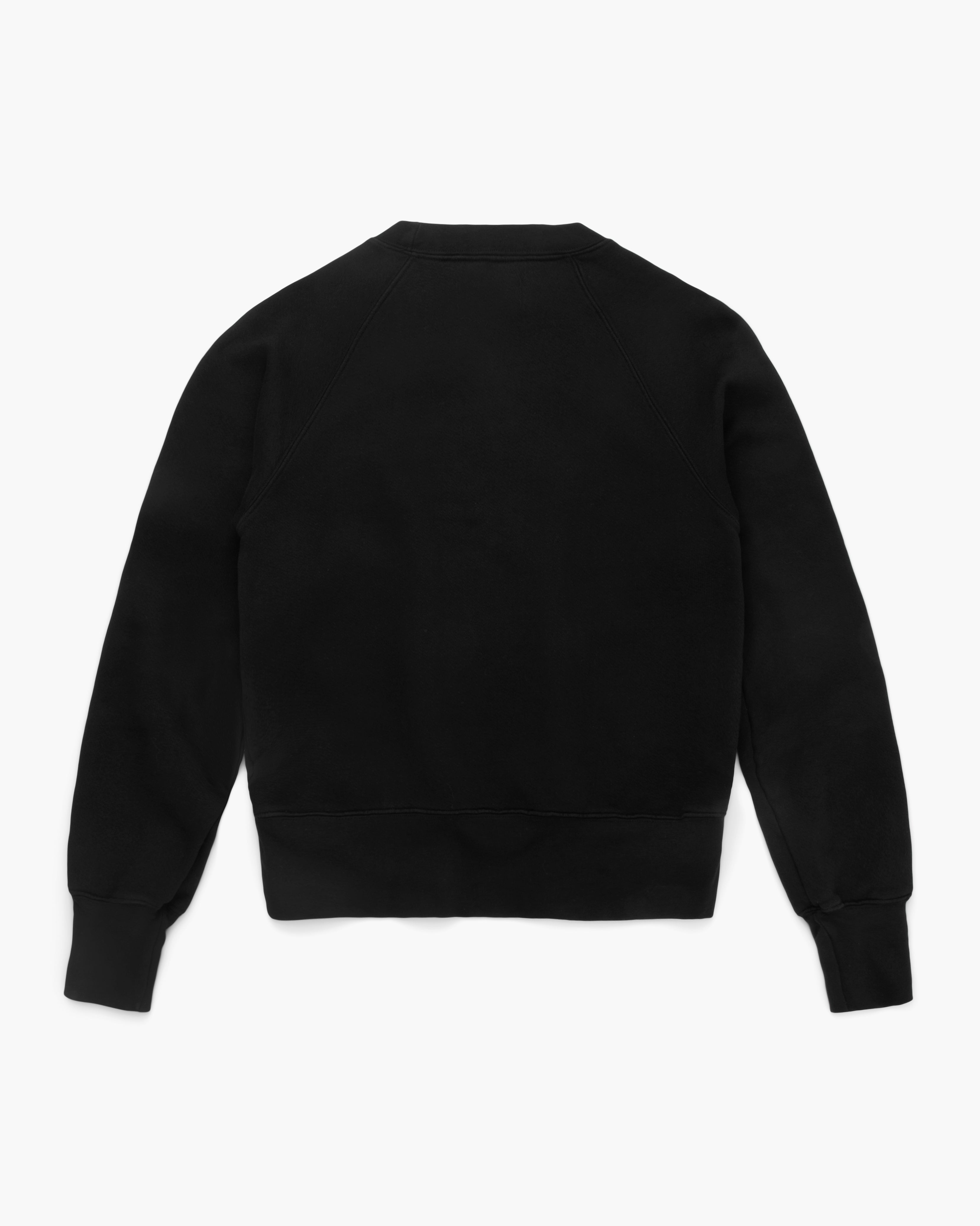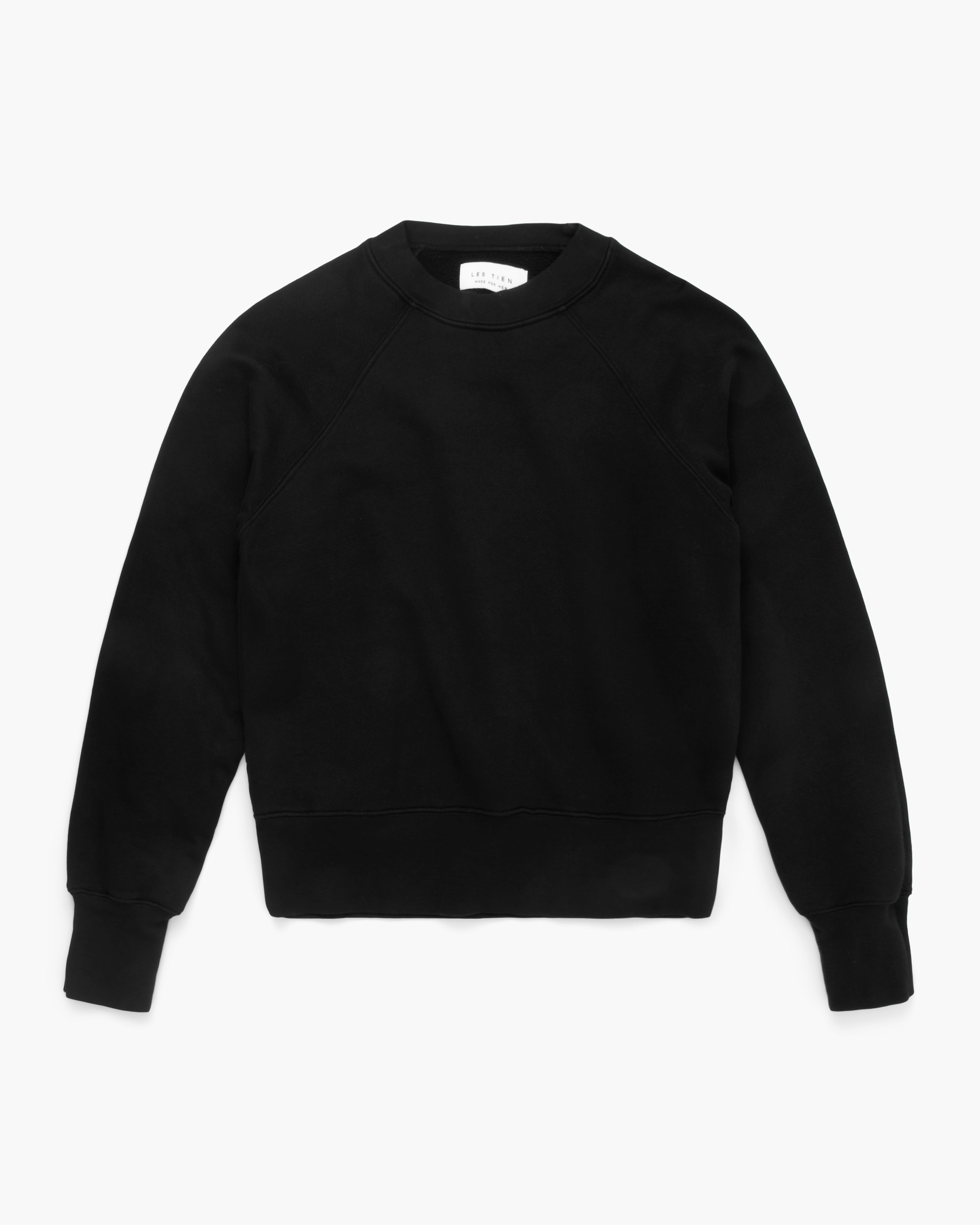 Linda Classic Raglan in jet black by Les Tien. Structured 100% cotton fleece with a relaxed, boxy silhouette that hits at or above the waistline. Features raglan shoulders, vintage brushed texture, and 4" cuffs. Made in USA.