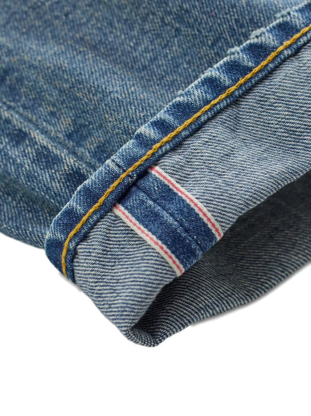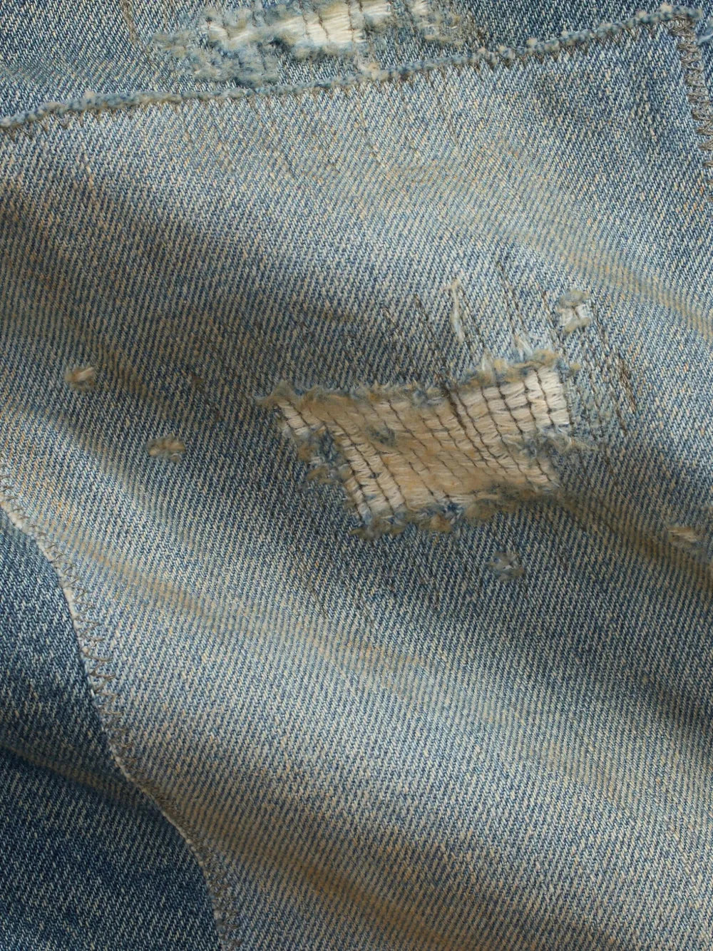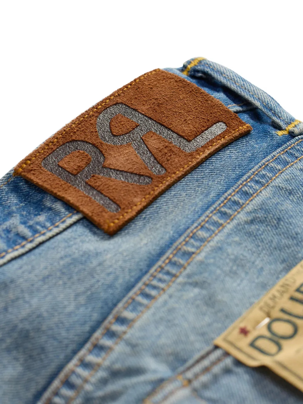 Straight Fit Seledge Denim by RRL in light blue with distressed patchwork detailing and ripped accents. Five-pocket design with logo patch.