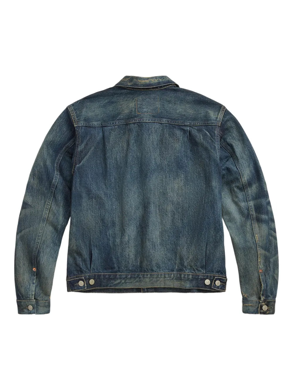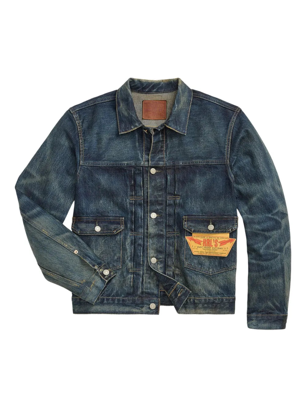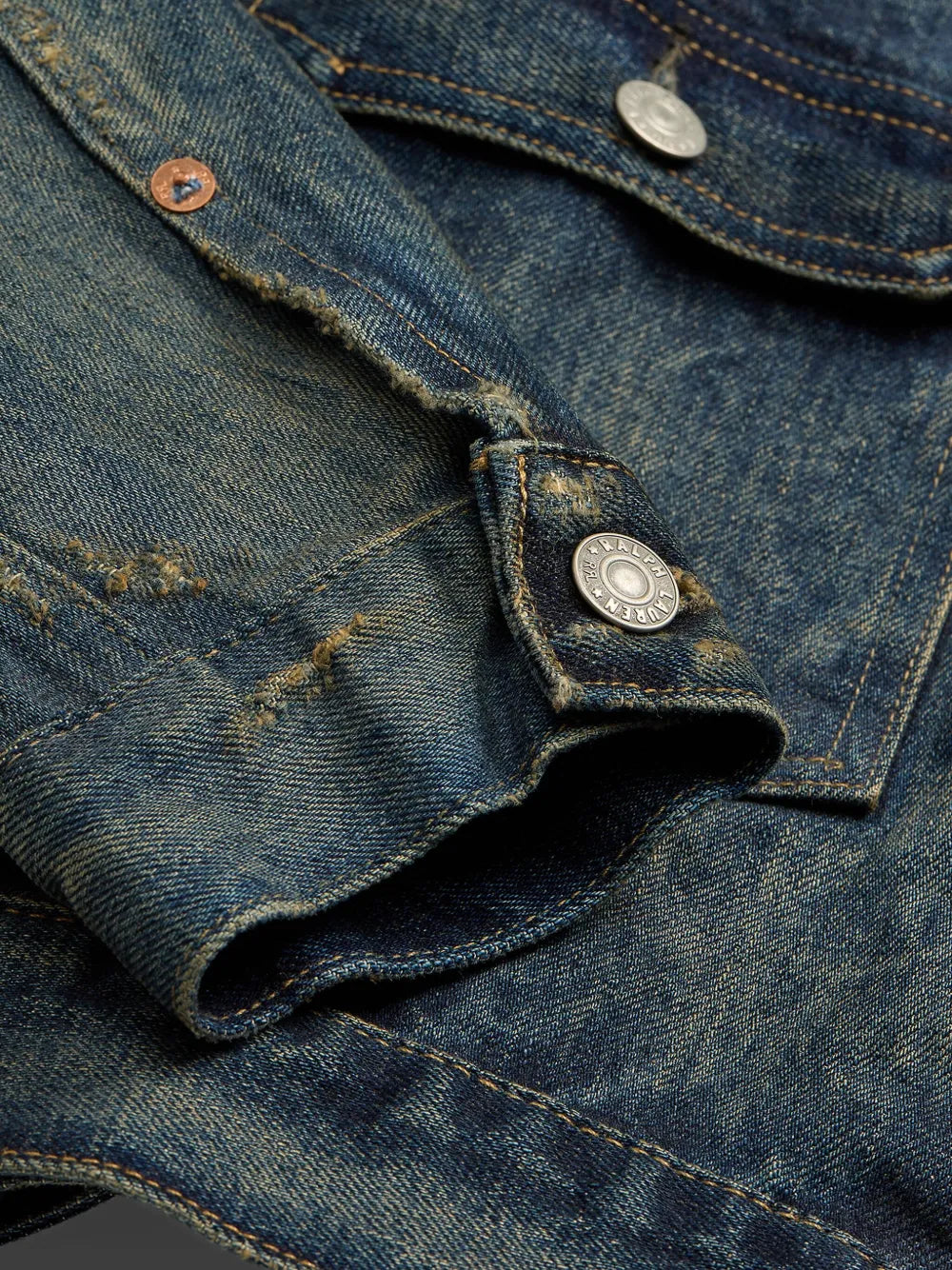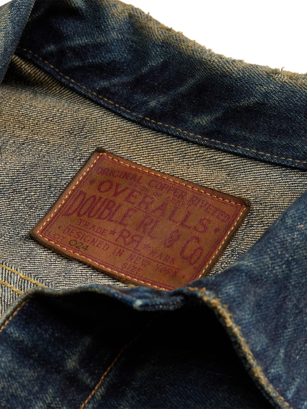 Type 2 3X1 Denim Trucker Jacket in westview indigo wash by RRL. Deep blue denim with button front, flap pockets, western-style yoke, and long sleeves.