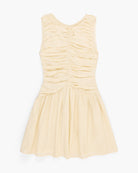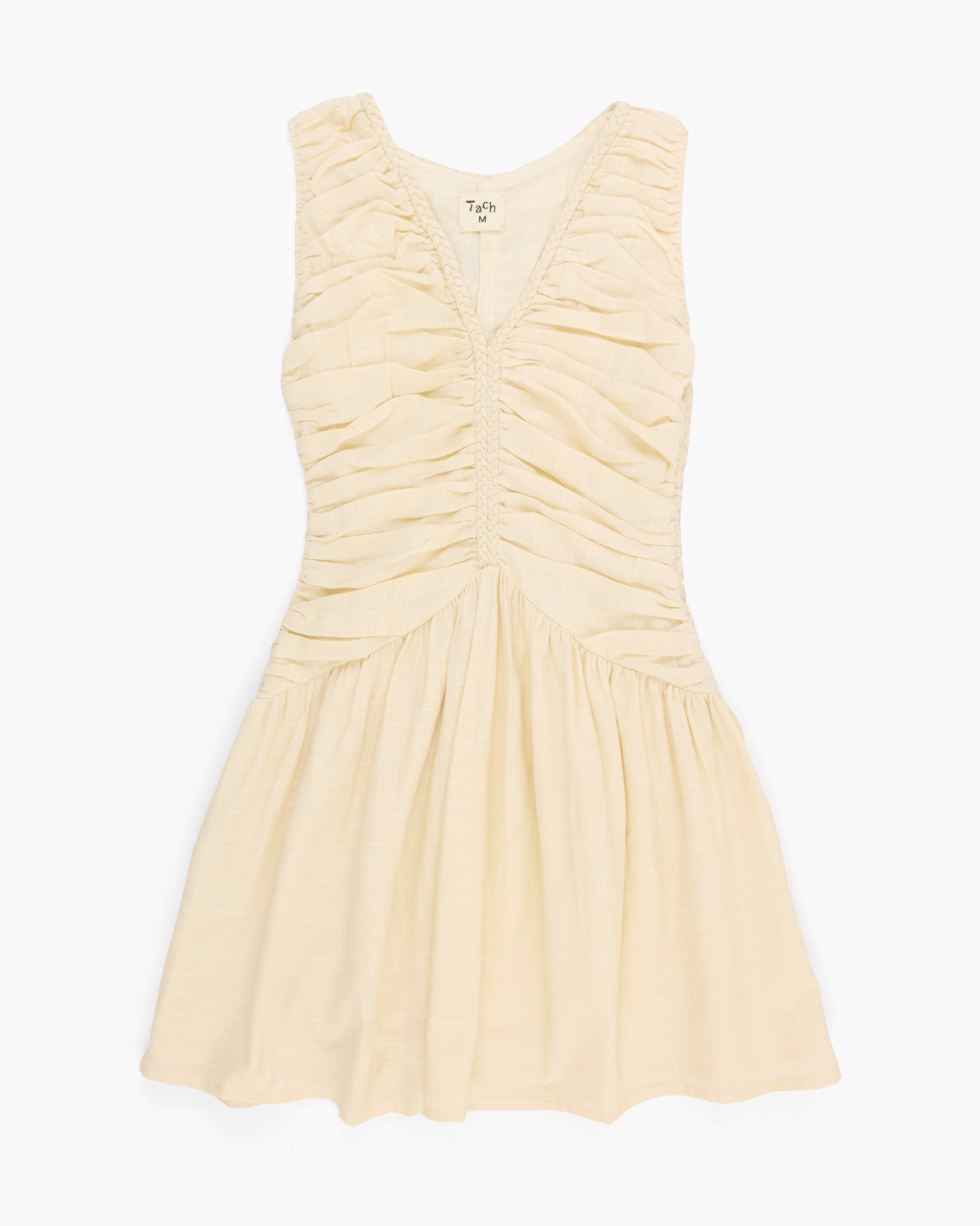 Cream mini dress by Tach featuring a deep V-neckline, cap sleeves with ruched detailing, and an invisible side zipper. Fully lined for comfort.
