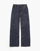 Wide-leg selvedge jeans in lightweight raw denim with white line detailing and shell-edge stitching. Two-piece waistband resists stretching while a long 6-inch zipper ensures easy wear. Ready to wear immediately with minimal waistband gapping.
