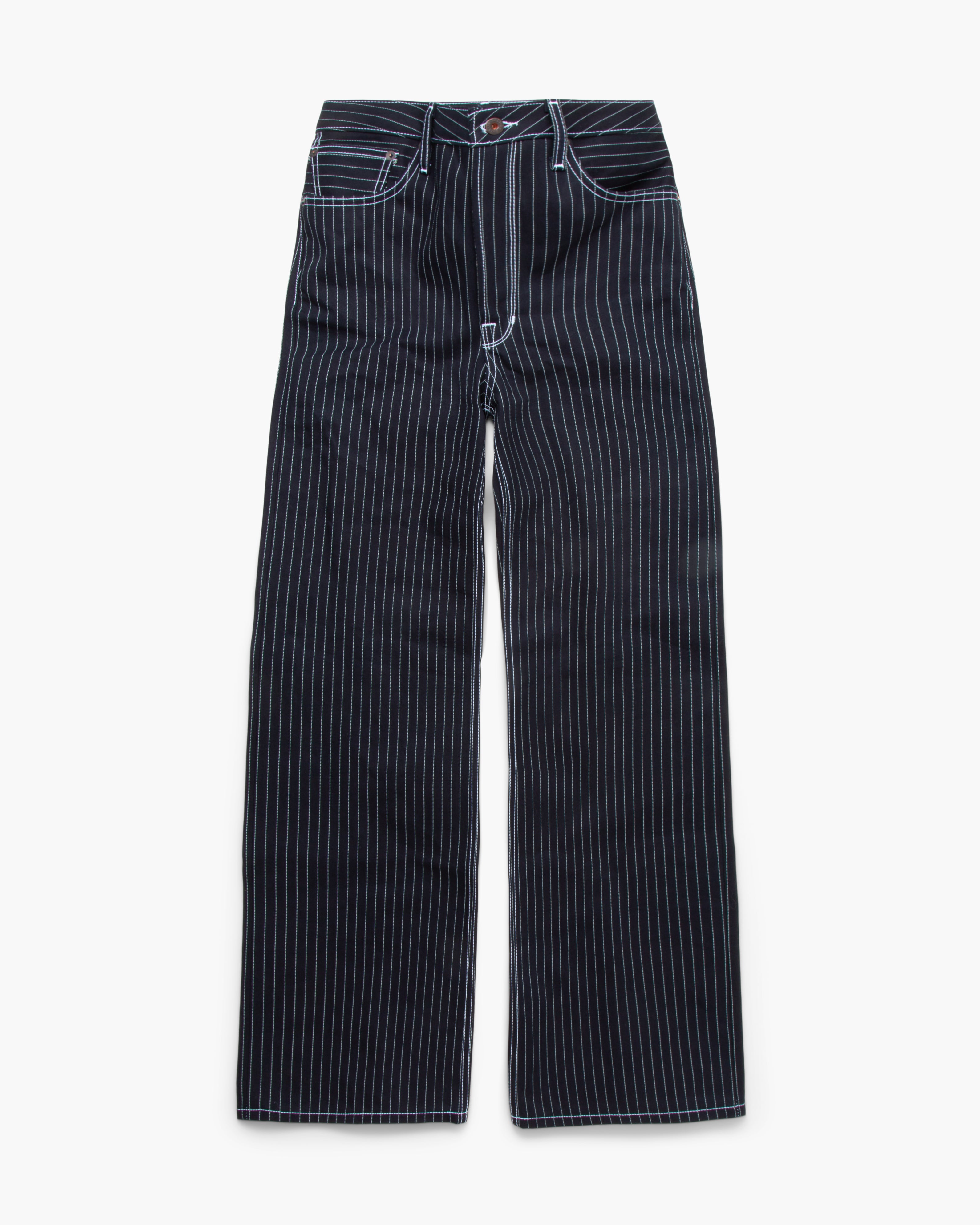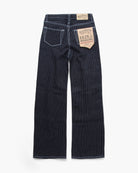 Emily X122 in shadow wabash selvedge raw denim by Railcar. Shadow wabash selvedge jeans with dark indigo warp and black weft that creates unique shadow fades as they wear. Features shell-edge stitching, two-piece waistband to prevent stretching, and a 6-inch zipper for easy wear. Ready to wear immediately with minimal waistband gapping.