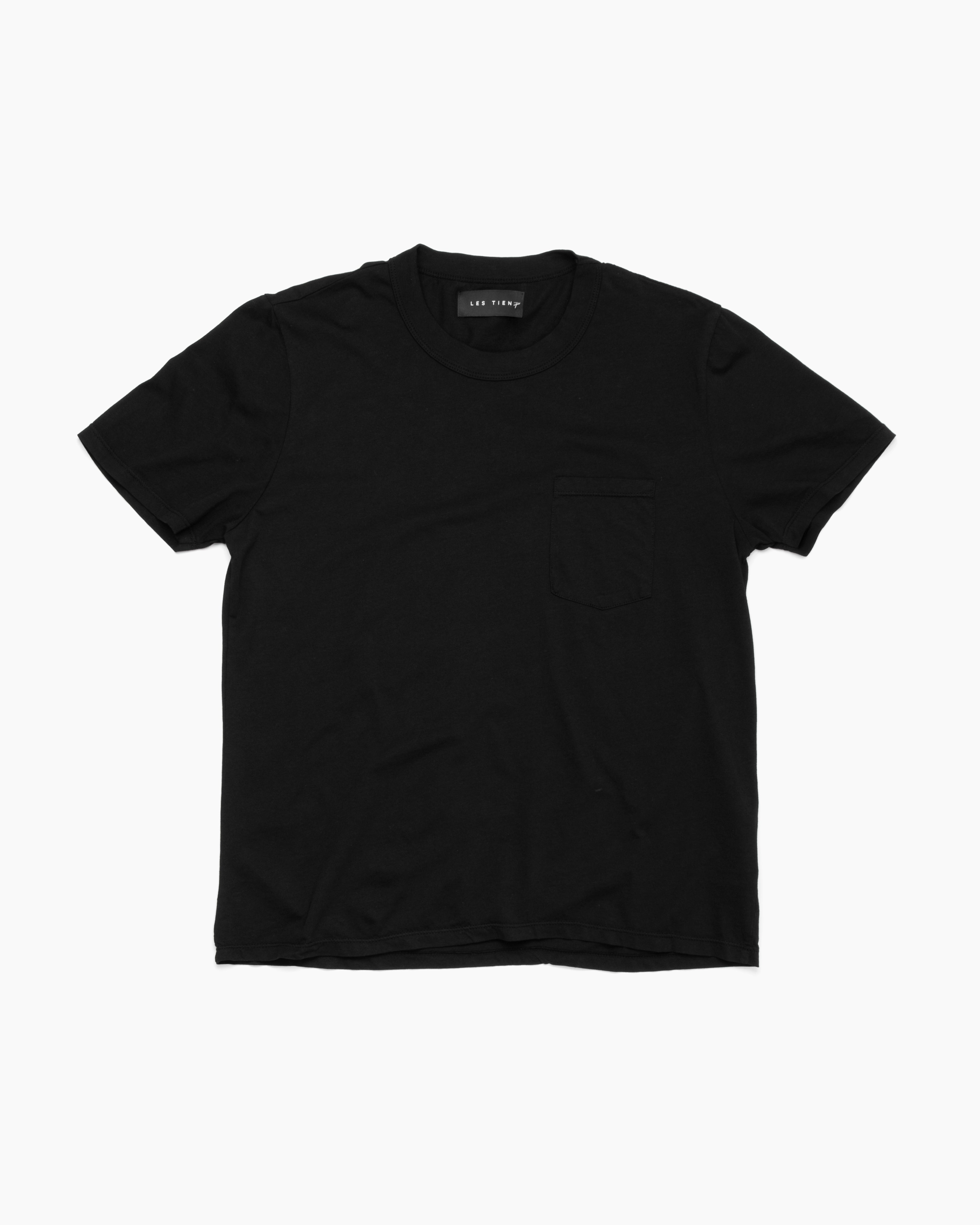 The Lightweight Classic Pocket Tee in jet black by Les Tien is made in the USA from 100% cotton. It features a garment-dyed finish, a crew neckline, and a patch pocket on the left chest.