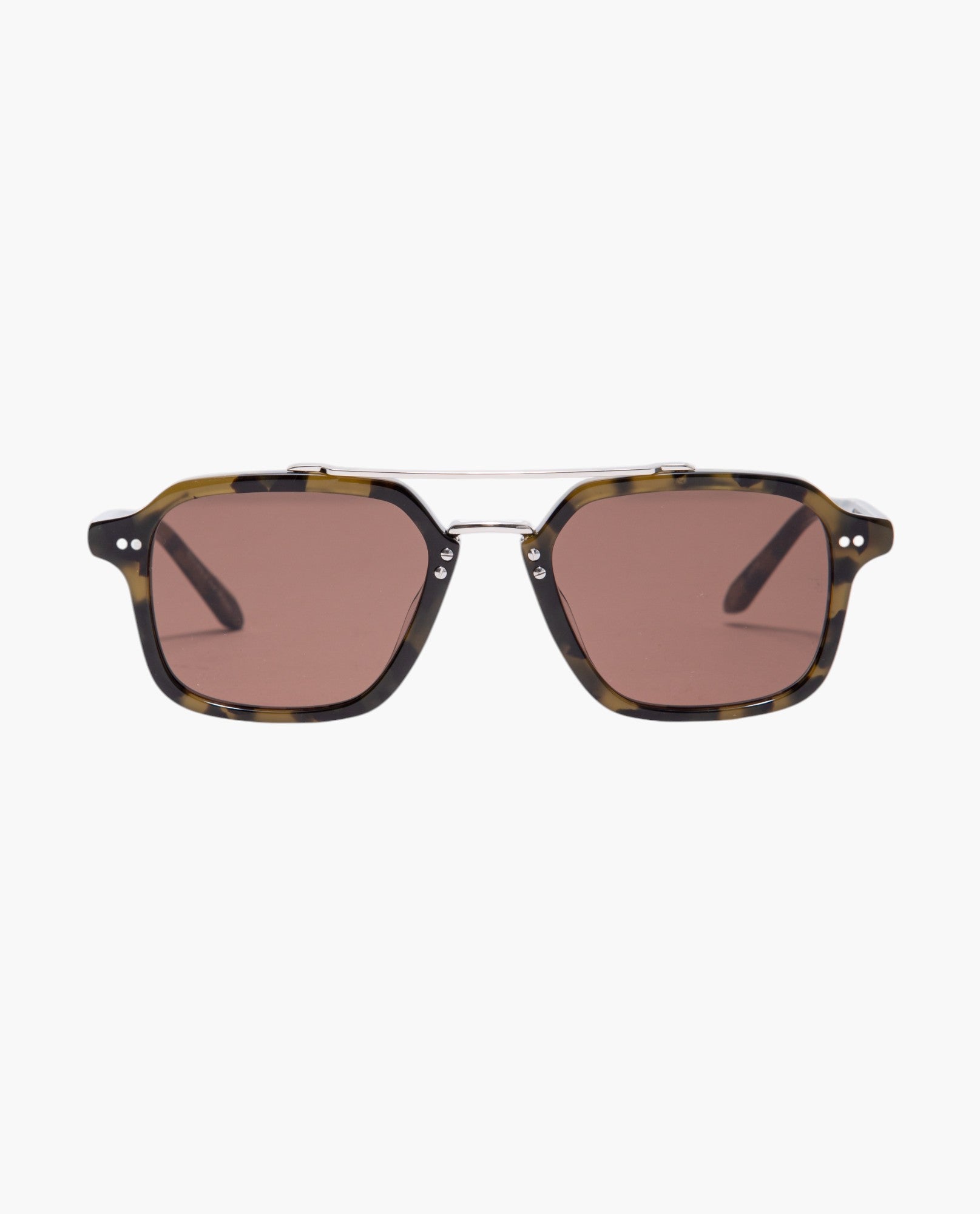 The Colton Sunglasses in Tortuga Silver by Krewe feature a stylish rectangular aviator design with a brow bar. This durable frame is made of glossy acetate and silver stainless steel, providing a comfortable fit for various face shapes.