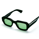 Dave E2B in black by Waiting For The Sun. Blending retro 2000s vibes with sharp modern design. Handcrafted from eco-friendly bio-acetate that's biodegradable and recyclable, these unisex frames balance boldness with refinement. Green Carl Zeiss lenses deliver category 2 UV protection with graphic appeal. Perfect for those who prioritize both personal style and planetary responsibility.