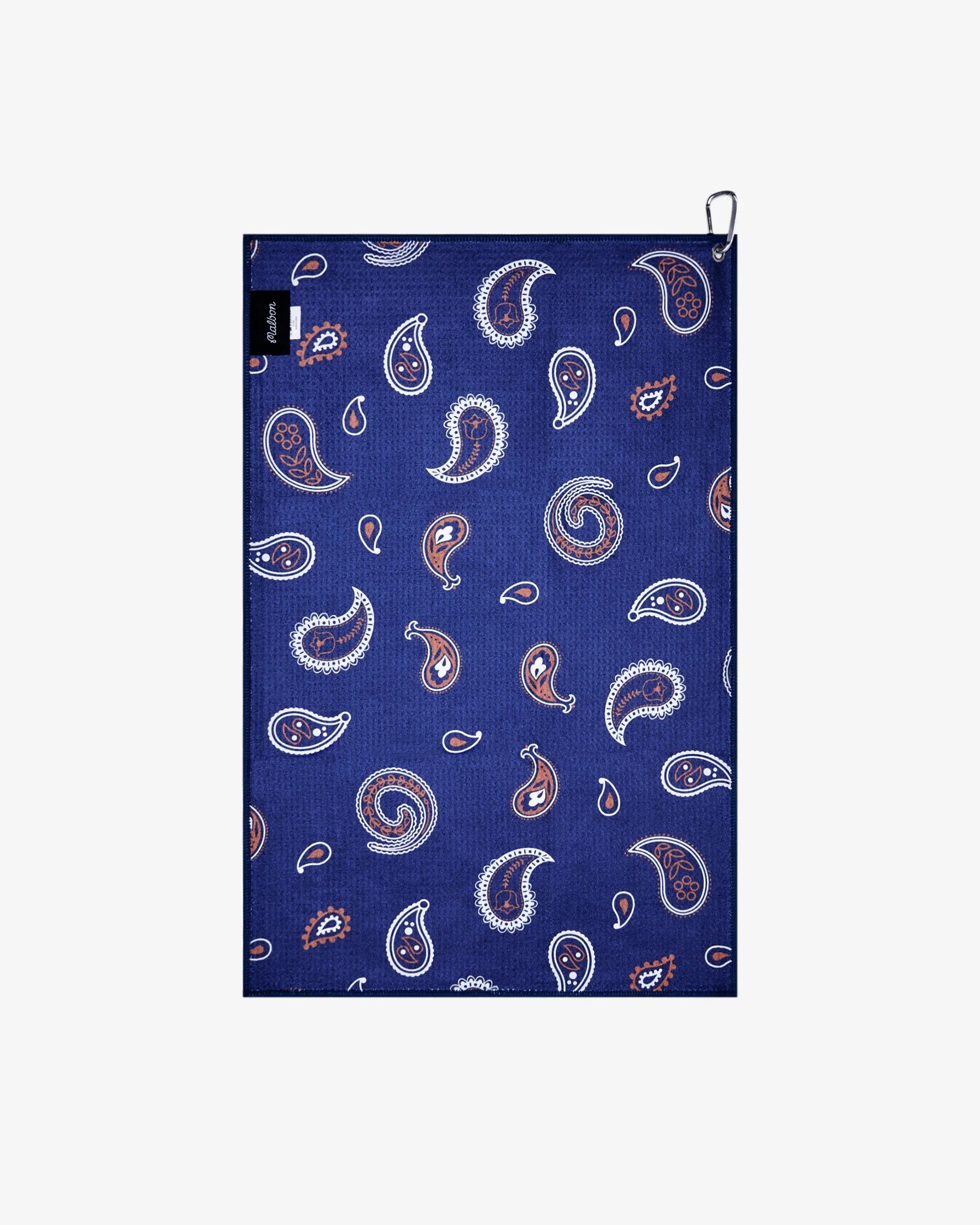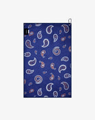 Paisley Golf Towel in navy by Malbon pairs microfiber construction with printed paisley and Malbon Golf artwork. A metal eyelet with carabiner attachment makes it easy to clip to your bag for on-course convenience.