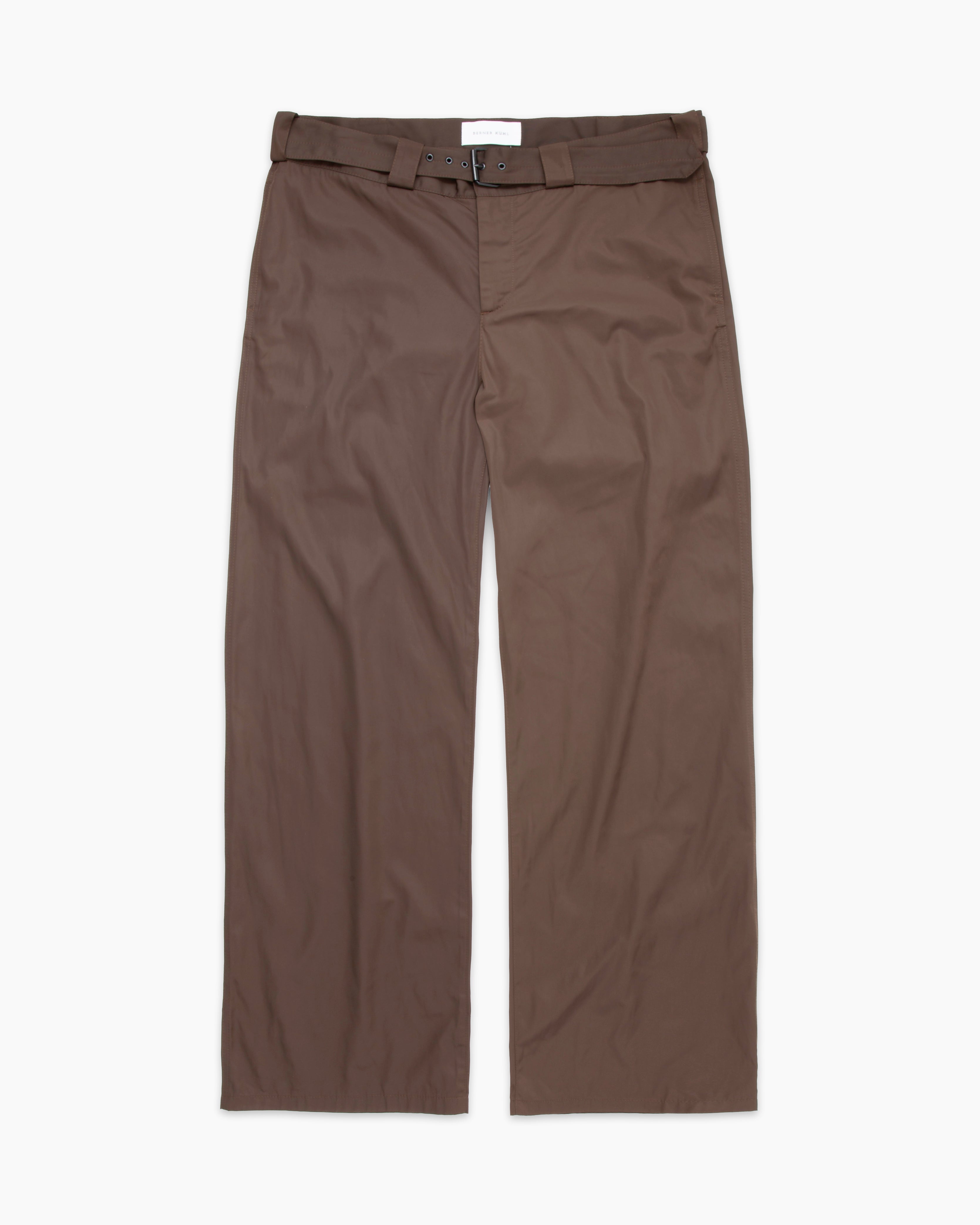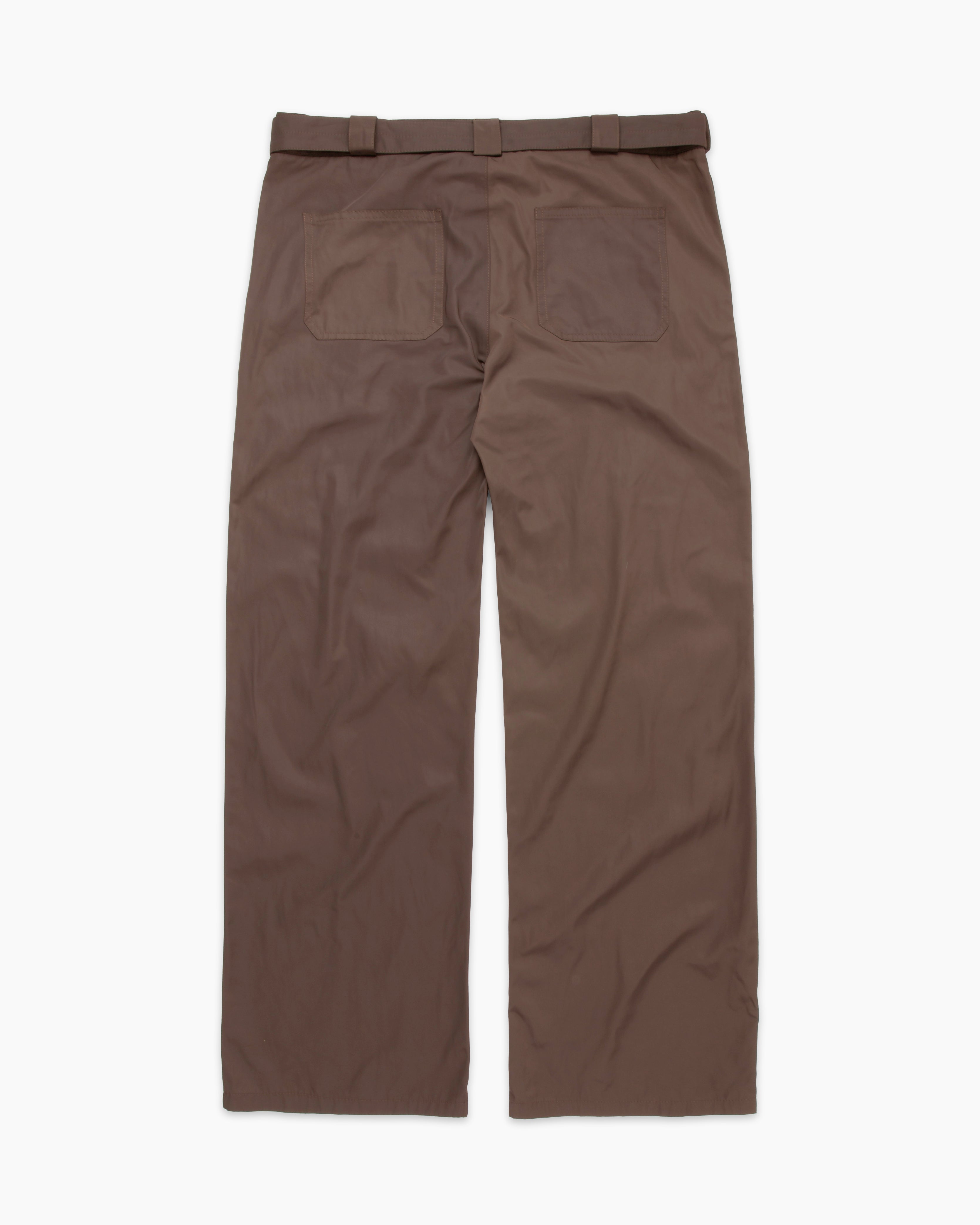 Chocolate Belt Trouser by Berner Kuhl made from deadstock Italian polyester. Features a straight, wide-leg silhouette with zip fly, dual side pockets, patch back pockets, and a detachable waist belt.