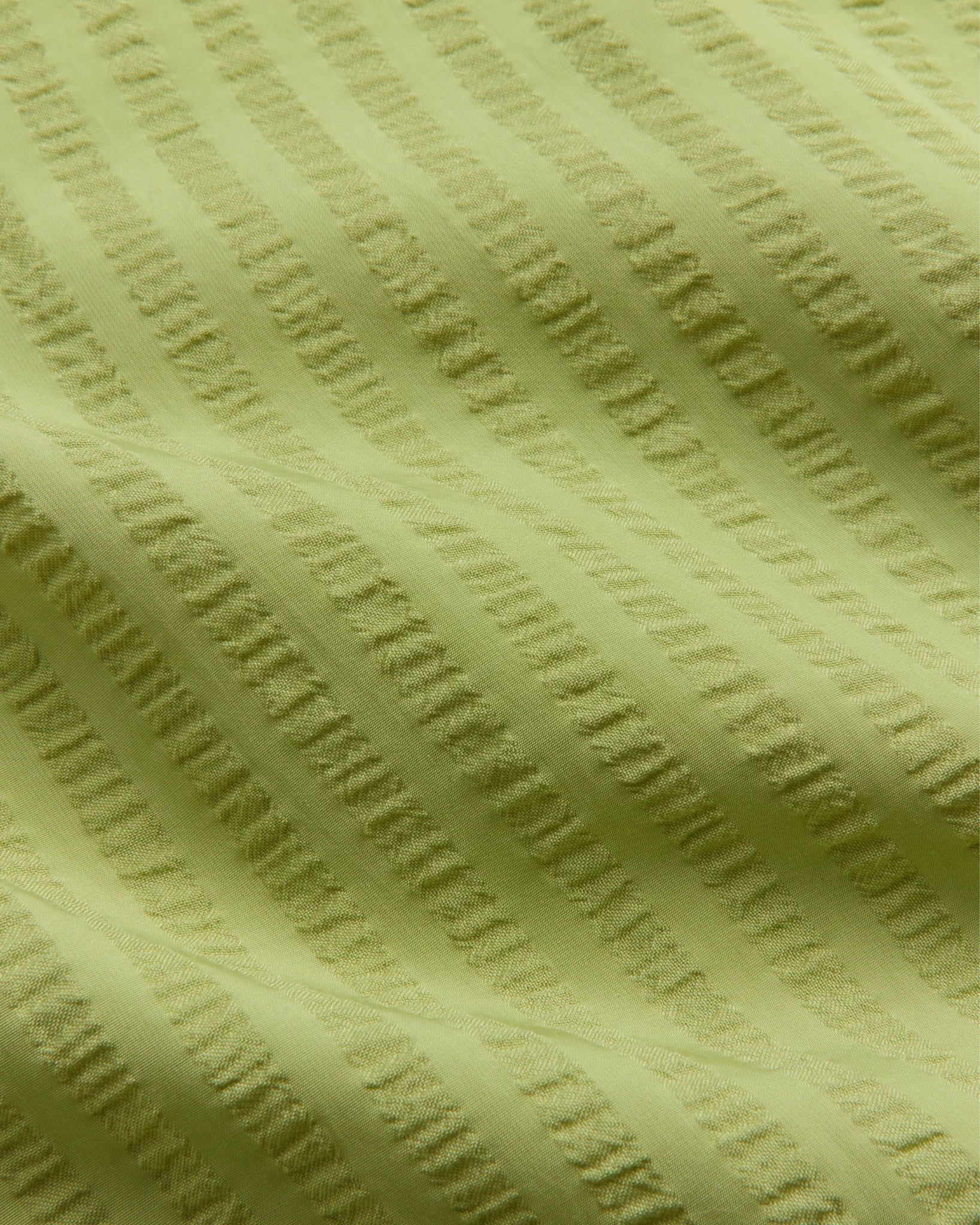 Lightweight striped shirt in green featuring a pointed collar, buttoned cuffs, and curved hem. The Tencel-blend fabric offers a fluid drape with natural texture and wrinkle-resistant qualities.