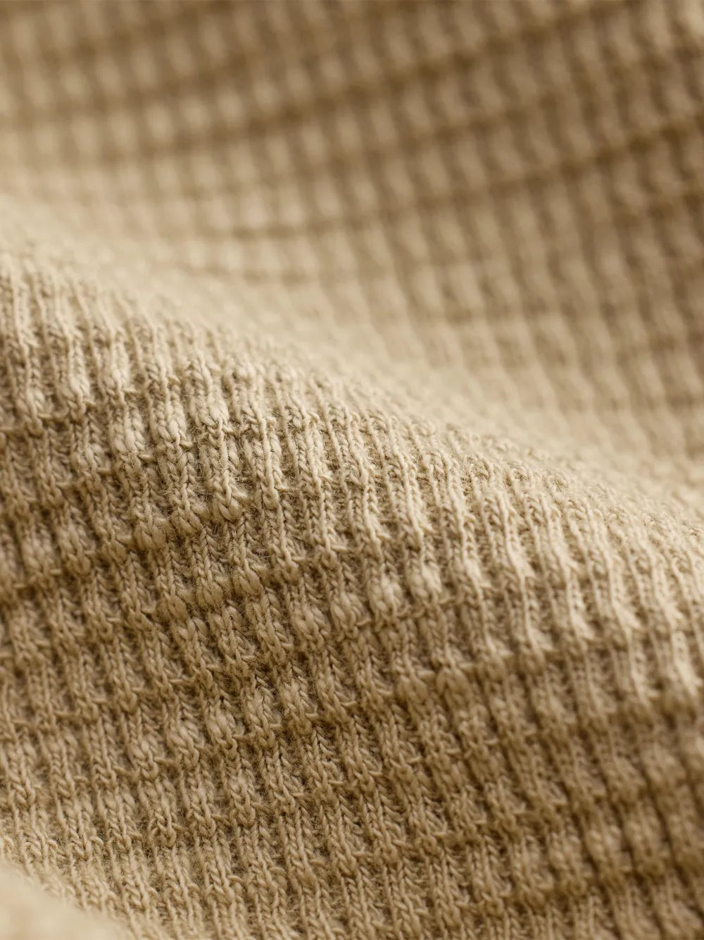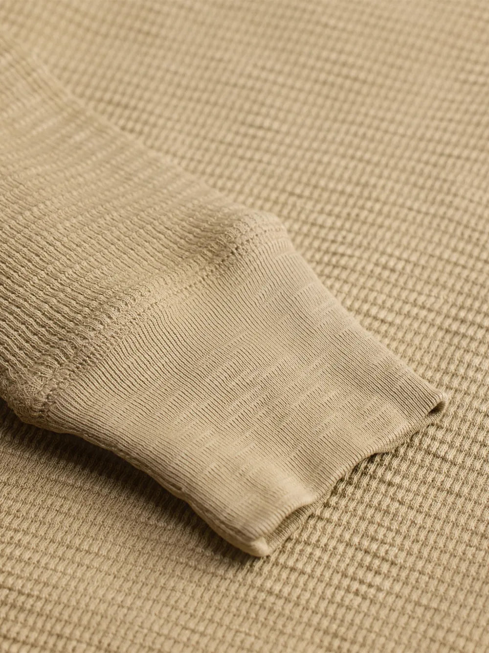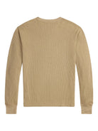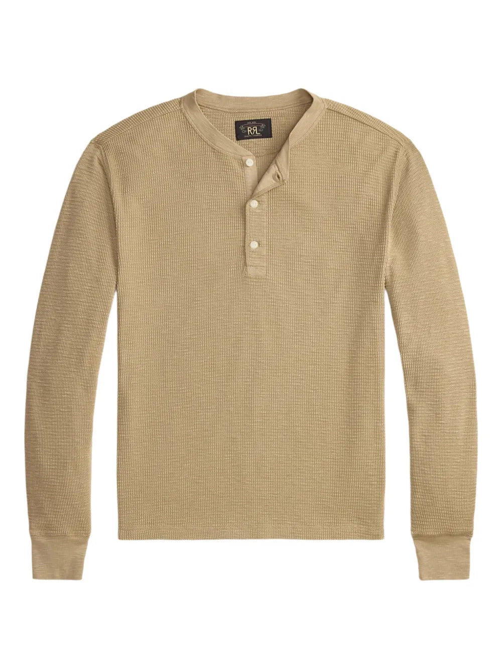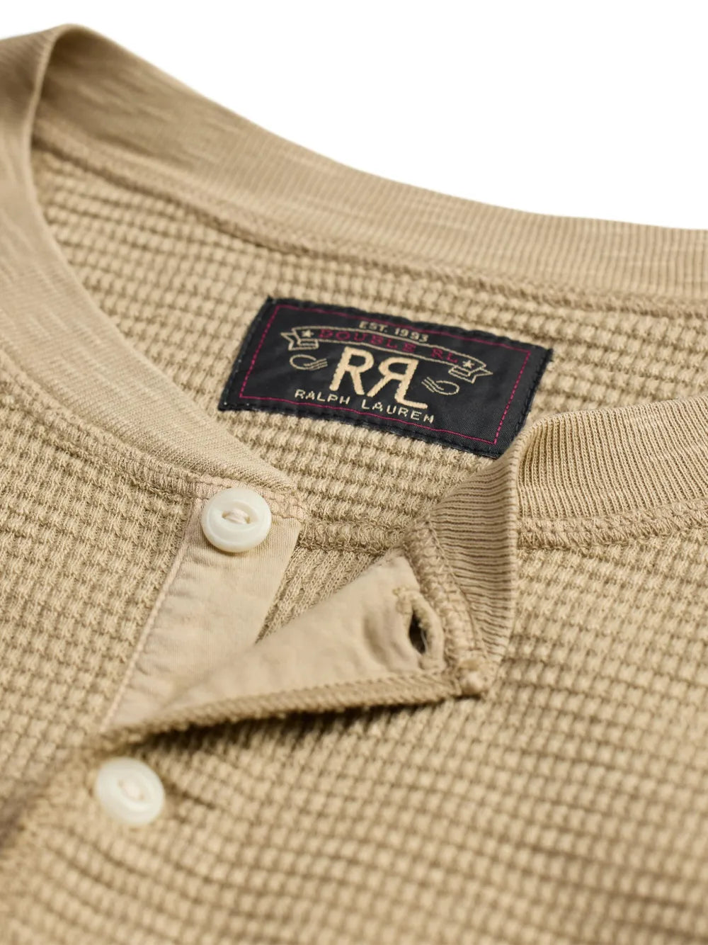 Spring beige henley by RRL in substantial waffle-knit cotton with garment-dyed finish. Features a sateen placket, ribbed trim, and vintage-inspired buttons. Washed for a soft, lived-in feel.