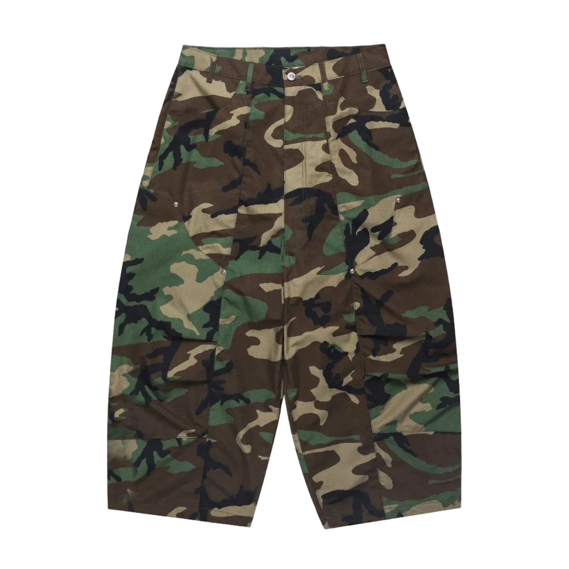 Parachute USA Twill Pant in camo by Art Community. Durable ripstop camo in 50% cotton, 50% nylon blend. Features double pleated front panels, an adjustable back strap, and versatile styling options. Military deadstock fabric cut and sewn in Los Angeles. Order true to size.