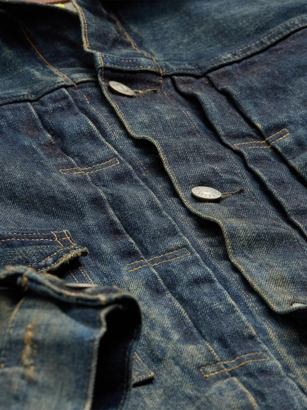 Type 2 3X1 Denim Trucker Jacket in westview indigo wash by RRL. Deep blue denim with button front, flap pockets, western-style yoke, and long sleeves.