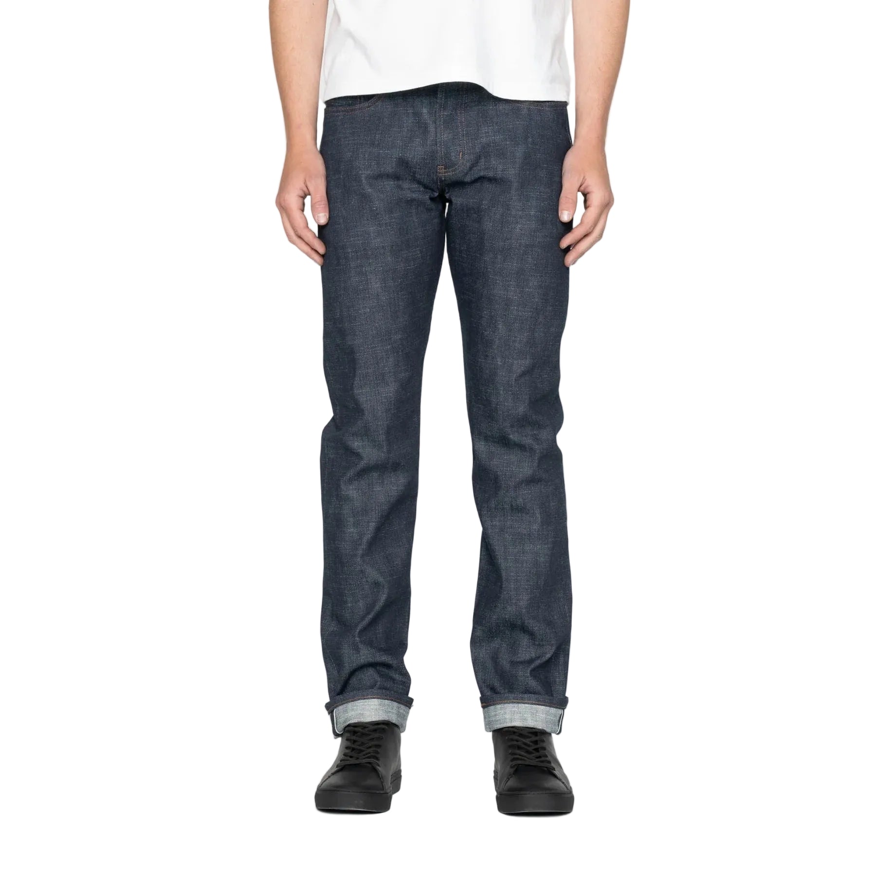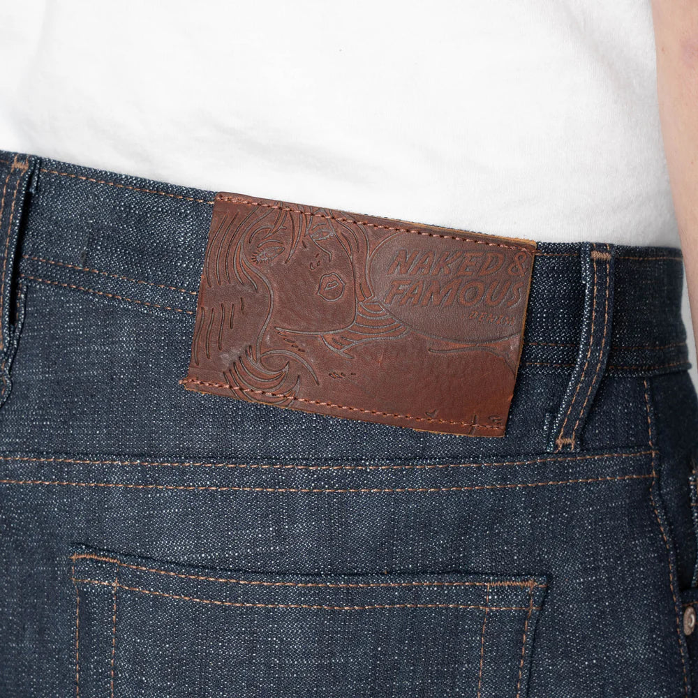 The Weird Guy Jean in Greencast Stretch Selvedge by Naked & Famous features a 12.5oz Japanese selvedge denim. Built on a proven slub construction, it delivers depth and texture while maintaining comfort and flexibility. Rope-dyed in indigo with a subtle green cast, the fabric offers an alternative to standard dark indigo denim. The stretch component improves ease of movement without compromising the fabric's traditional appearance. Finished with a waxed pull-up leather patch, the denim is soft from the start and requires minimal break-in. The Weird Guy is a regular tapered fit with medium rise, standard thigh, and slight taper from the knee to hem.