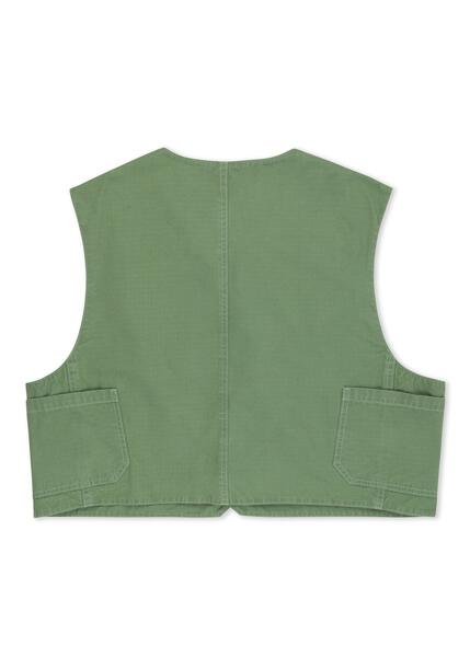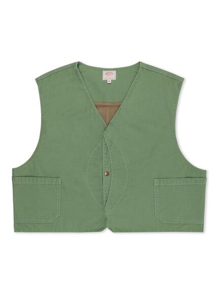 The Ripstop Vest in army green khaki by Vintage Heavy features a vintage-inspired boxy fit, snap button closure, and two wrap patch pockets at the waist.