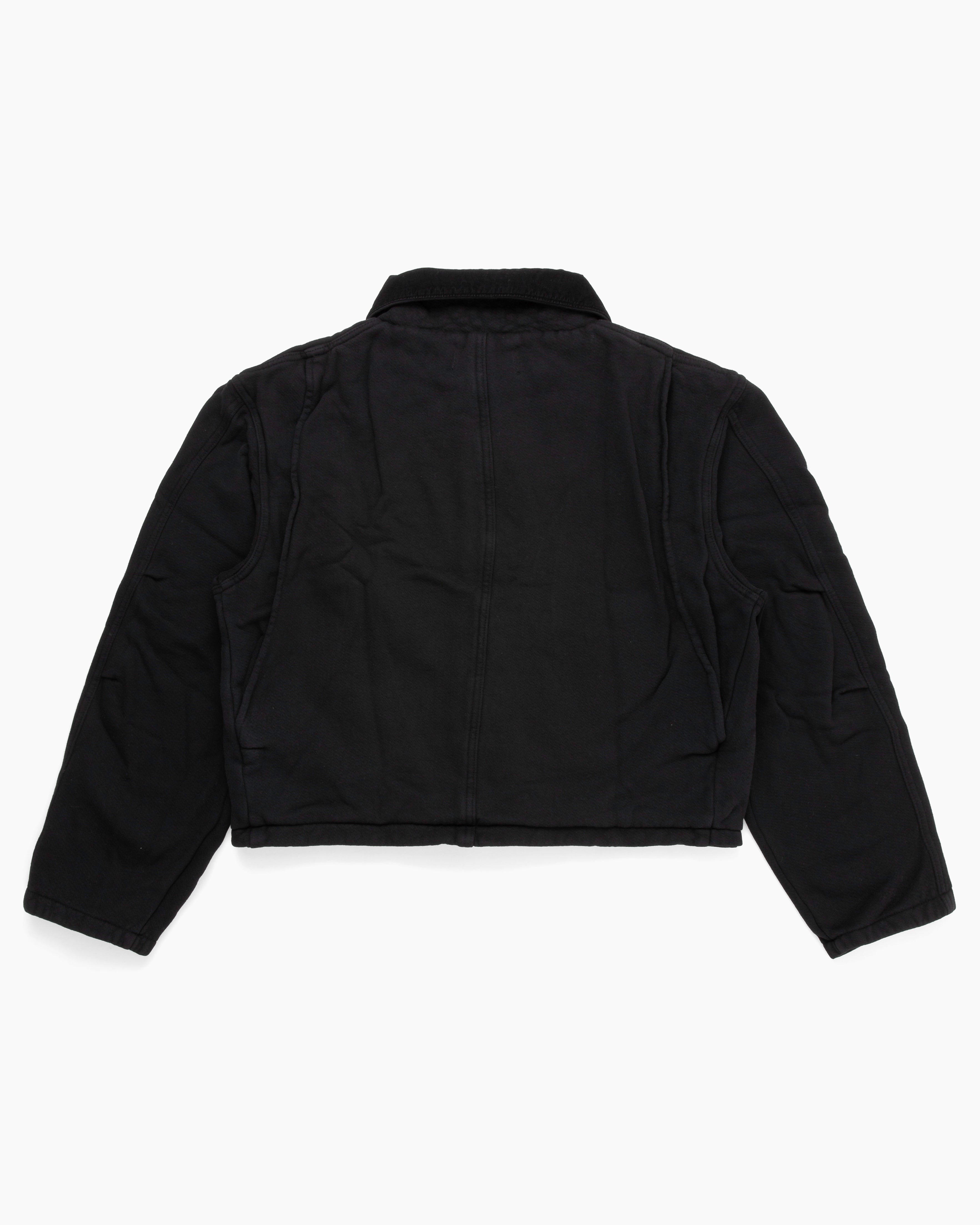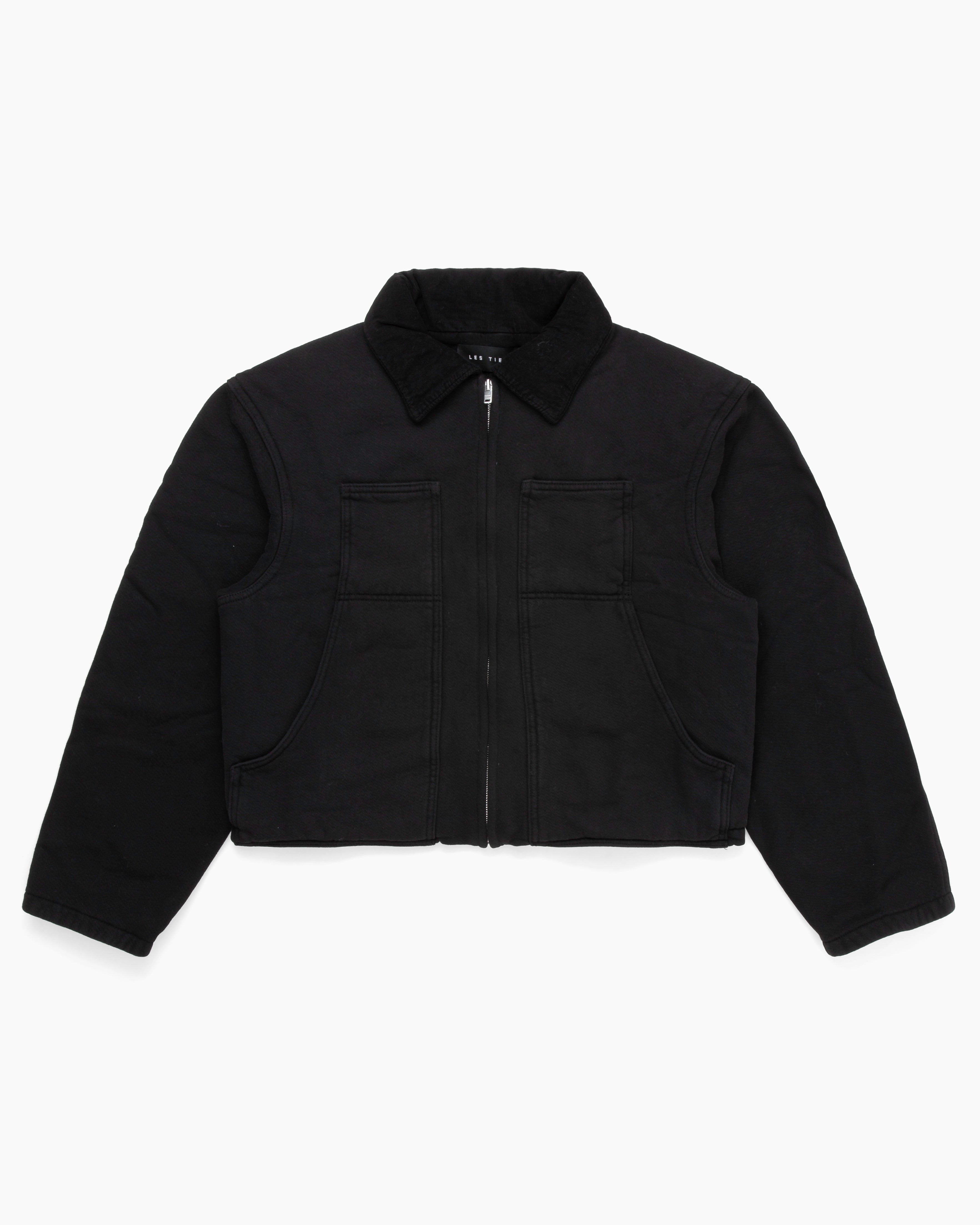 Heavyweight Utility Jacket by Les Tien in jet black. Made in USA from 100% cotton heavyweight fleece with vintage brushed texture, oversized fit, Riri zipper, front patch pockets, and reverse outer stitching.