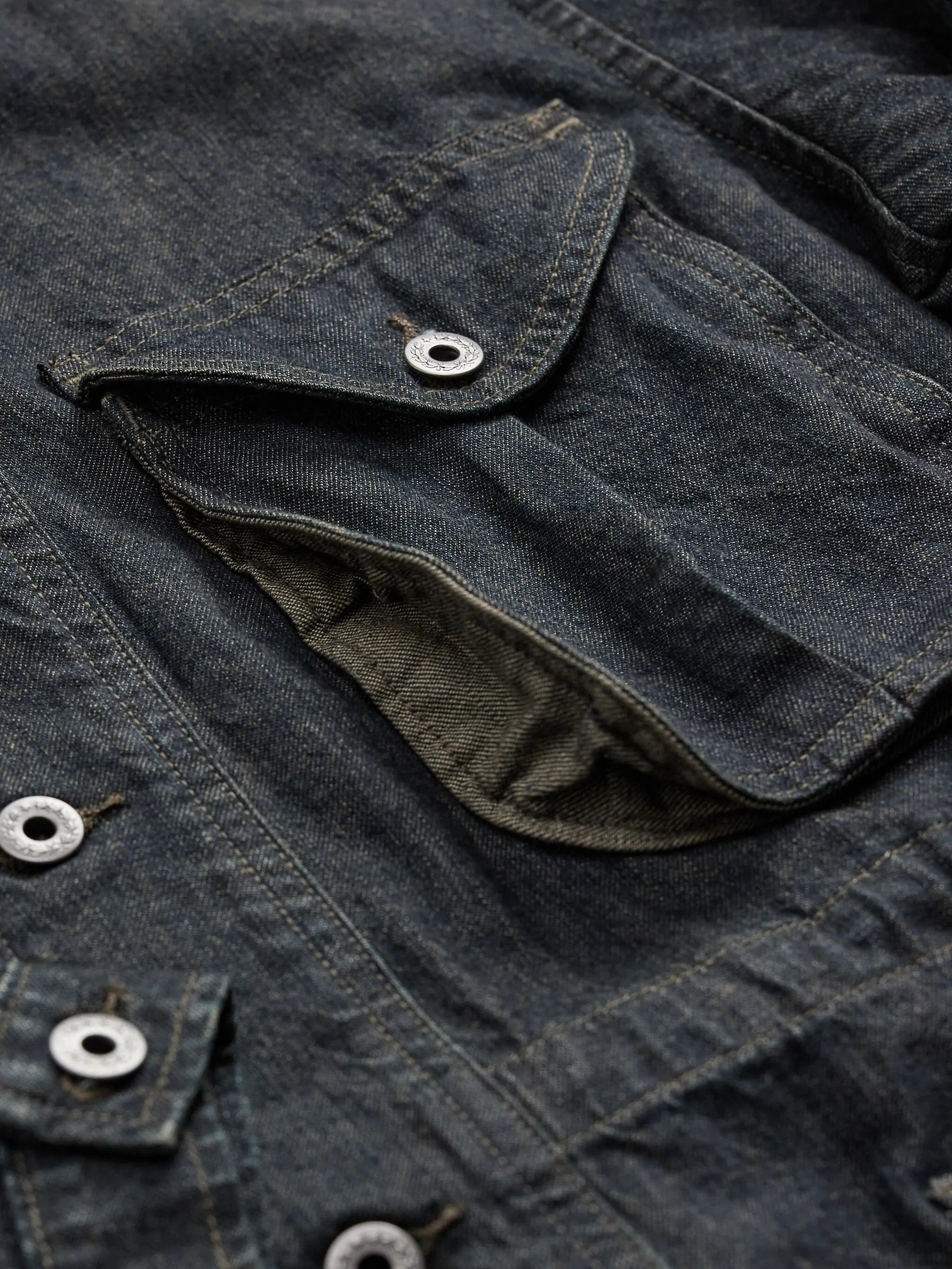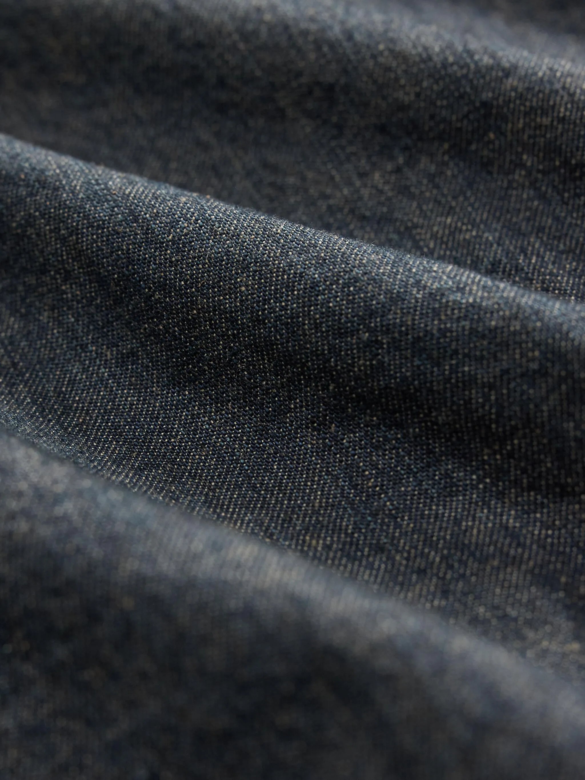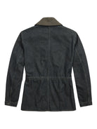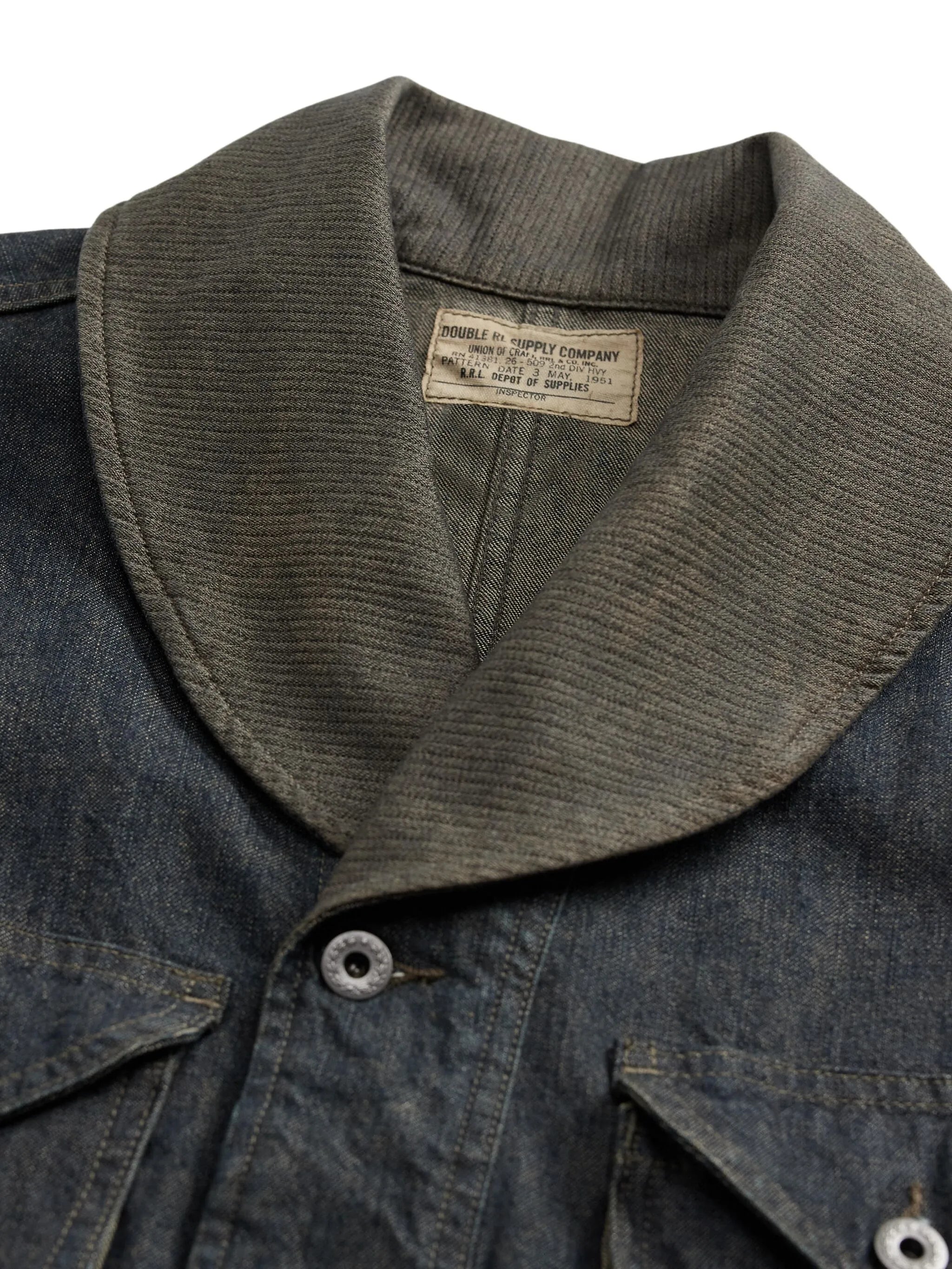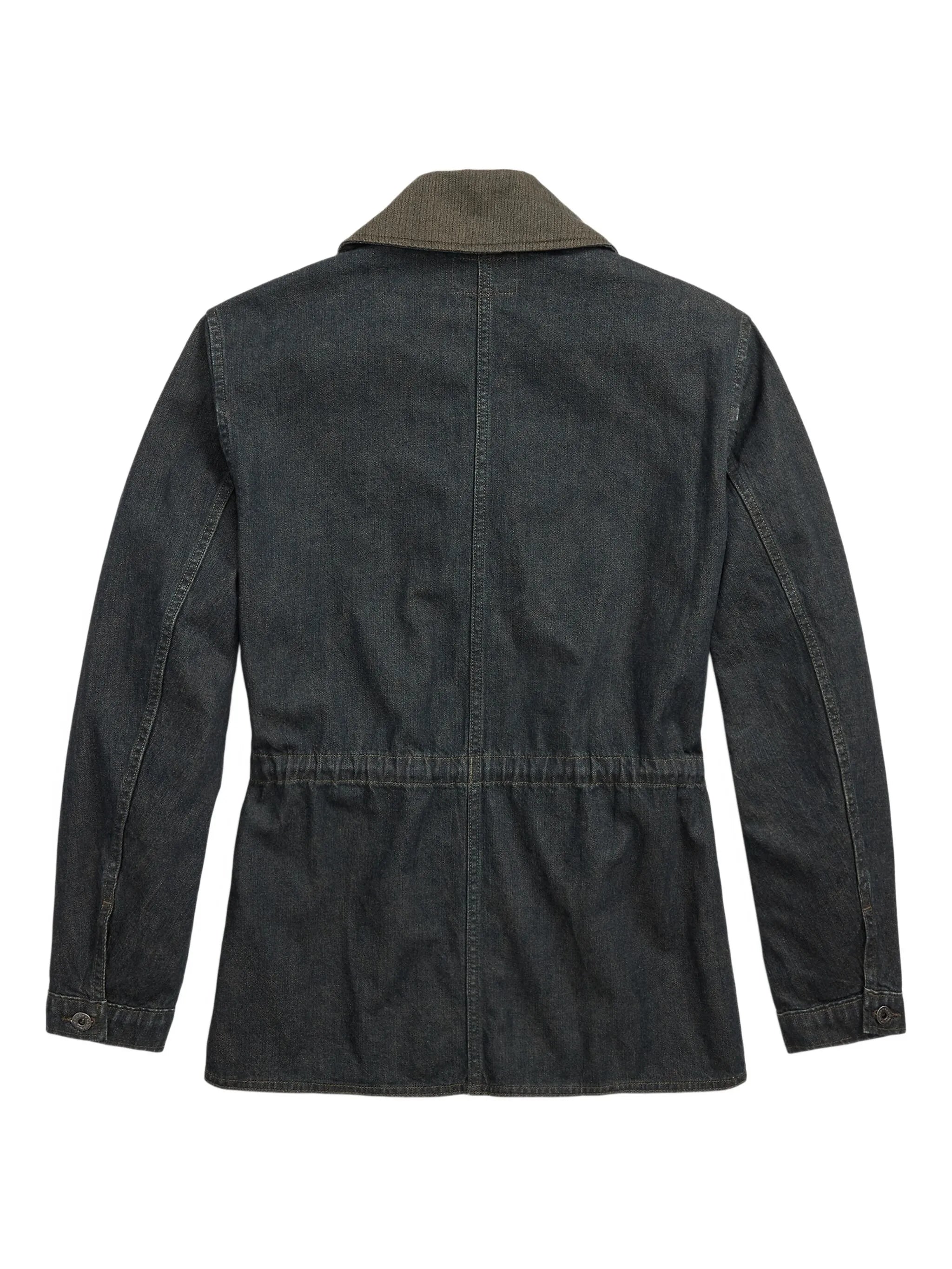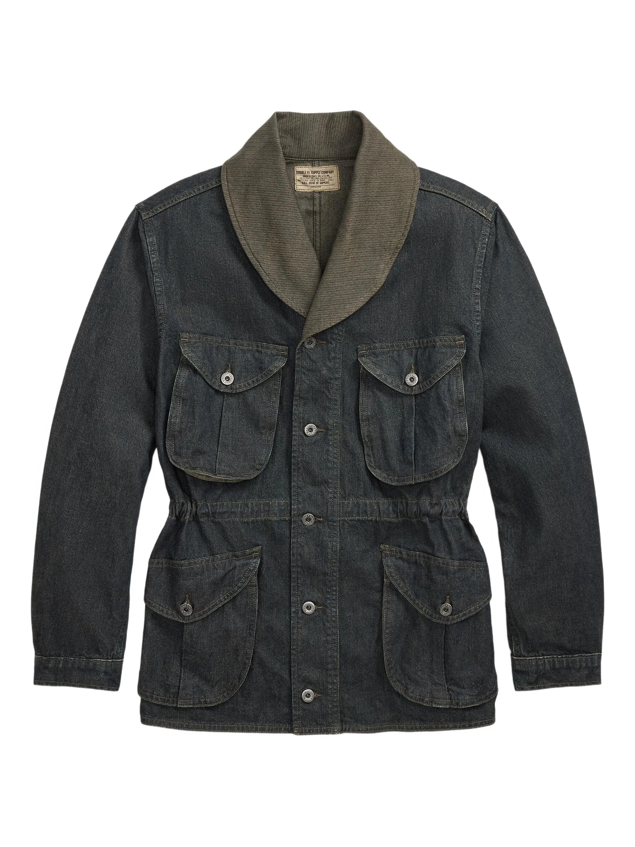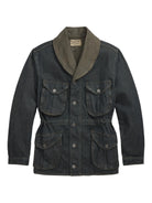 RRL’s Shawl Collar Hugo Coat in vintage indigo denim features four front flap pockets, button closure, elasticated waist, and yoke detailing, made from 100% cotton.