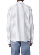 Knox Stripe Panel Shirt in white and blue by Won Hundred offers a regular fit made from 100% cotton. It features bold blue and white stripes, a sleeve panel, and two-tone reflection buttons down the front.