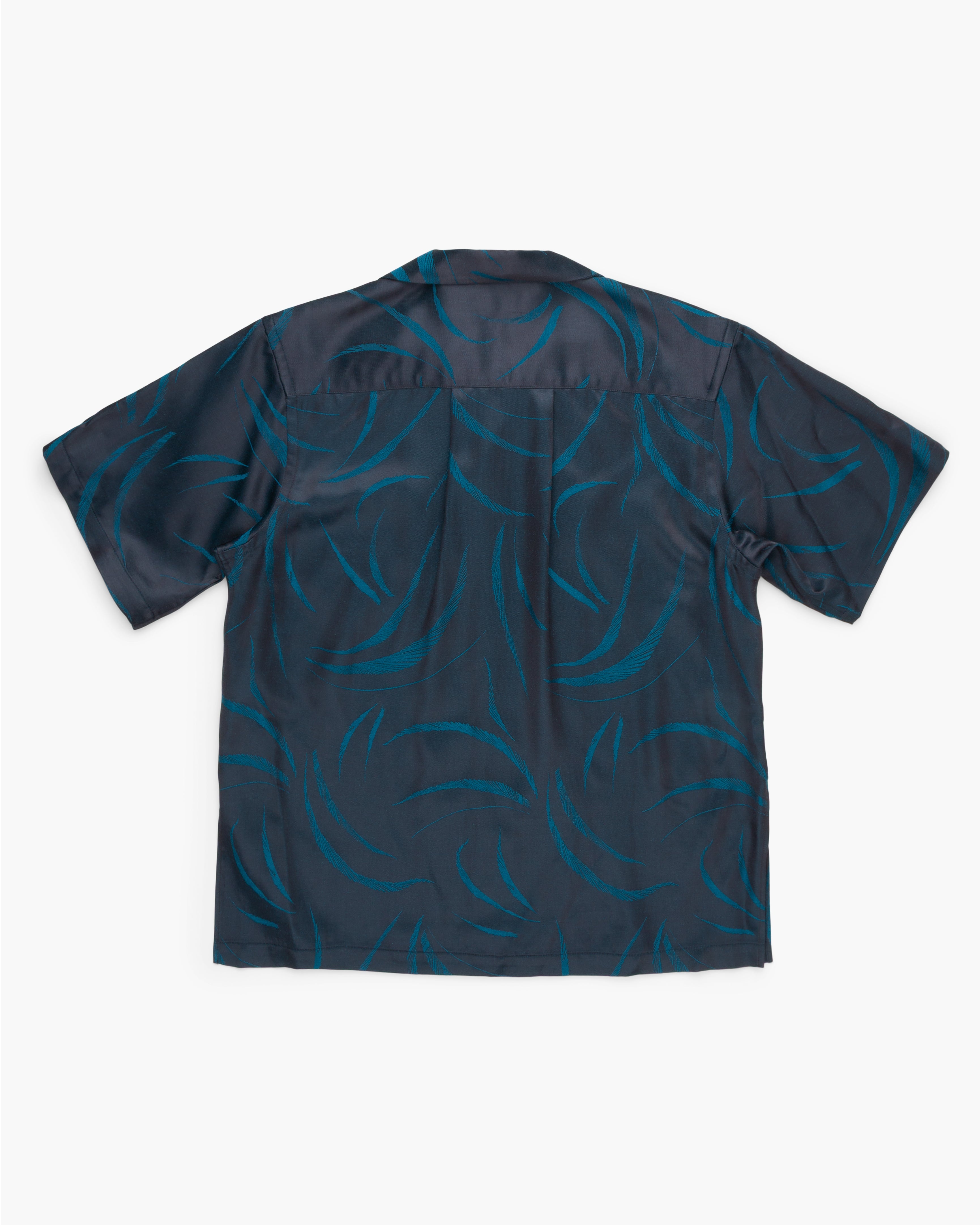 Crafted from cotton gauze fabric, this navy Mebuki Pattern Aloha Shirt by Blue Blue Japan showcases an intricate botanical print inspired by budding flora. Features a relaxed silhouette with dropped shoulders, extended sleeves, single chest pocket, and mother of pearl buttons for an effortlessly sophisticated look.