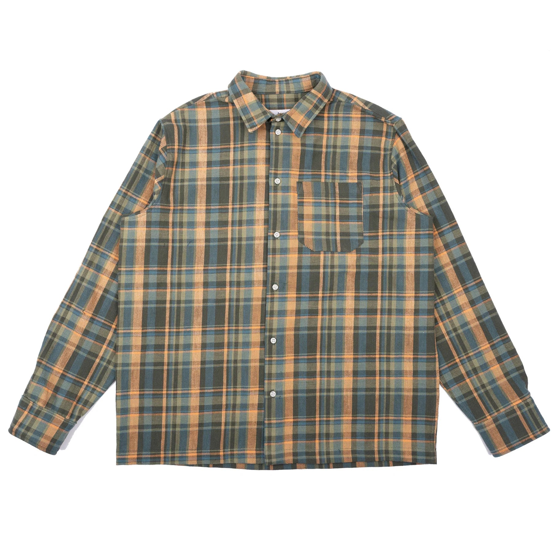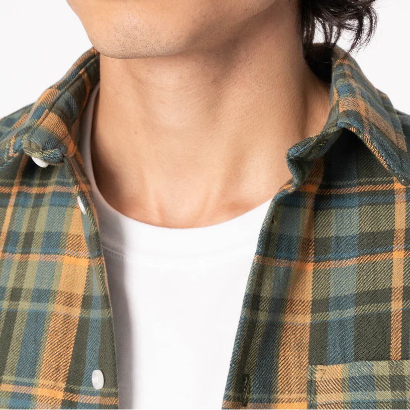 The True Shirt Slub Yarn Flannel in green by Naked & Famous is made from 7oz Japanese fabric with unique thick-and-thin yarns for a textured, soft feel. Lightweight and comfortable, this casual button-up has an easy fit and straight hem, making it perfect for layering or wearing alone.