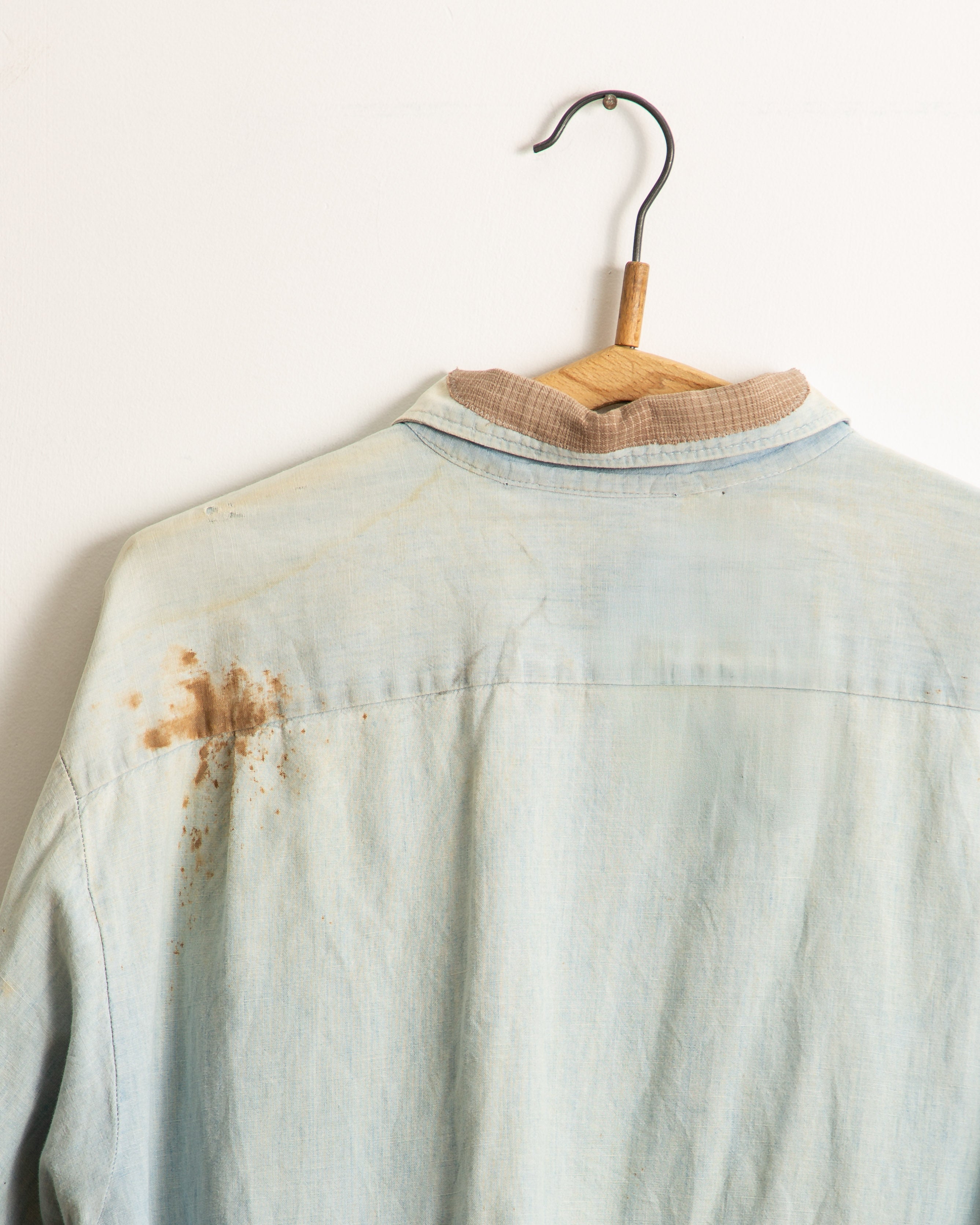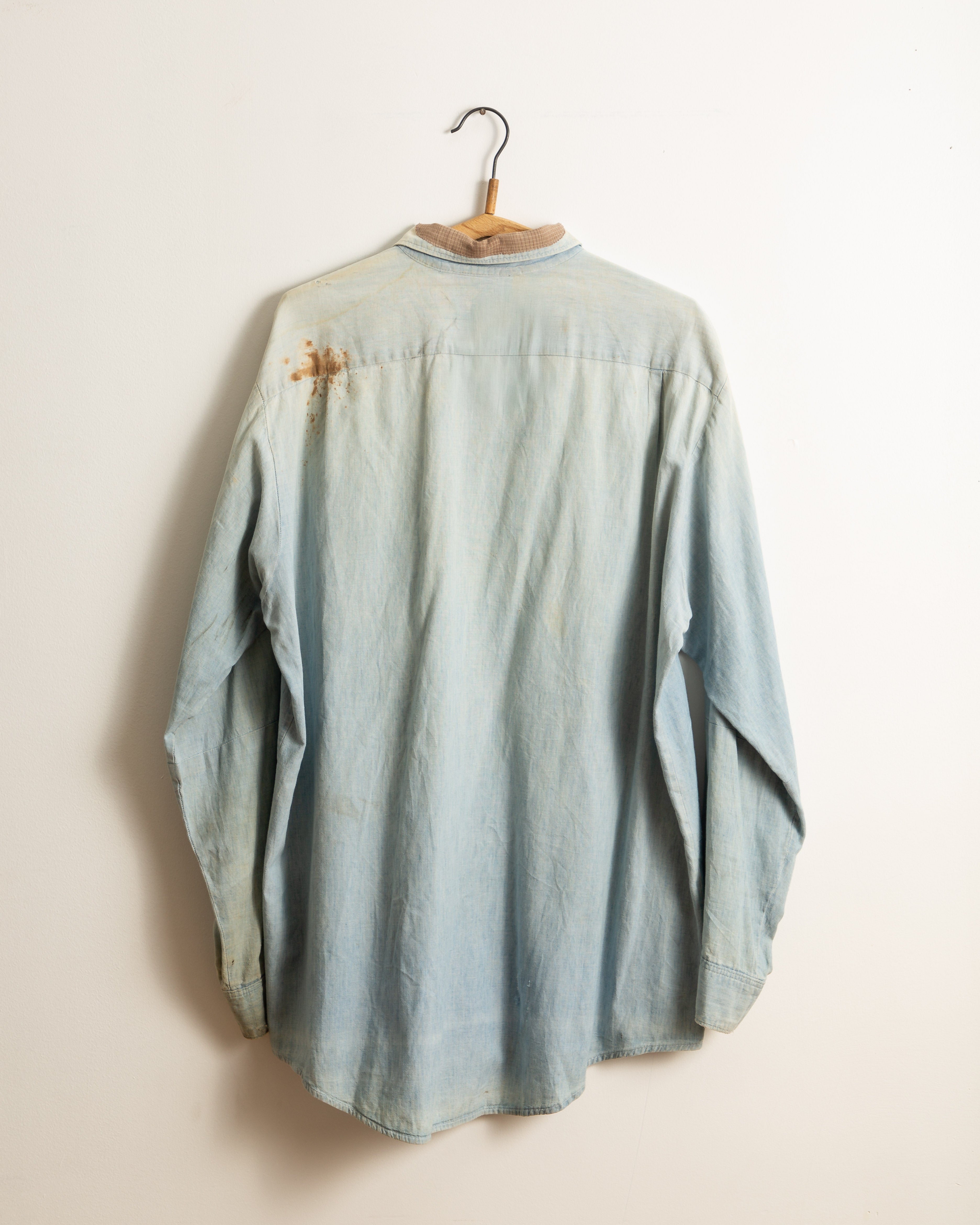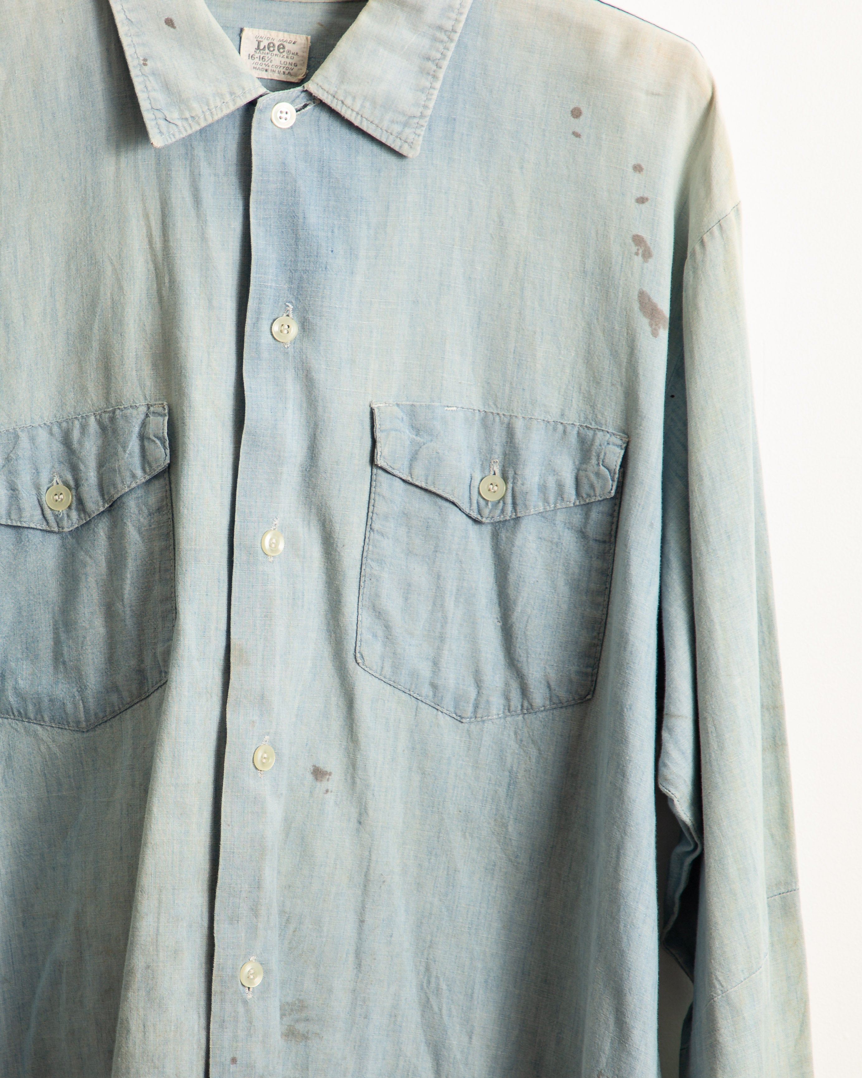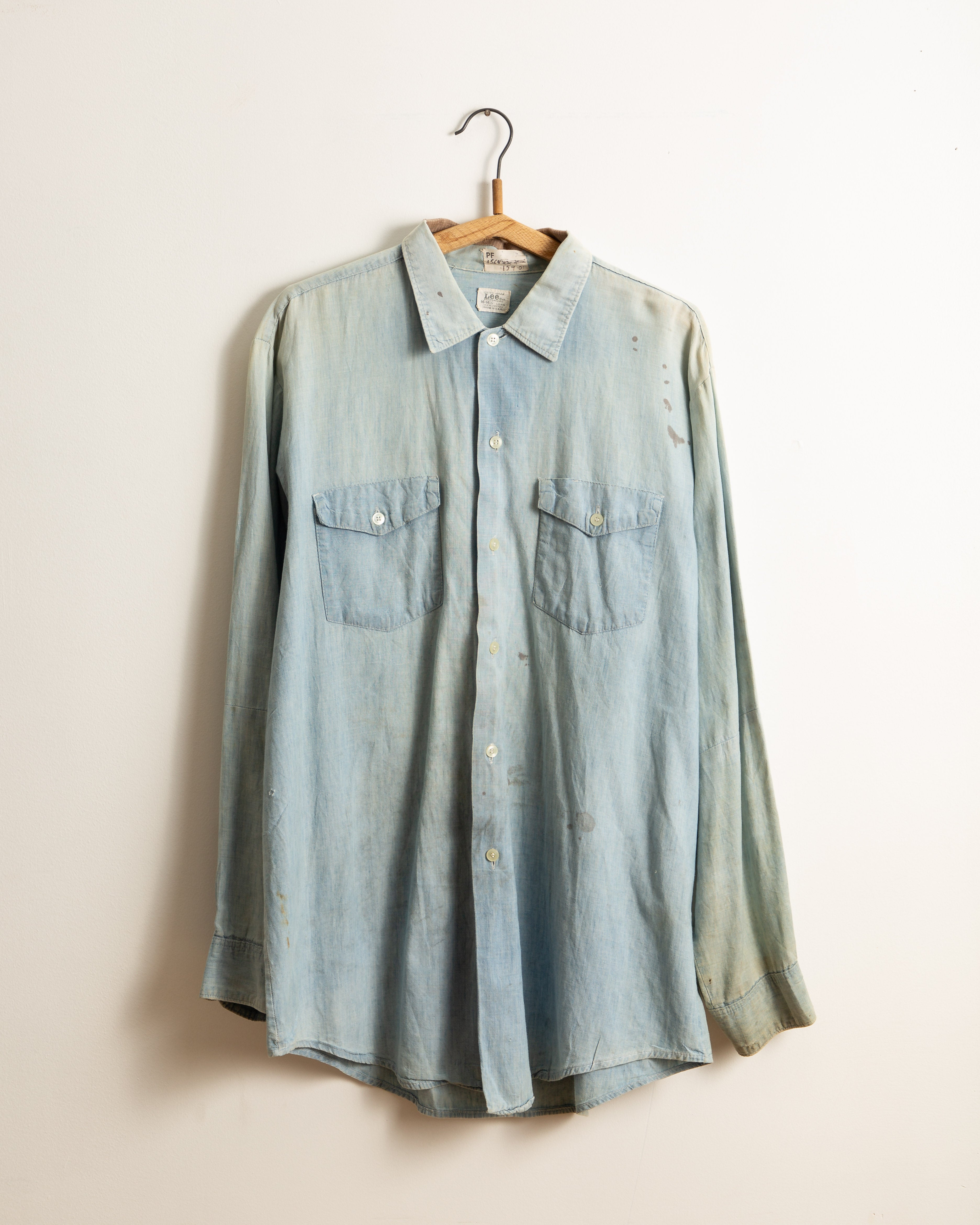 Vintage Lee Chambray Shirt in light blue, made of Sanfordized 100% cotton. Features two button flap patch pockets on the chest and may show signs of wear. Union made in the USA.