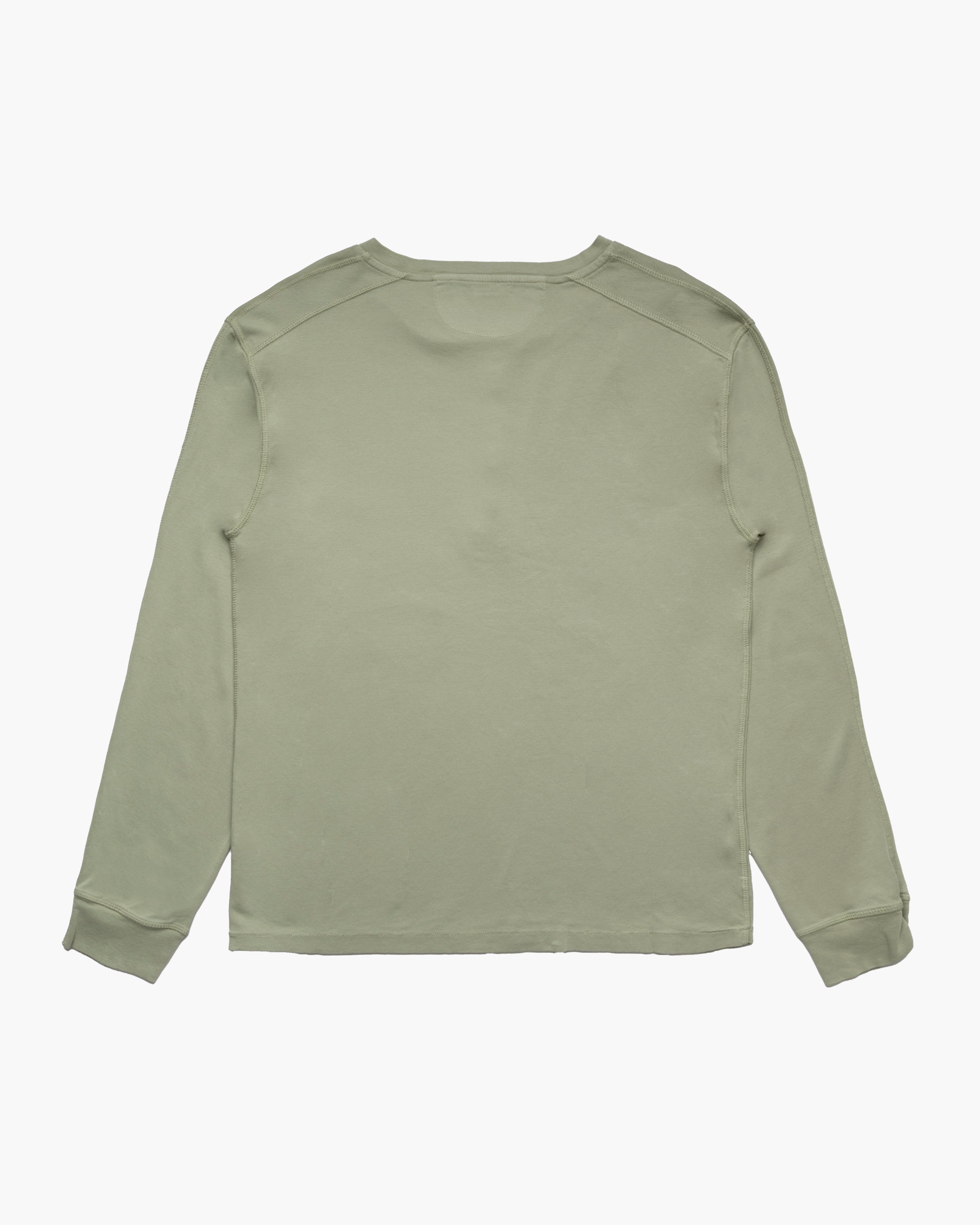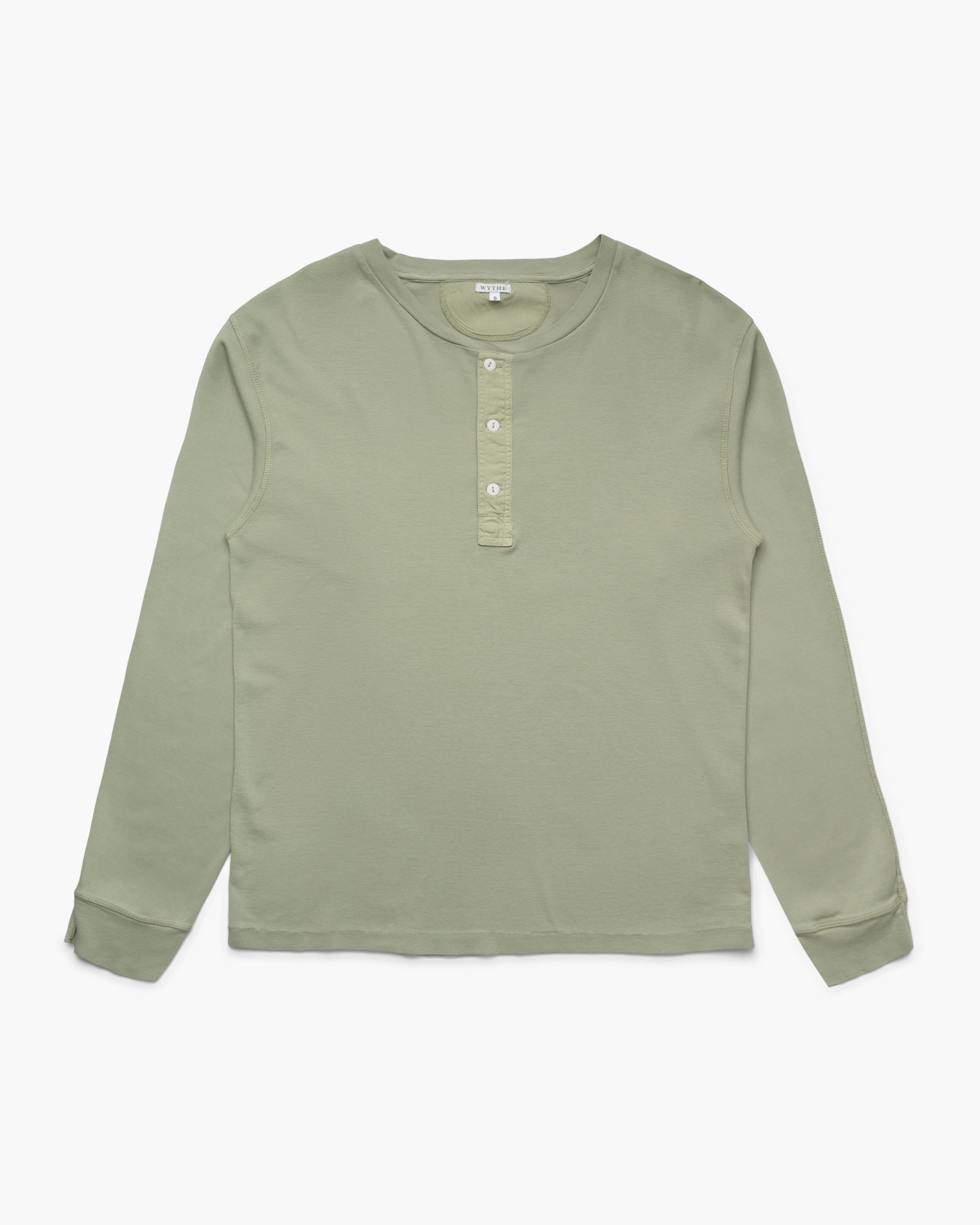 This Wythe olive cotton Henley is a versatile base layer, perfect for all seasons. With a mid-weight design, it can be worn alone or layered underneath. Featuring a 3-button placket, long sleeves, and a single needle hem.
