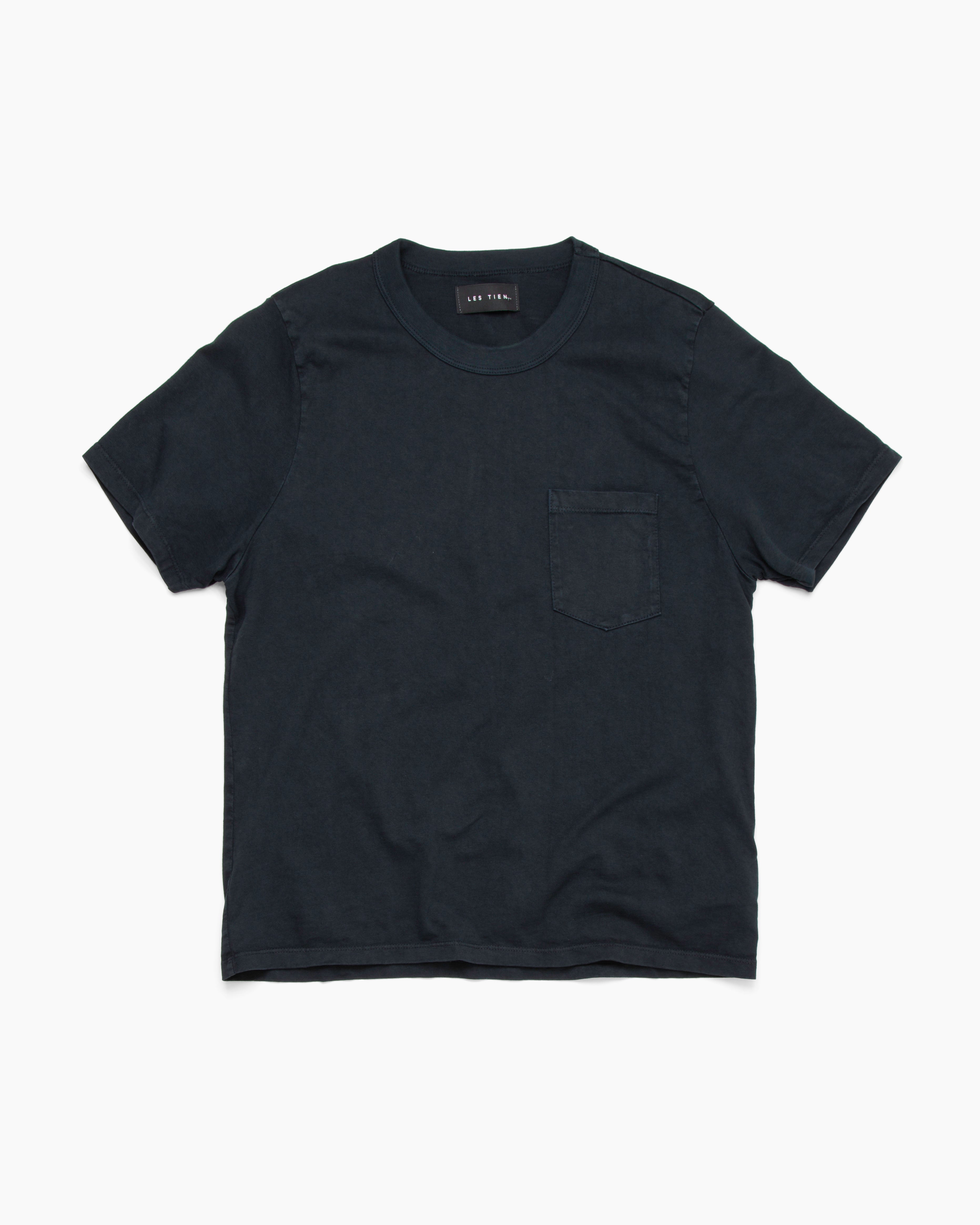 The Heavyweight Pocket Tee in faded black from Les Tien is made of 100% cotton and garment-dyed for a vintage feel. It offers a boxy silhouette, classic crew neck, and a chest patch pocket. Made in the USA.