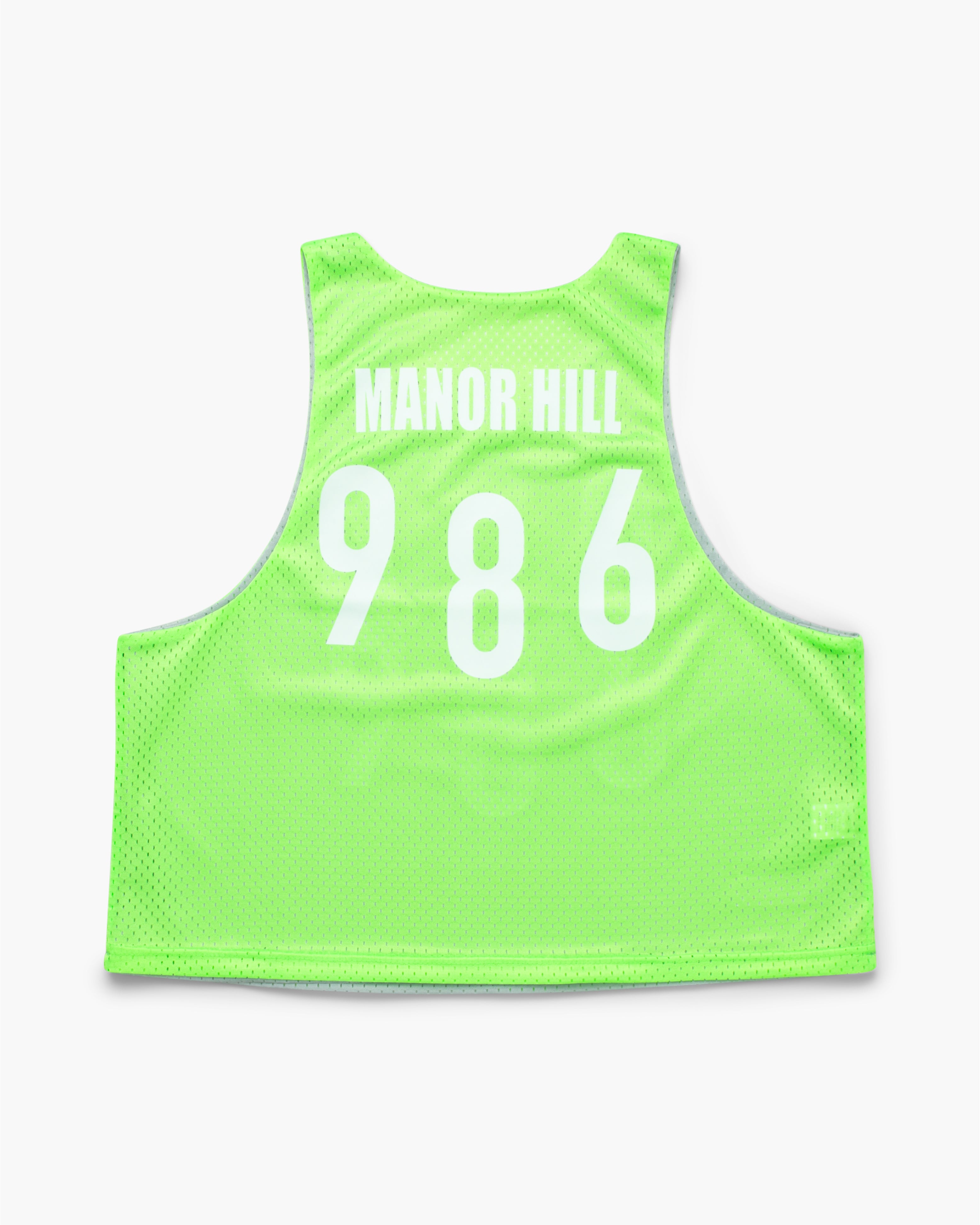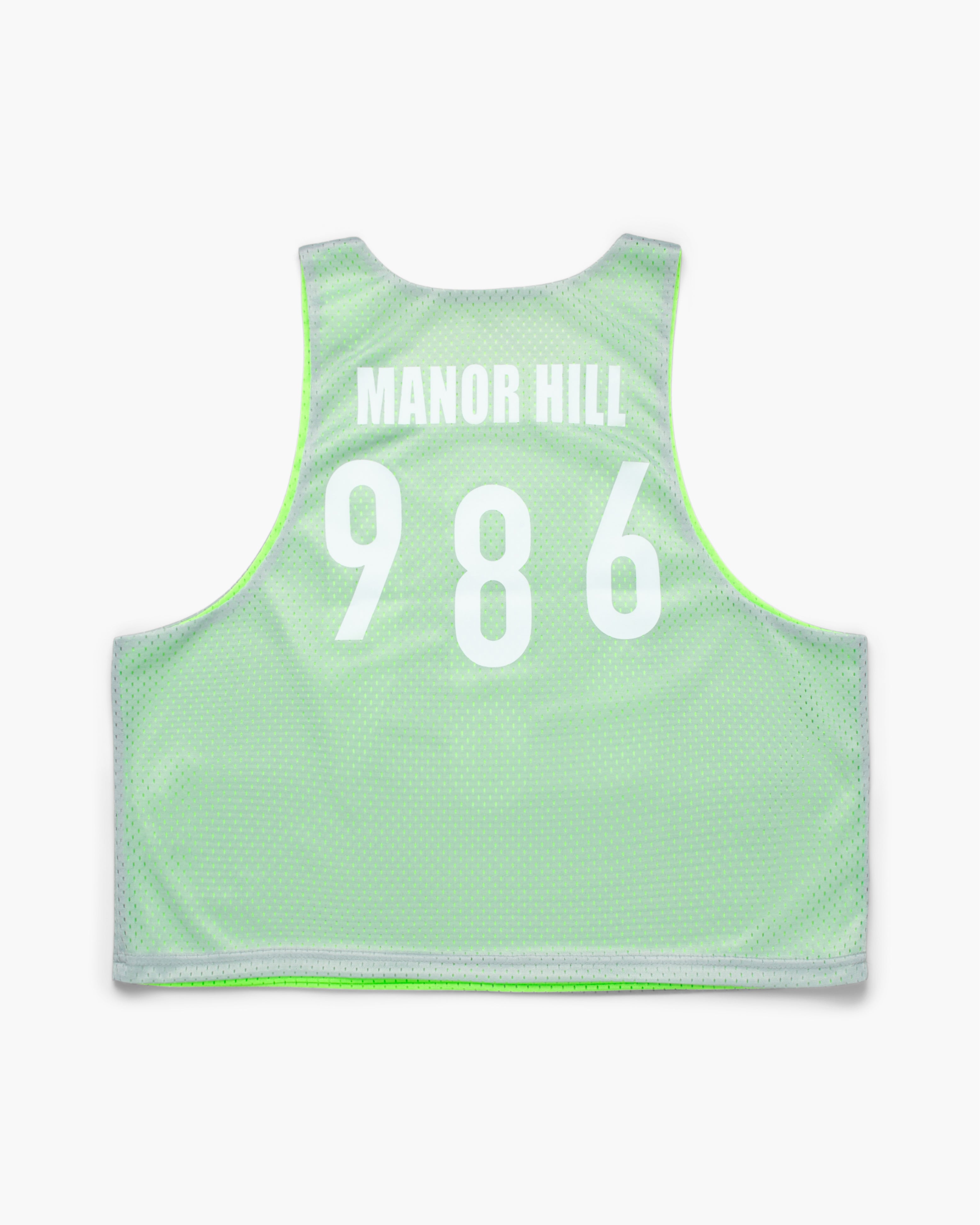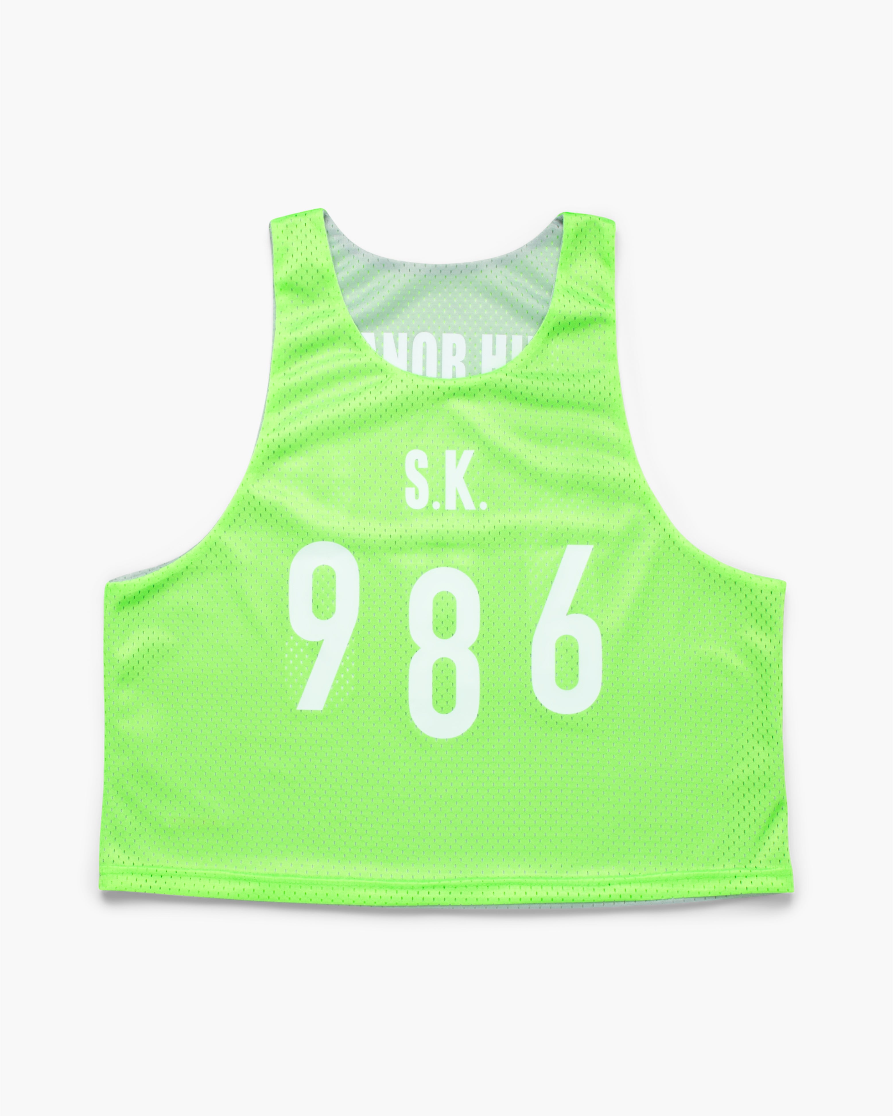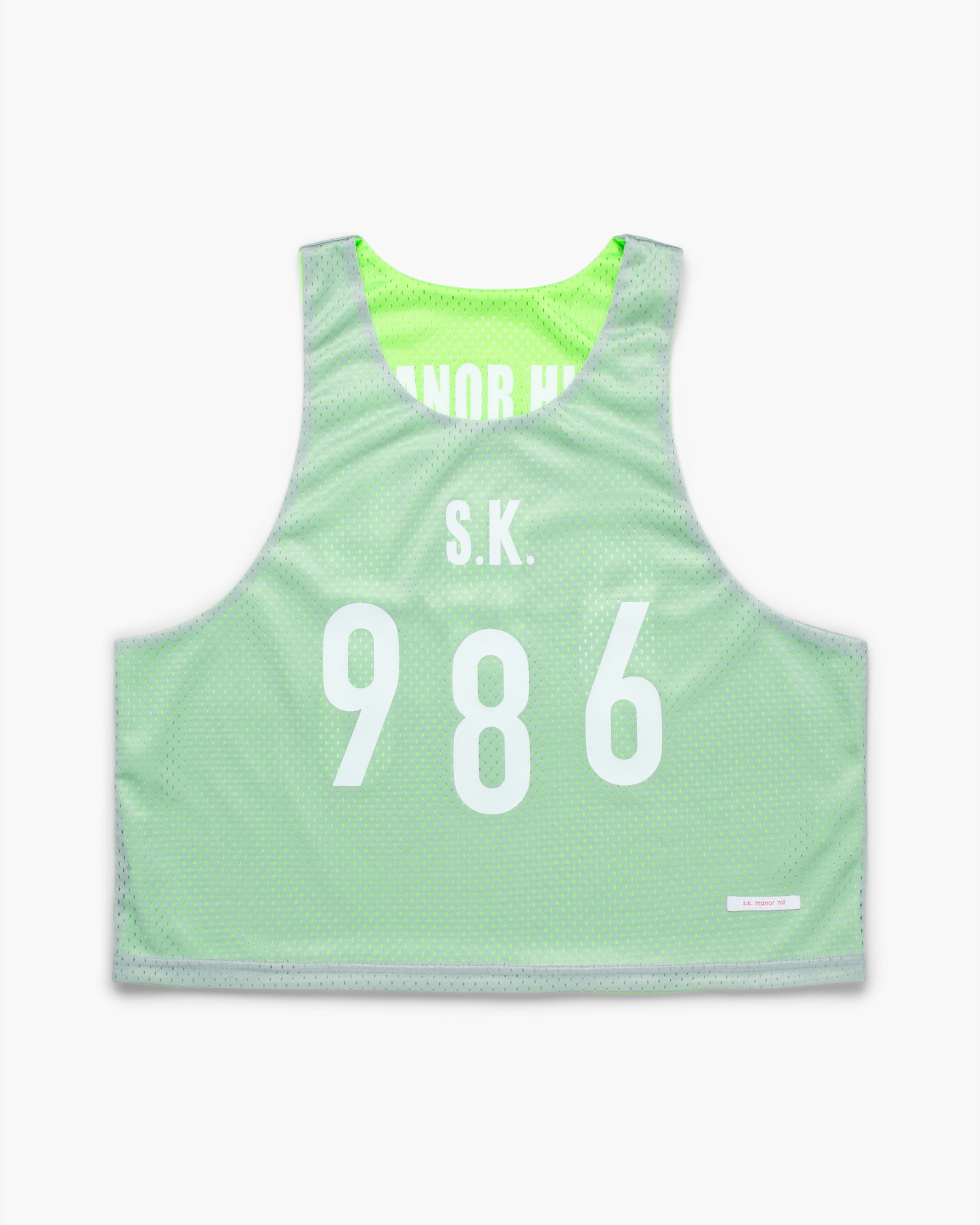 Cropped reversible jersey in grey and neon green mesh by S.K. Manor Hill. Features graphics and is 100% Polyester. Made in USA (New York Garment District).