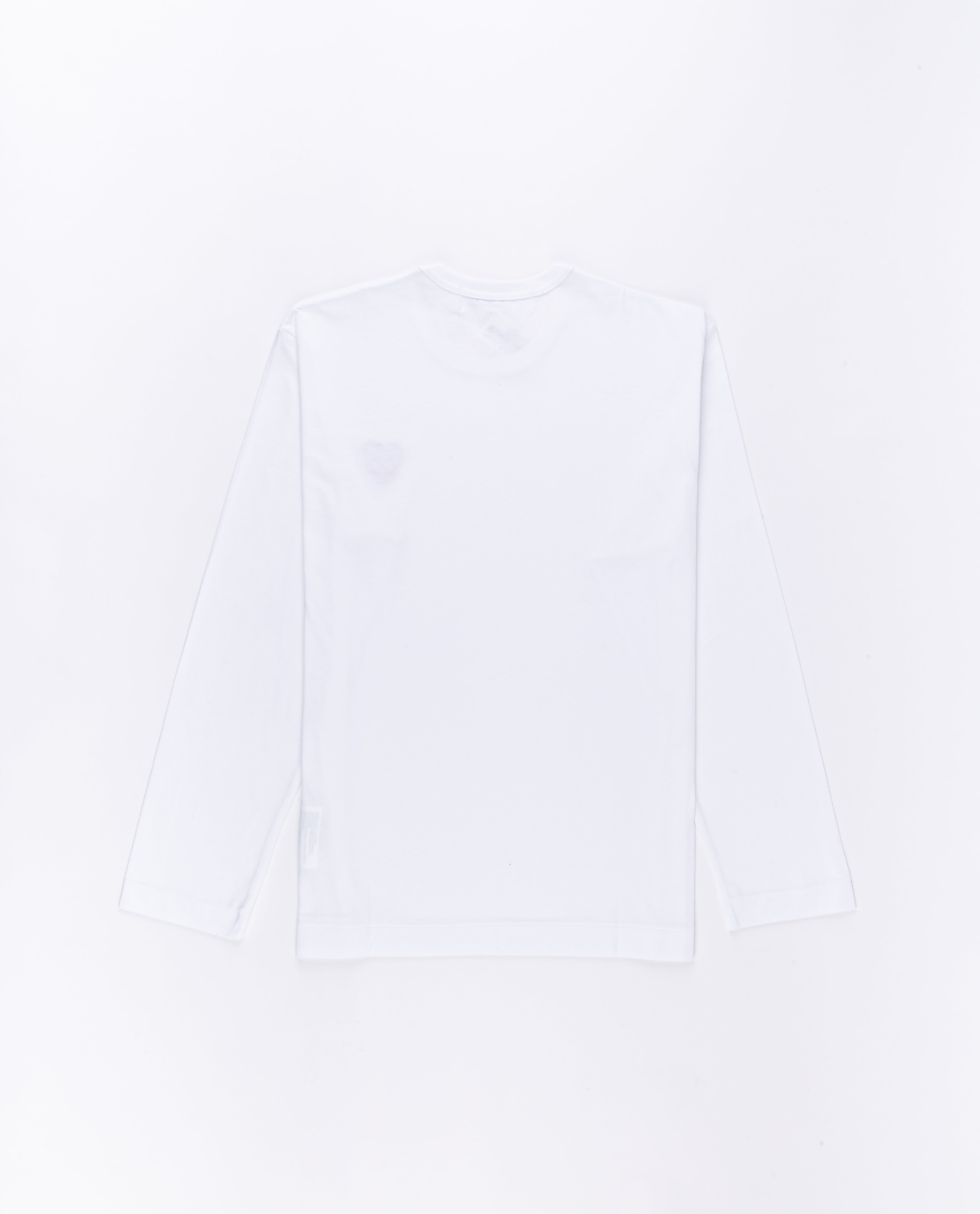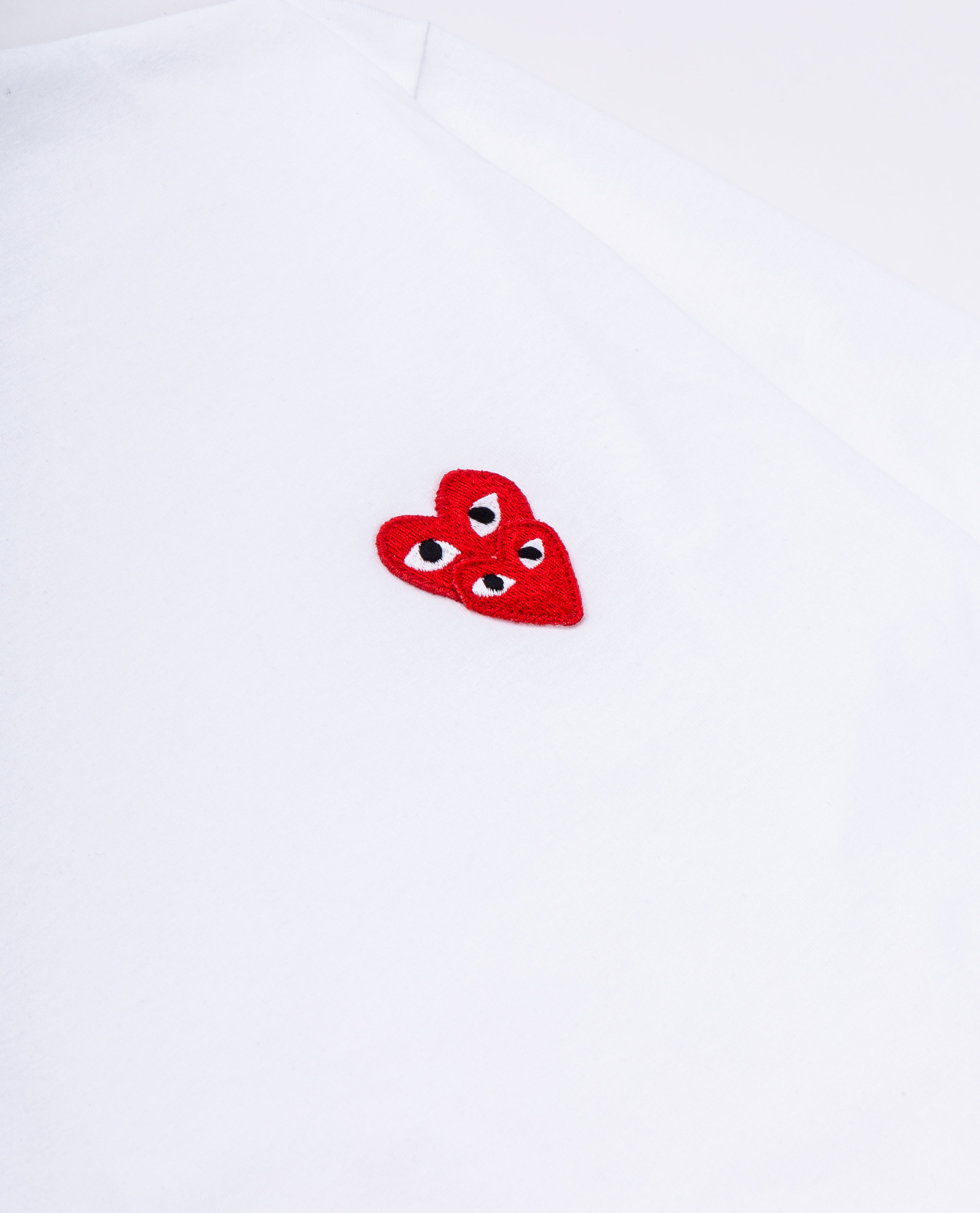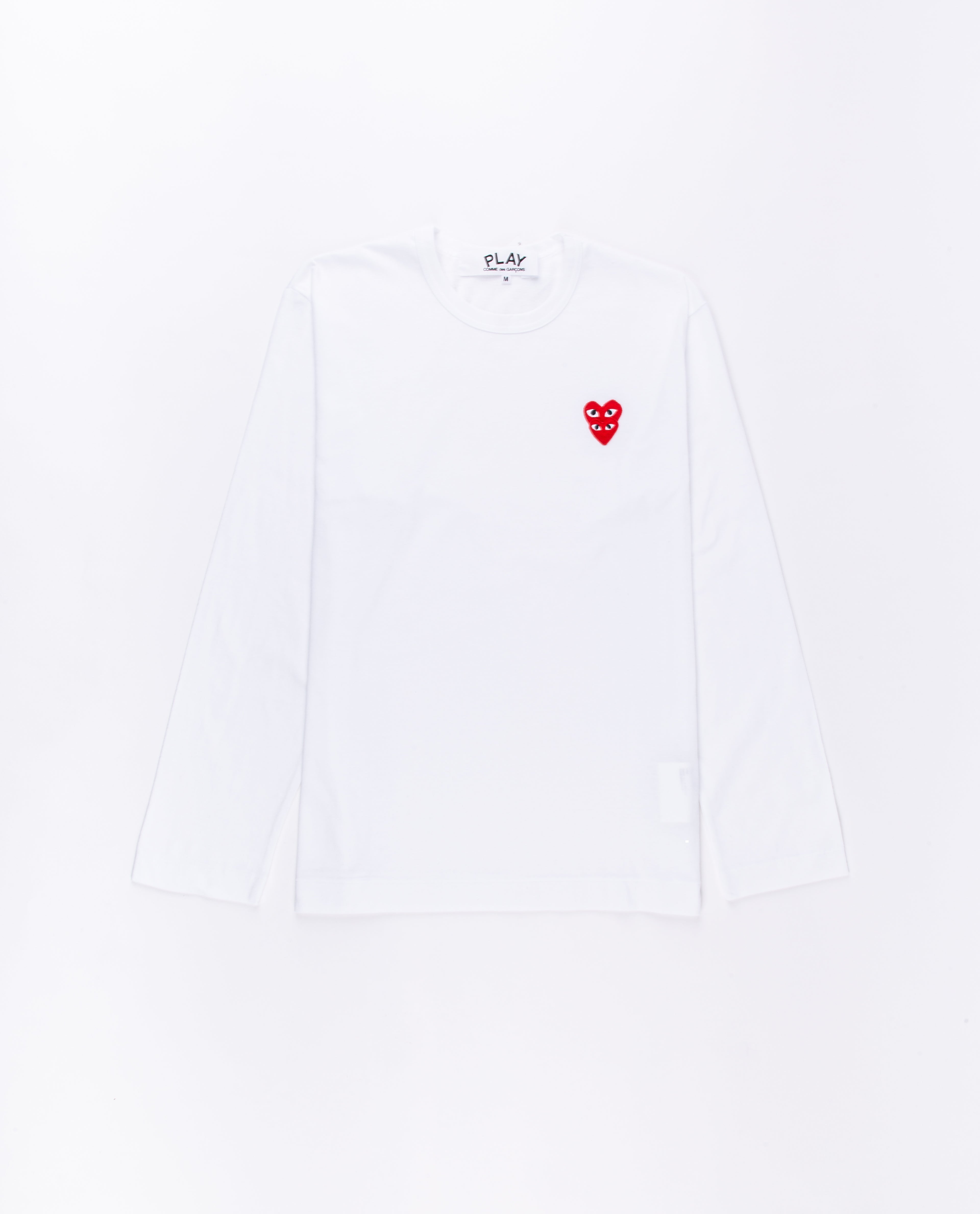 White Long Sleeve Red Heart Tee in white by Comme des Garçons Play. A long-sleeved crew neck t-shirt featuring the iconic appliqué red heart.