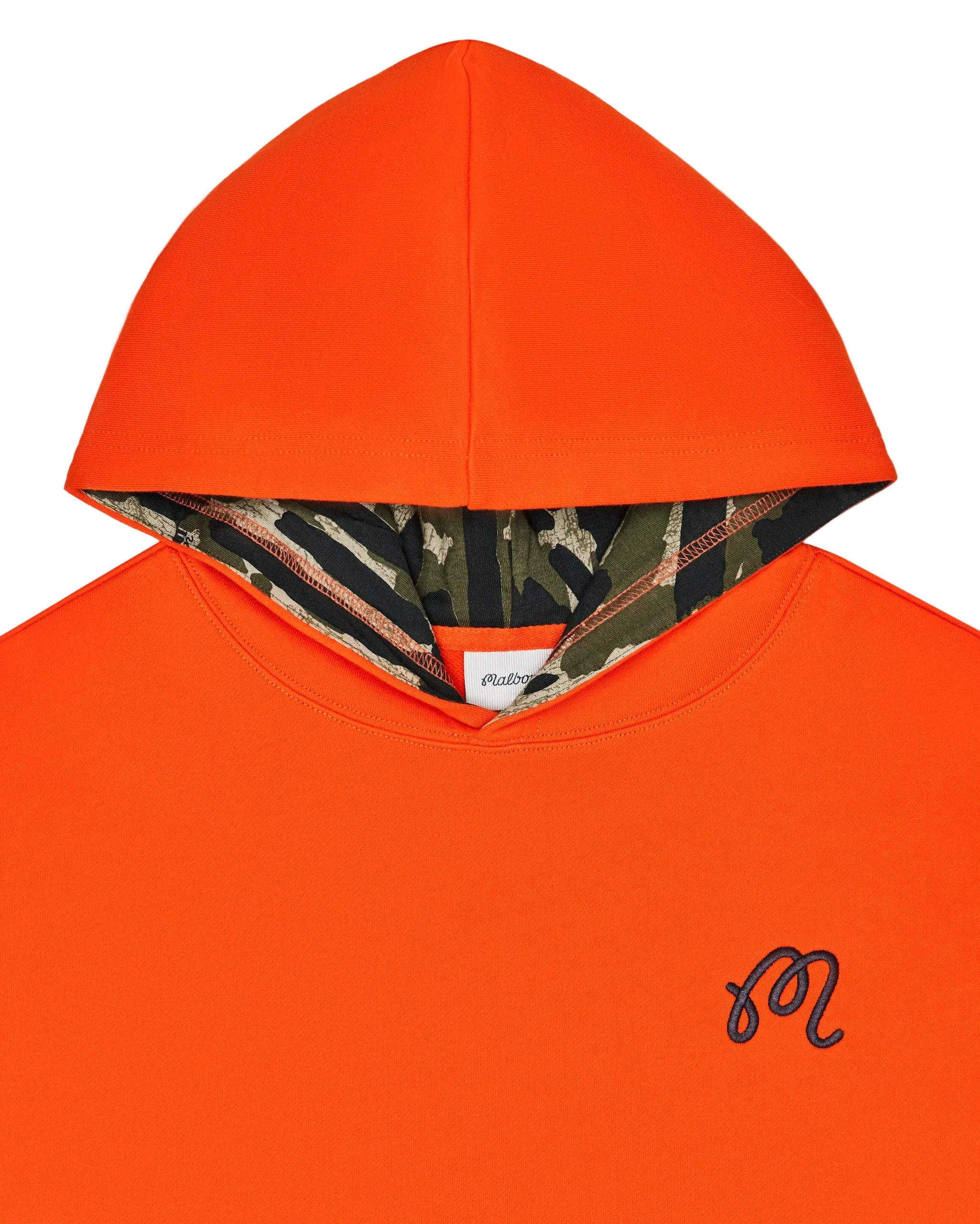 Fesque Tour Divot Camo Hoodie by Malbon combines 100% cotton fleece with a camo-lined hood for versatile comfort. Featuring a relaxed fit, front kangaroo pocket, and ribbed waist and cuffs, it showcases embroidered and printed Malbon branding. An essential piece for casual wear.