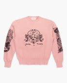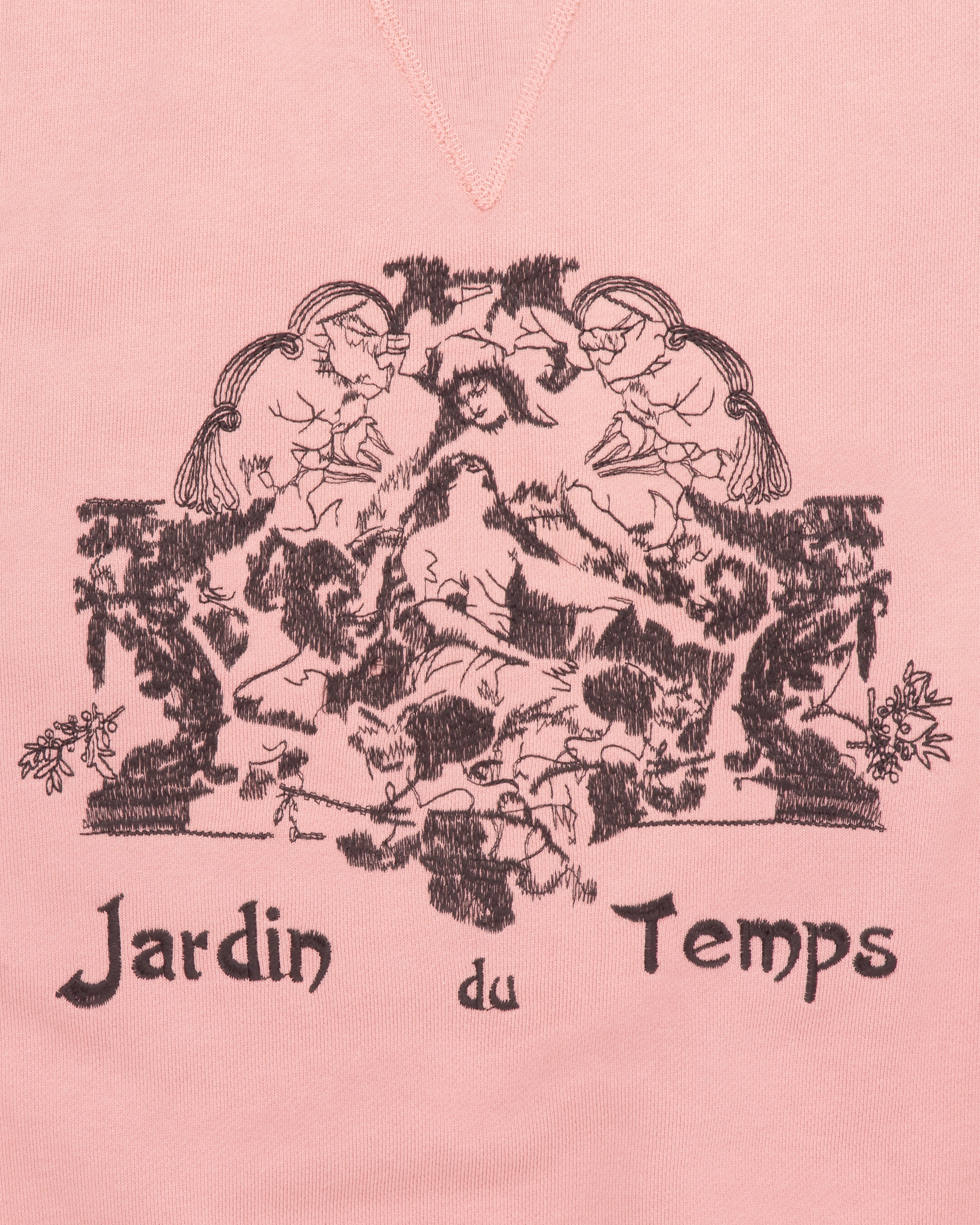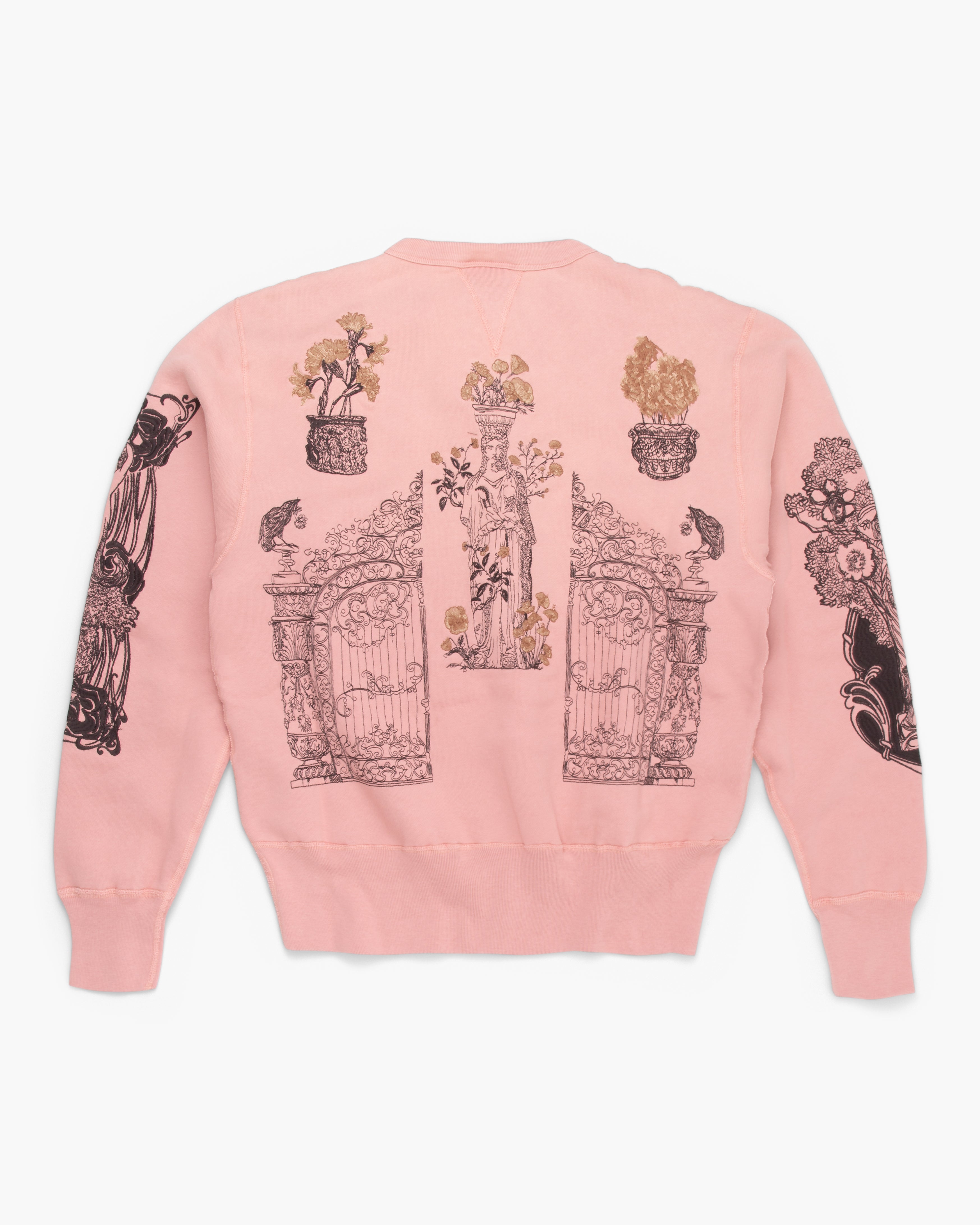 The Jardin Crew sweatshirt in pink by Samuel Zelig features 5 oz heavyweight cotton French terry and a 1" neck rib with 3/16" coverstitch. It includes classic double V rib detailing at front and back neck, standard set-in sleeves, and flatlock seam construction. This garment is vintage washed and dyed to prevent shrinkage and provide a unique sun-faded appearance. Made of dusty rose French terry with matching rib and multicolor embroidery.
