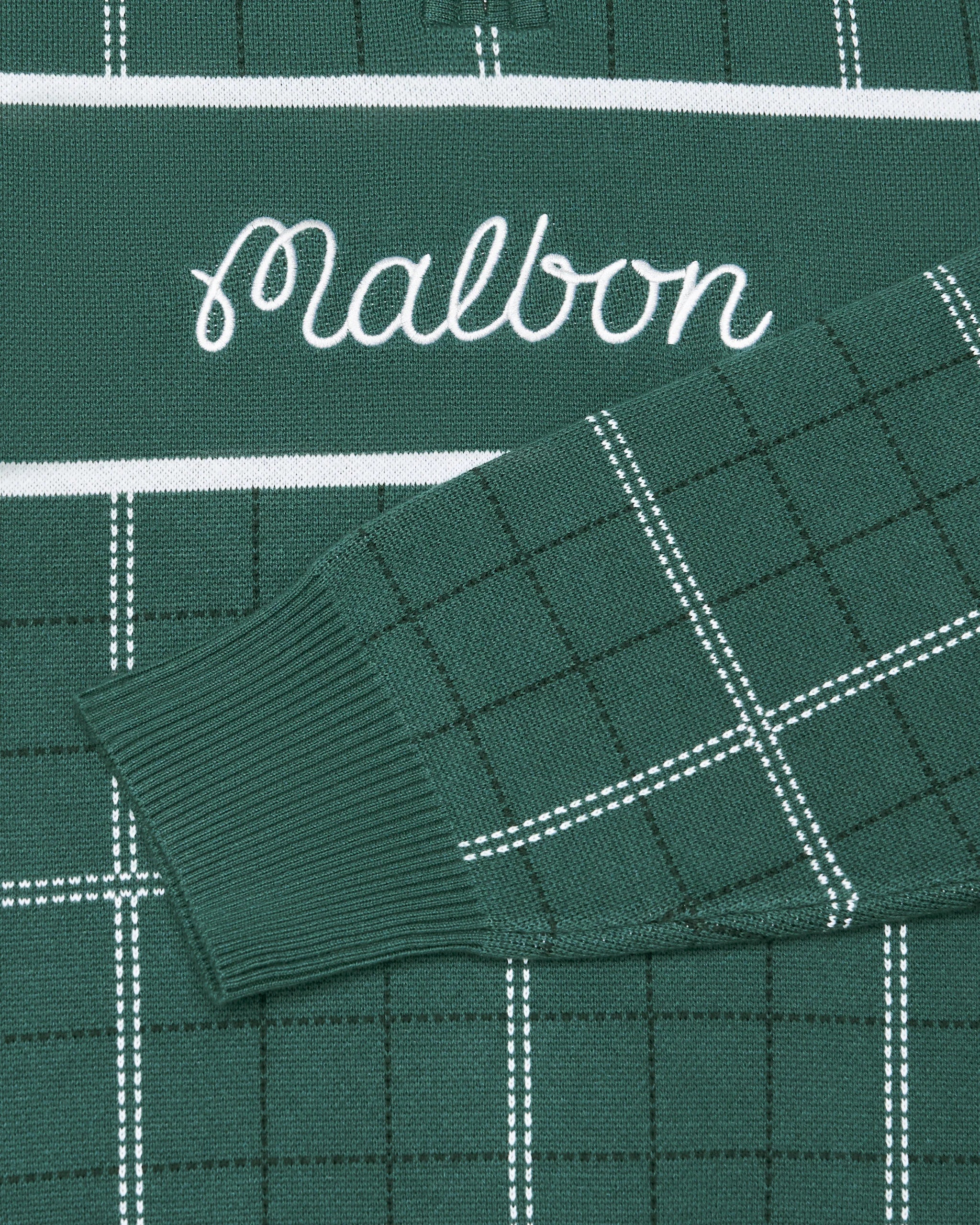 Bennet Plaid Sweater in soft cotton knit with a relaxed fit. Features an embroidered M script logo on the back and Malbon branding on the front, with festive holly leaf details. Ribbed collar, cuffs, and waist for a polished finish.