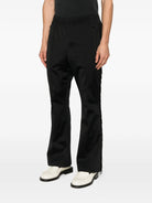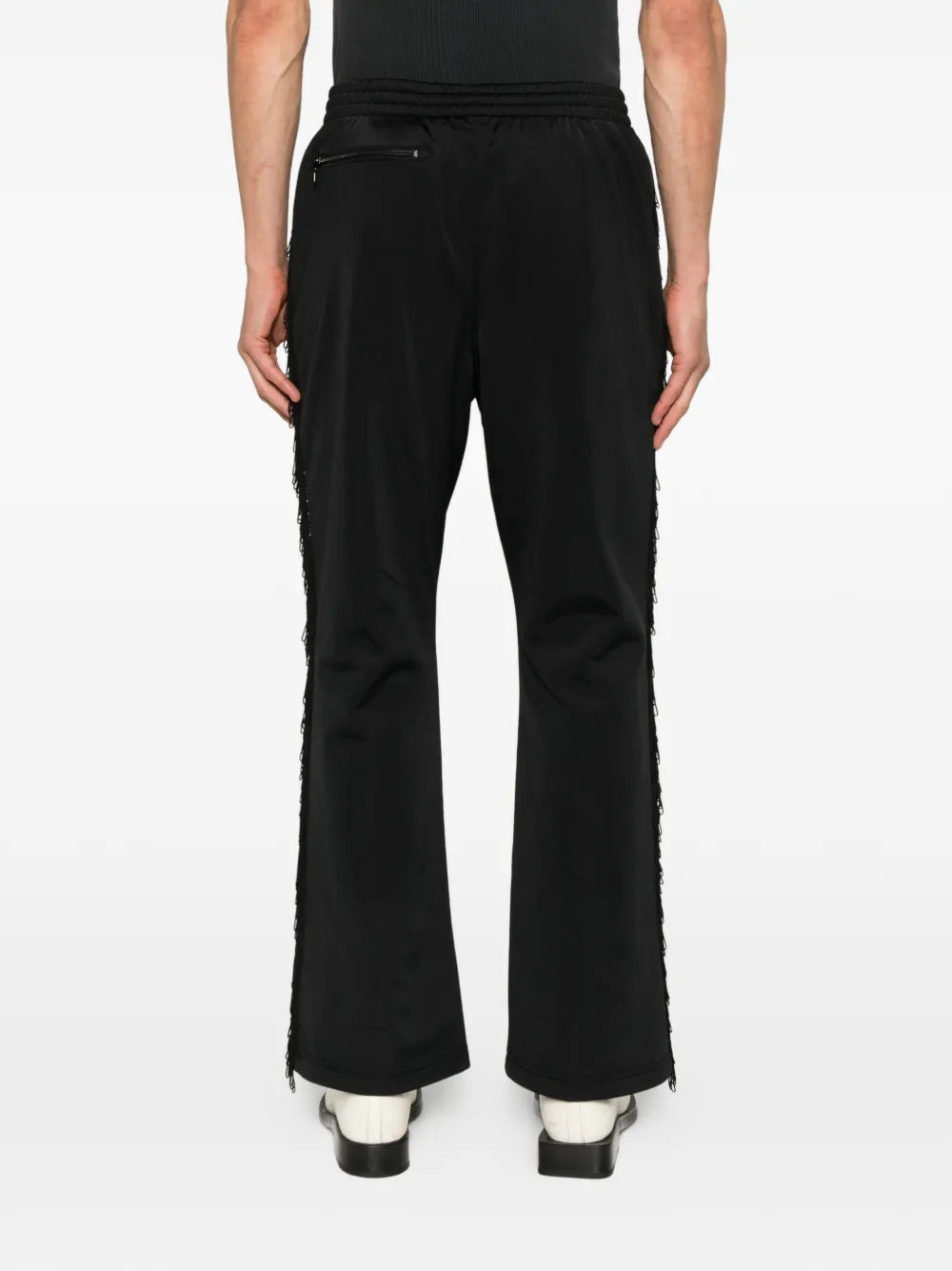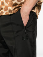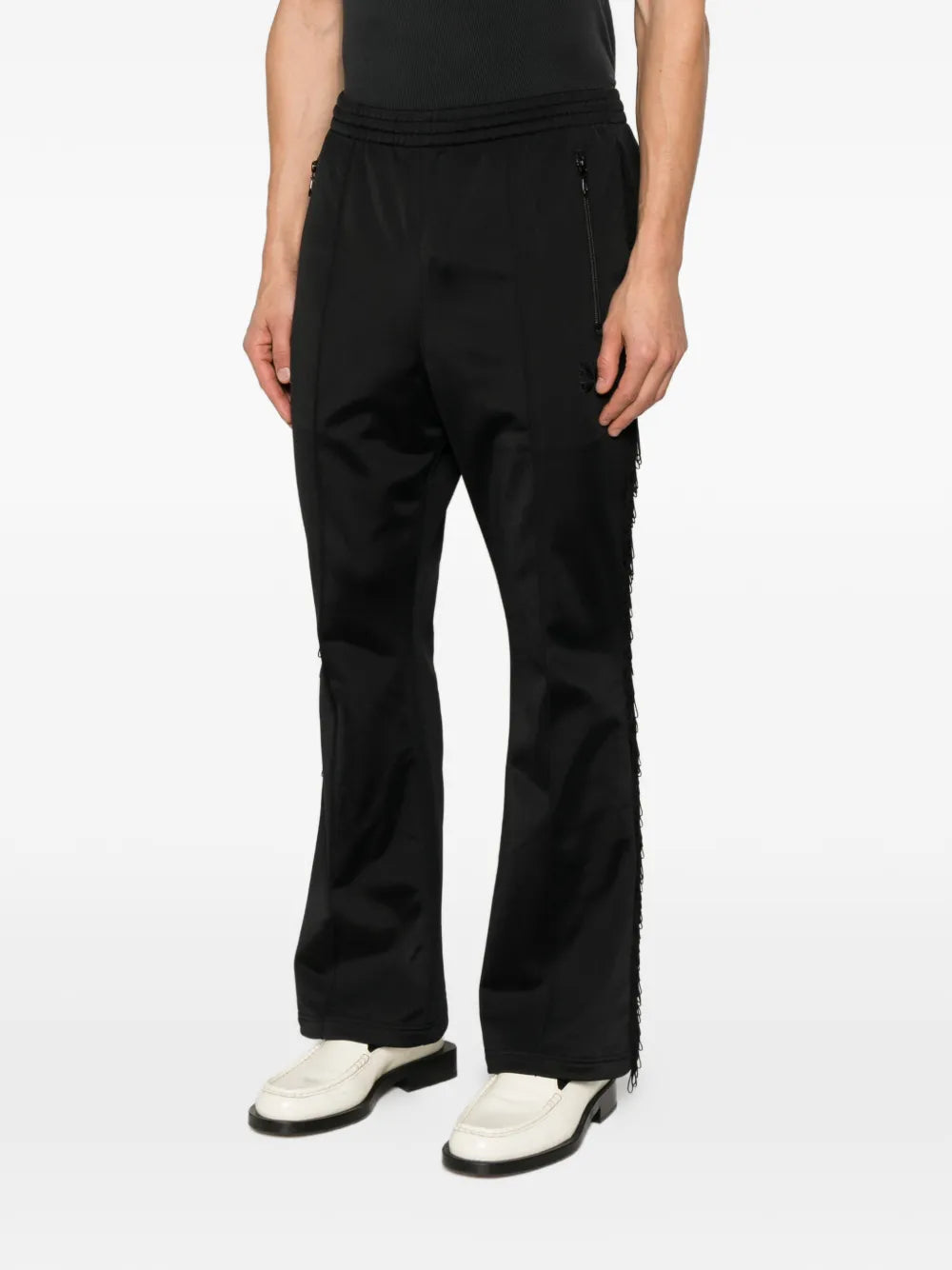 Black track pants by Needles with distinctive side zip openings, fringed edges, and a Papillion logo patch. Elastic waistband and contrasting side stripes complete the athletic-inspired silhouette.
