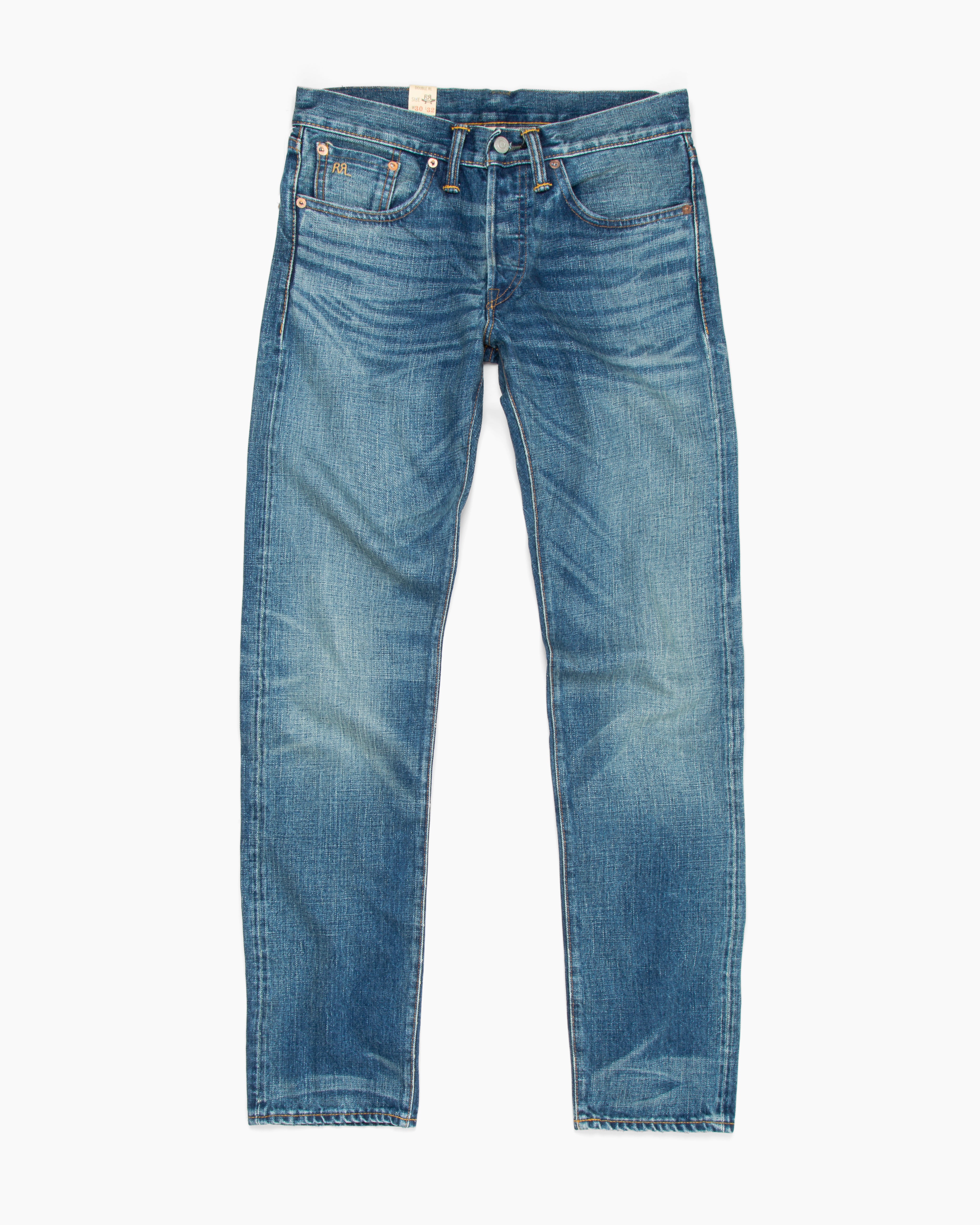 The Slim Fit Selvedge Jean in Hillsview blue wash by RRL features vintage-inspired fading and whiskering, a classic 5-pocket layout, and a slim straight leg silhouette. Crafted from shuttle-woven 100% cotton denim, this jean is made in the USA.
