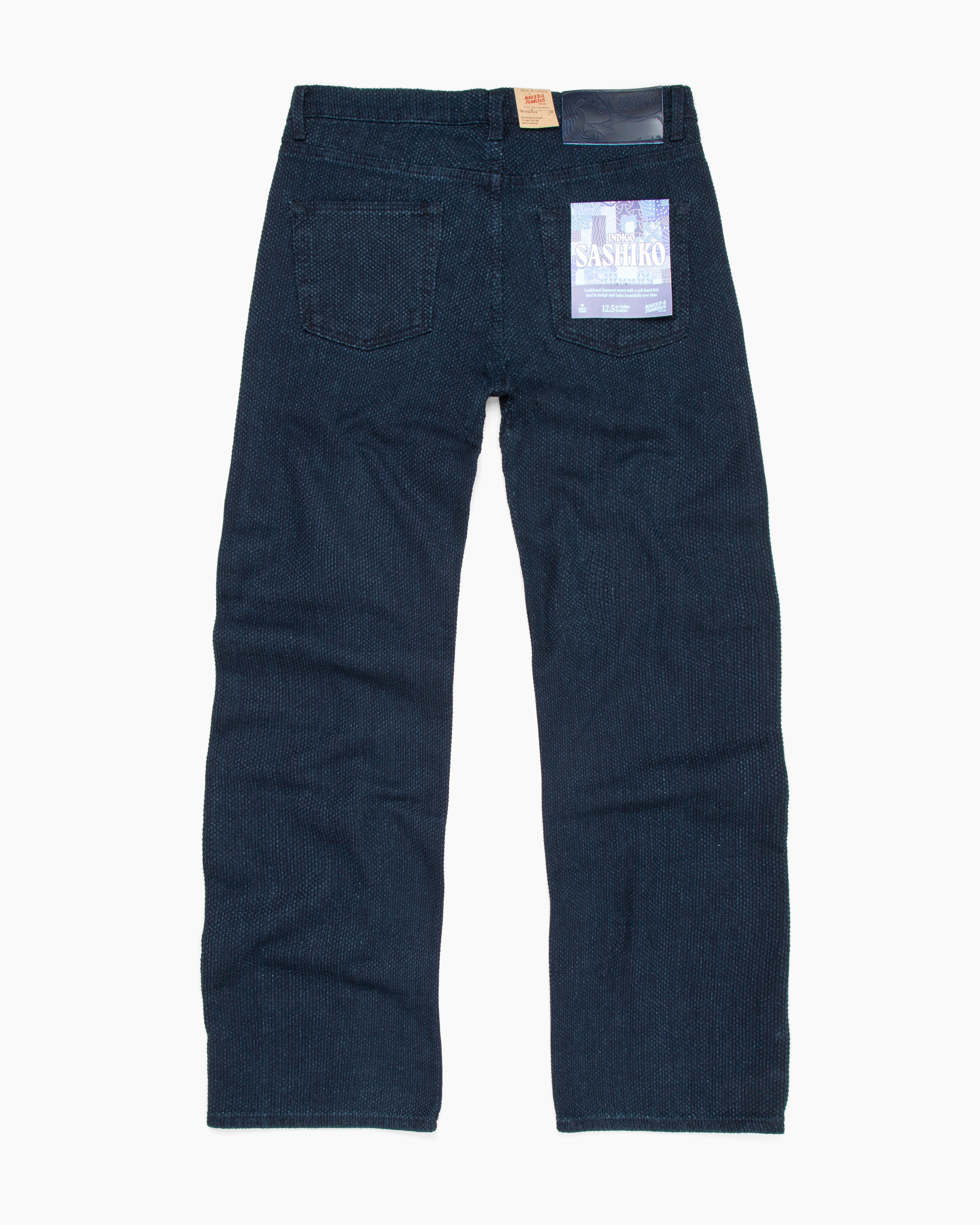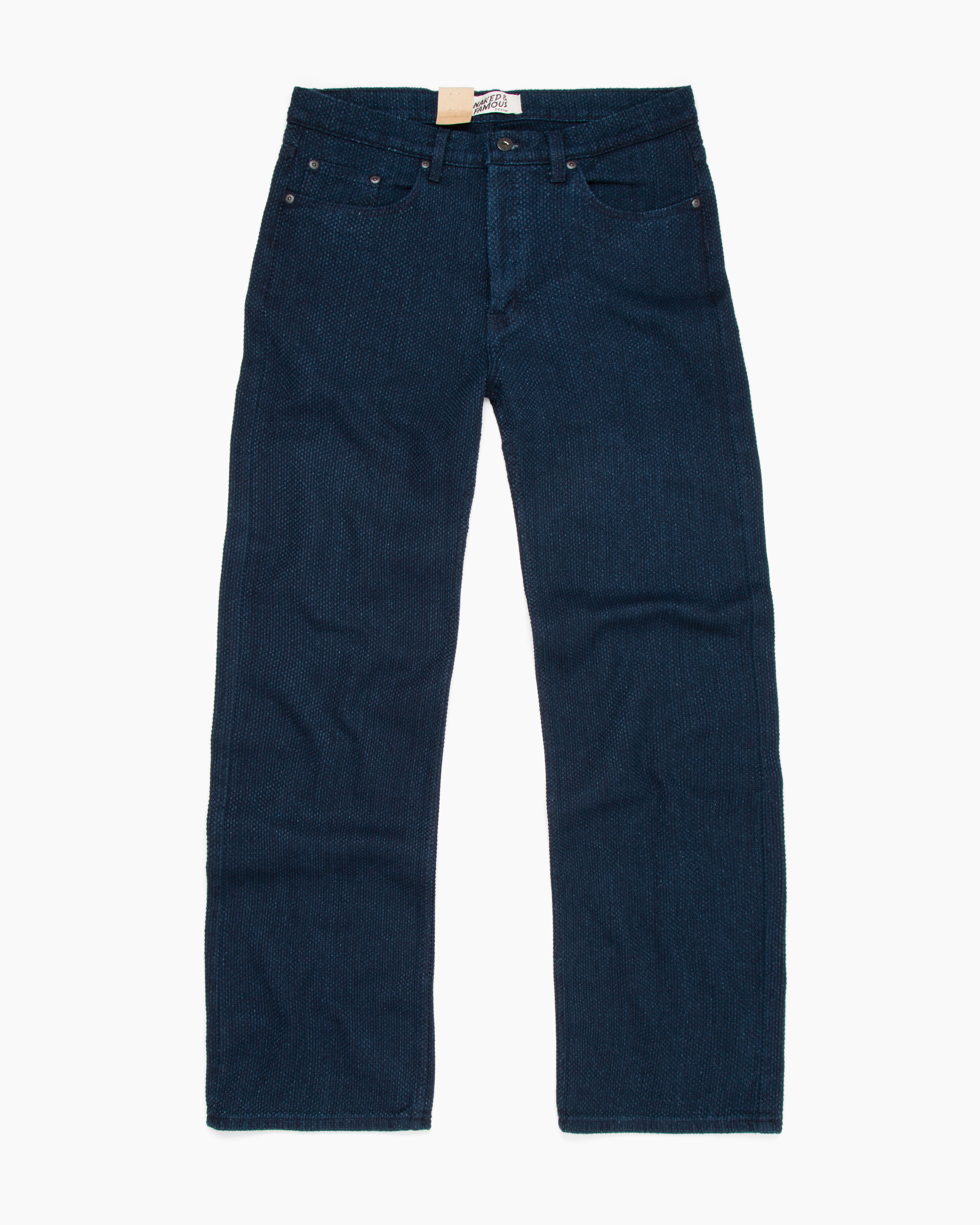 Strong Guy Indigo Sashiko by Naked & Famous features a 12.5oz indigo rope-dyed Japanese twill with a raised running stitch pattern inspired by Judo uniforms. This textured fabric offers a unique fade as the stitches wear differently from the base. Woven on a jacquard loom from 100% cotton, it feels soft and durable. Made in Canada, the jeans include tonal stitching, a button fly, black matte hardware, and a deep navy leather patch.