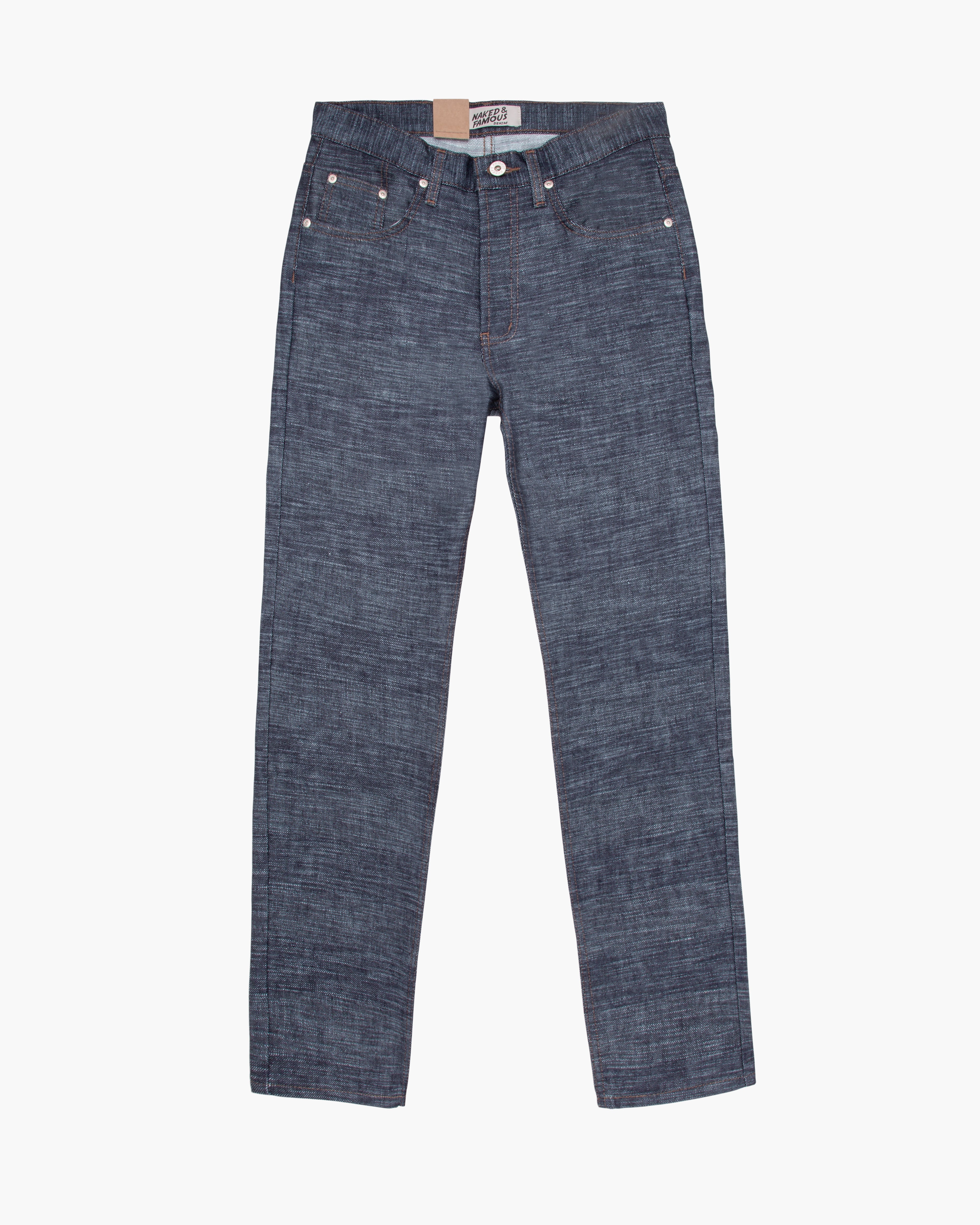 Easy Guy Revival Frankenstein Denim Jean in indigo by Naked & Famous. Crafted from 14oz Japanese denim with a unique and alternating twill pattern. As the name suggests, this denim is a mishmash of construction details, with sections of left-hand and right-hand twill alternating every 2 inches throughout the fabric. This results in a dynamic texture that will enhance over time due to the lack of anti-skewing finishing process. The denim also features a mix of thick and thin slub yarns, creating a stunning spectrum of indigo hues as it ages. Made from 100% cotton, these jeans have a classic and rigid raw denim feel, and feature an upside-down leather patch unique to the Frankenstein Denim series.