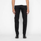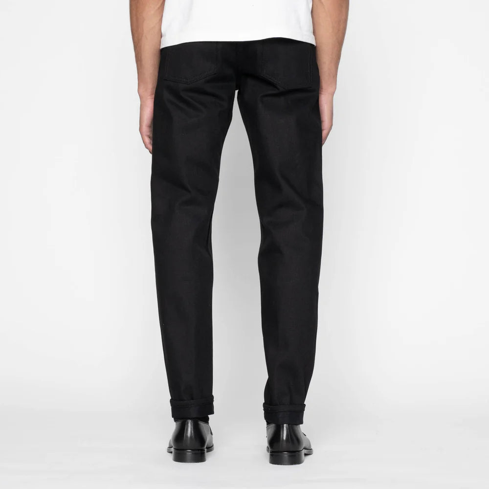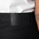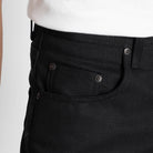 Naked & Famous Easy Guy in solid black Japanese selvedge denim. This 13oz fabric features sulfur-dyed warp and weft for deep, consistent color. Woven on vintage shuttle looms with a right-hand twill and red line selvedge. Cut and sewn in Canada with black stitching, leather patch, and metal hardware. The relaxed tapered silhouette offers a regular rise with room through the seat and thigh, tapering sharply to the hem.