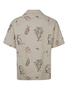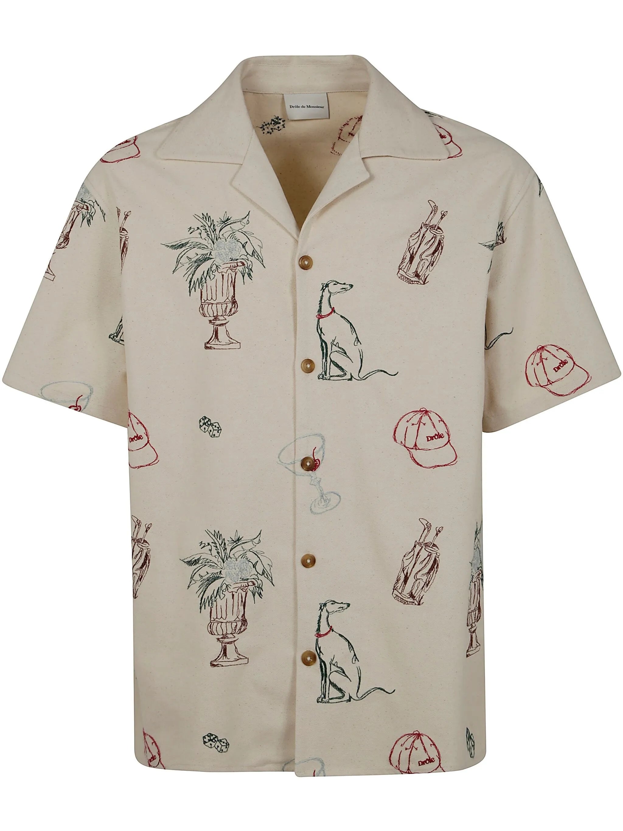 La Chemise Brodee Country Club by Drôle De Monsieur in ecru features a front button closure, camp collar, short sleeves, and an all-over graphic print. Made from a 50/50 cotton and polyester blend.