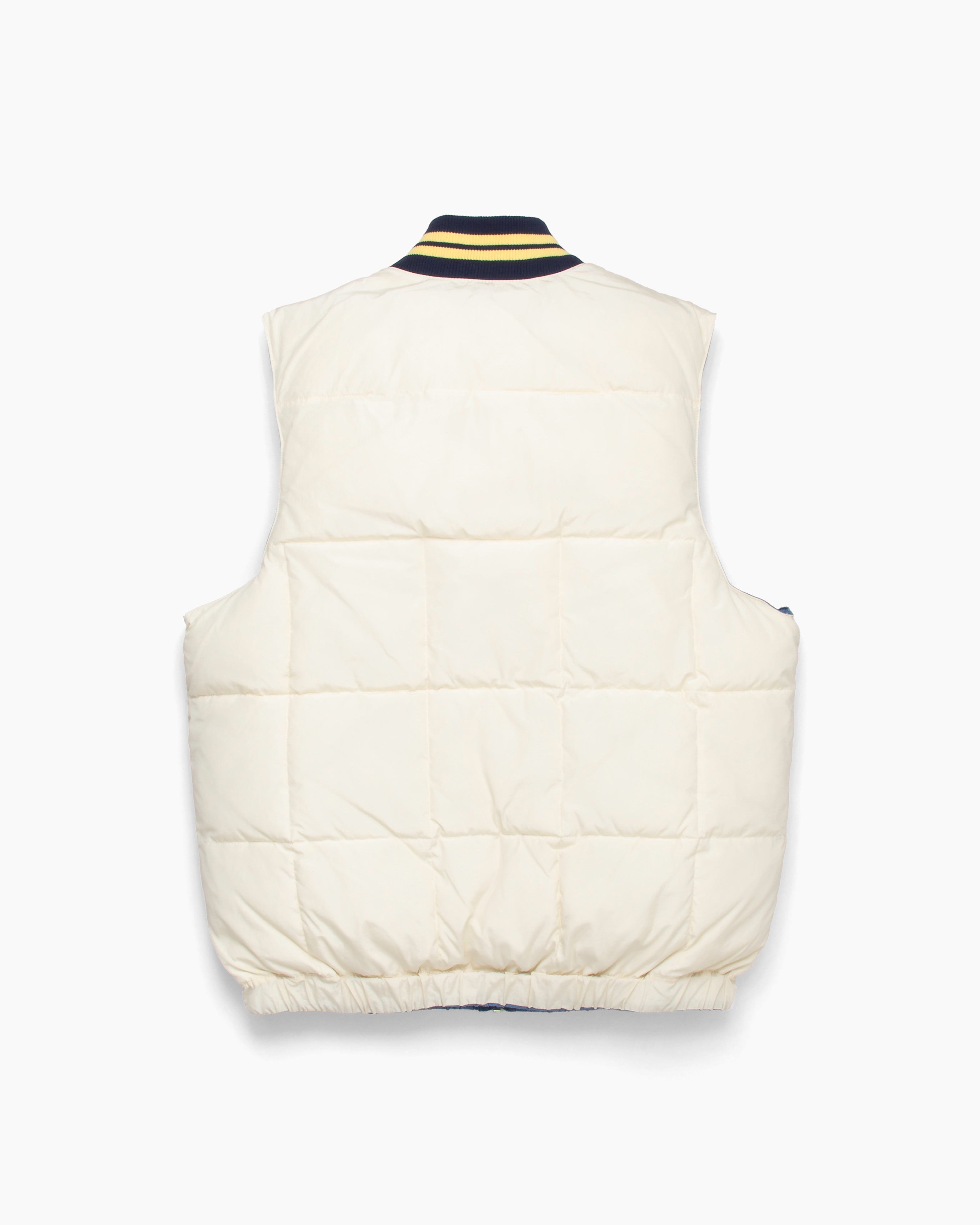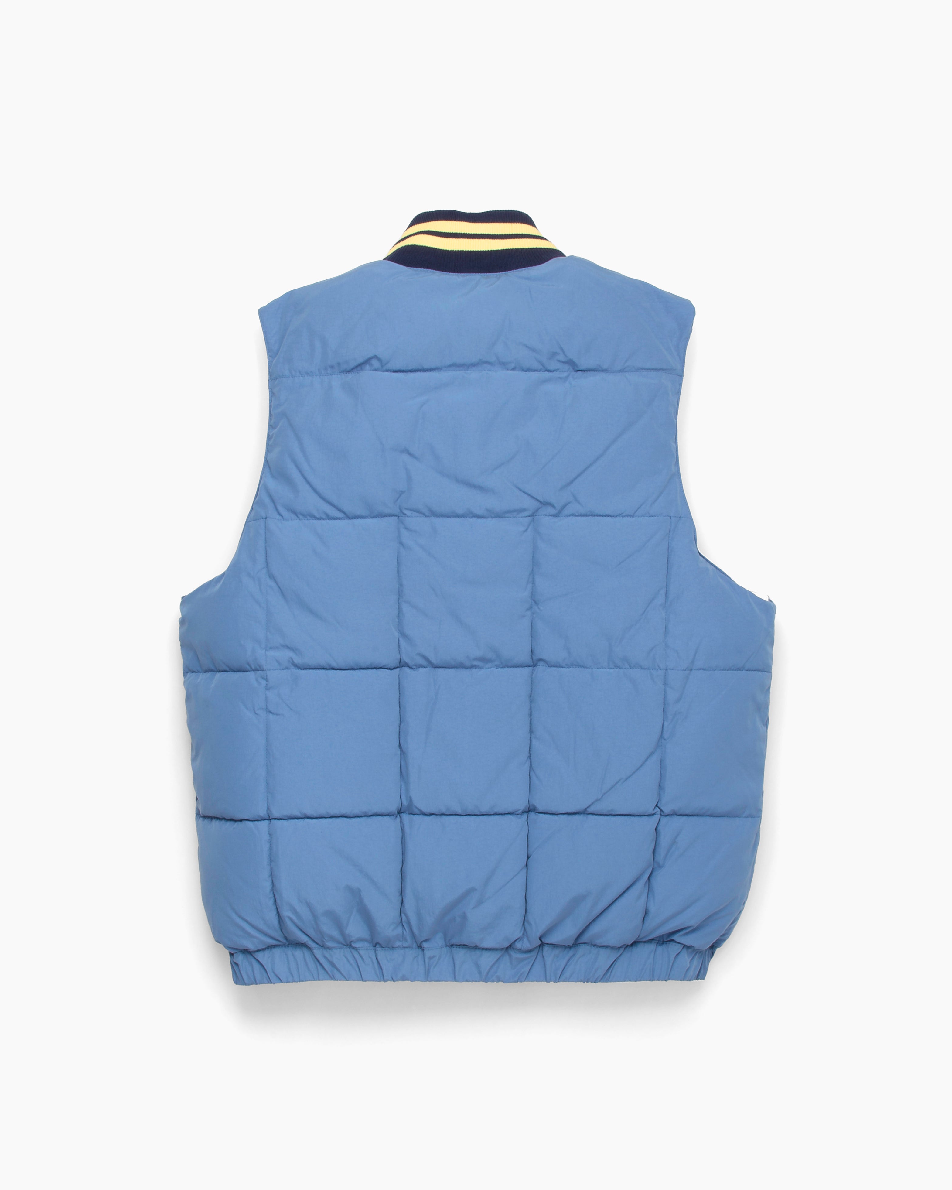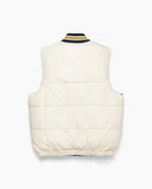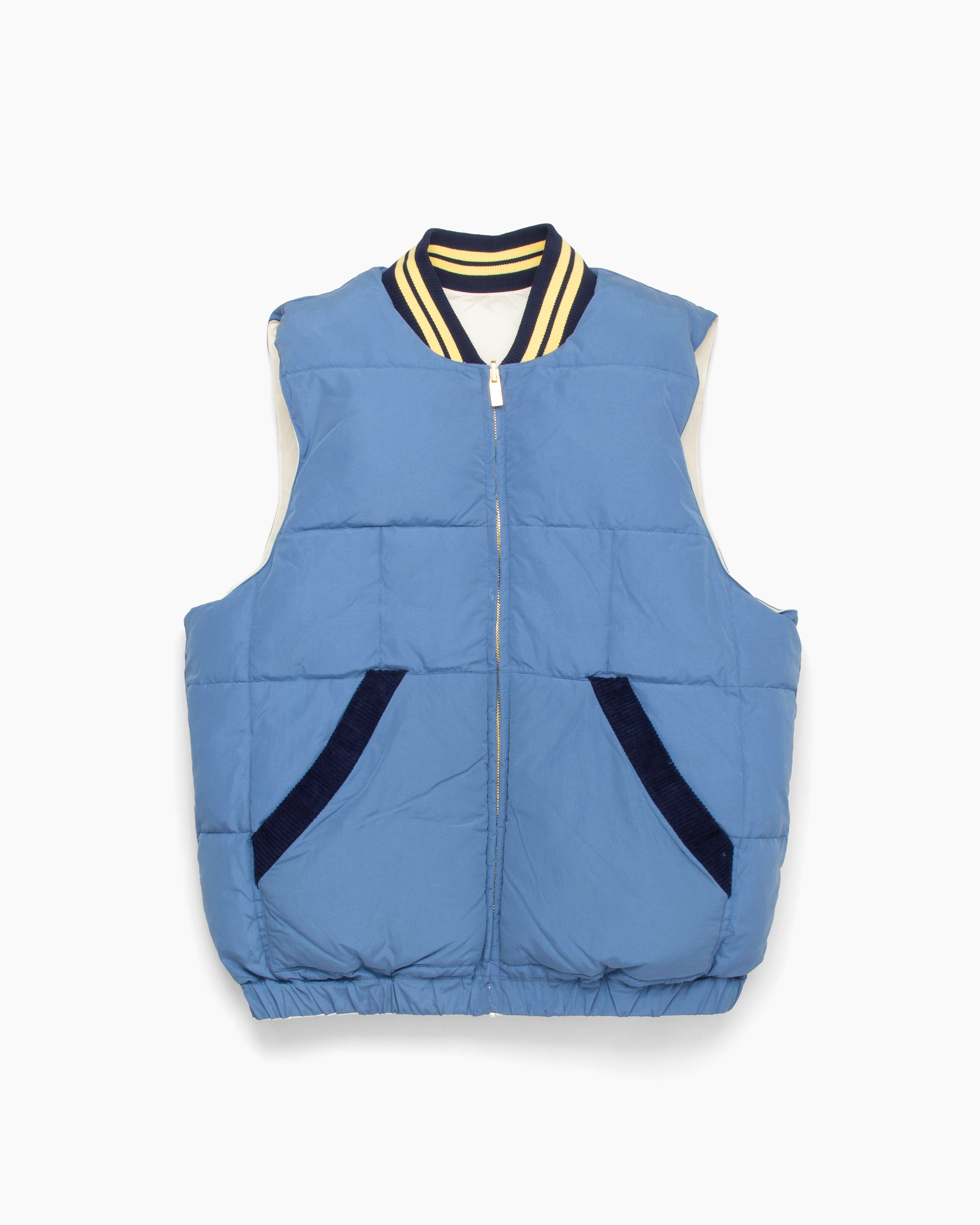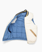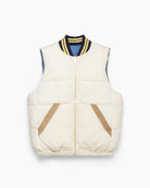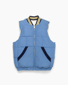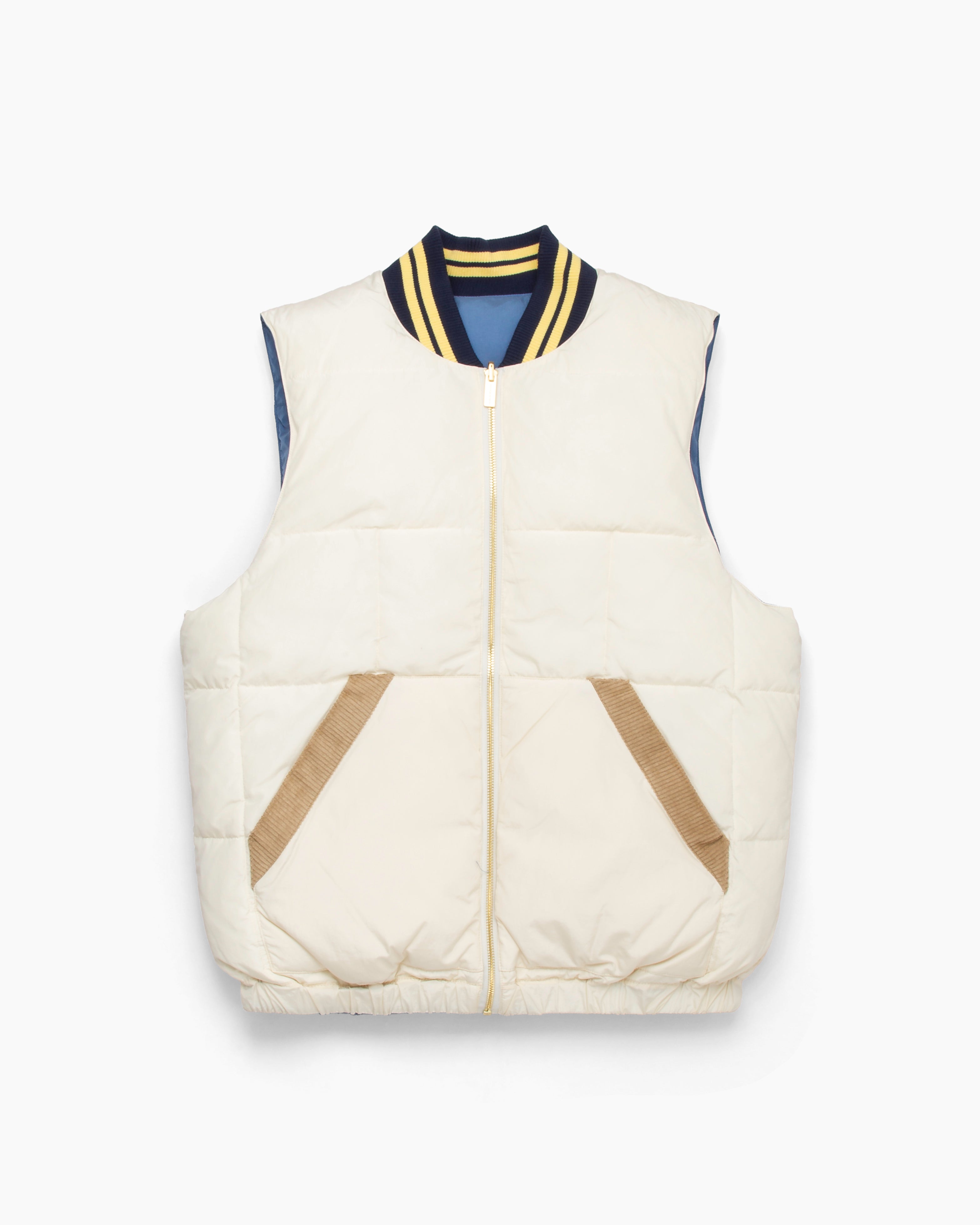 La Doudoune Sans Manches by Drôle de Monsieur is a reversible sleeveless down vest featuring a contrasting ribbed collar and corduroy front pocket details. It includes Primaloft insulation, a zip closure, and an elasticated hem, crafted entirely from 100% polyamide.