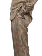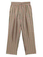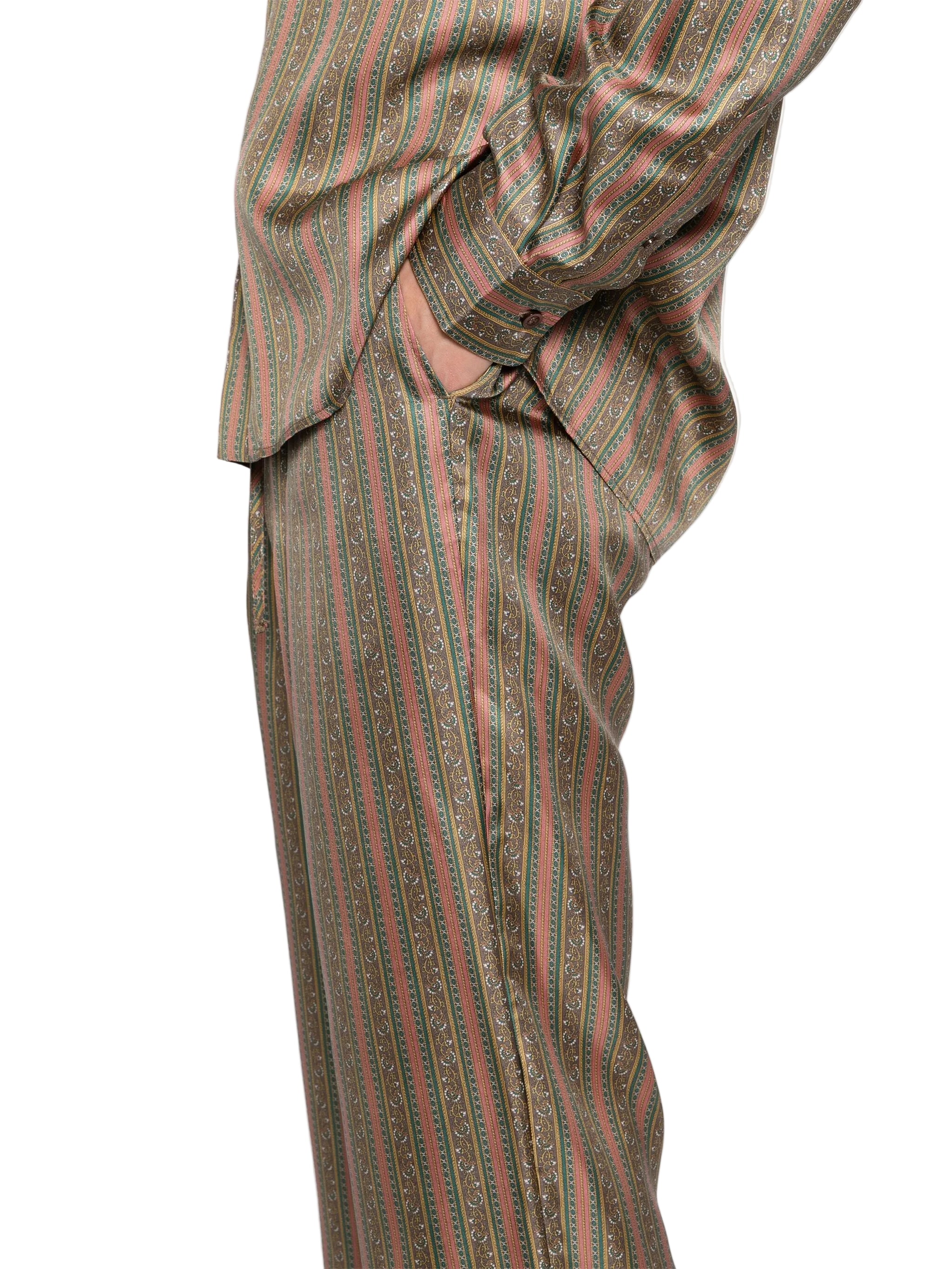 Le Pantalon Rayure Fleuries by Drôle De Monsieur comes in brown with pink stripes, featuring an elastic drawstring waistband and two side pockets. Made from 100% silk outer with a viscose lining. Dry clean only for care.