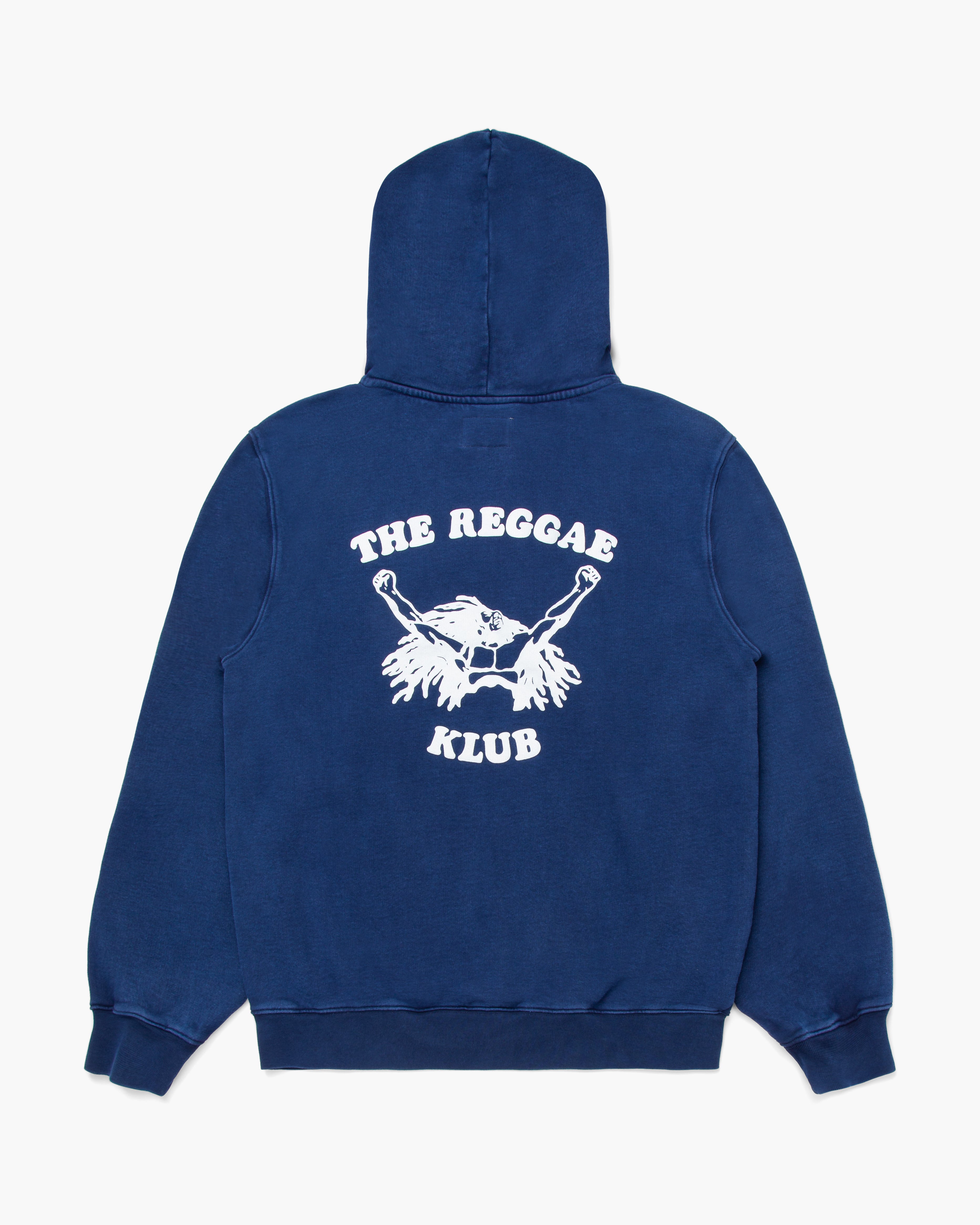 The navy Reggae Klub Hoodie by Nicholas Daley is 100% cotton and has an oversized silhouette. It showcases a vintage wash and features a screen printed logo on the back and embroidered on the front.