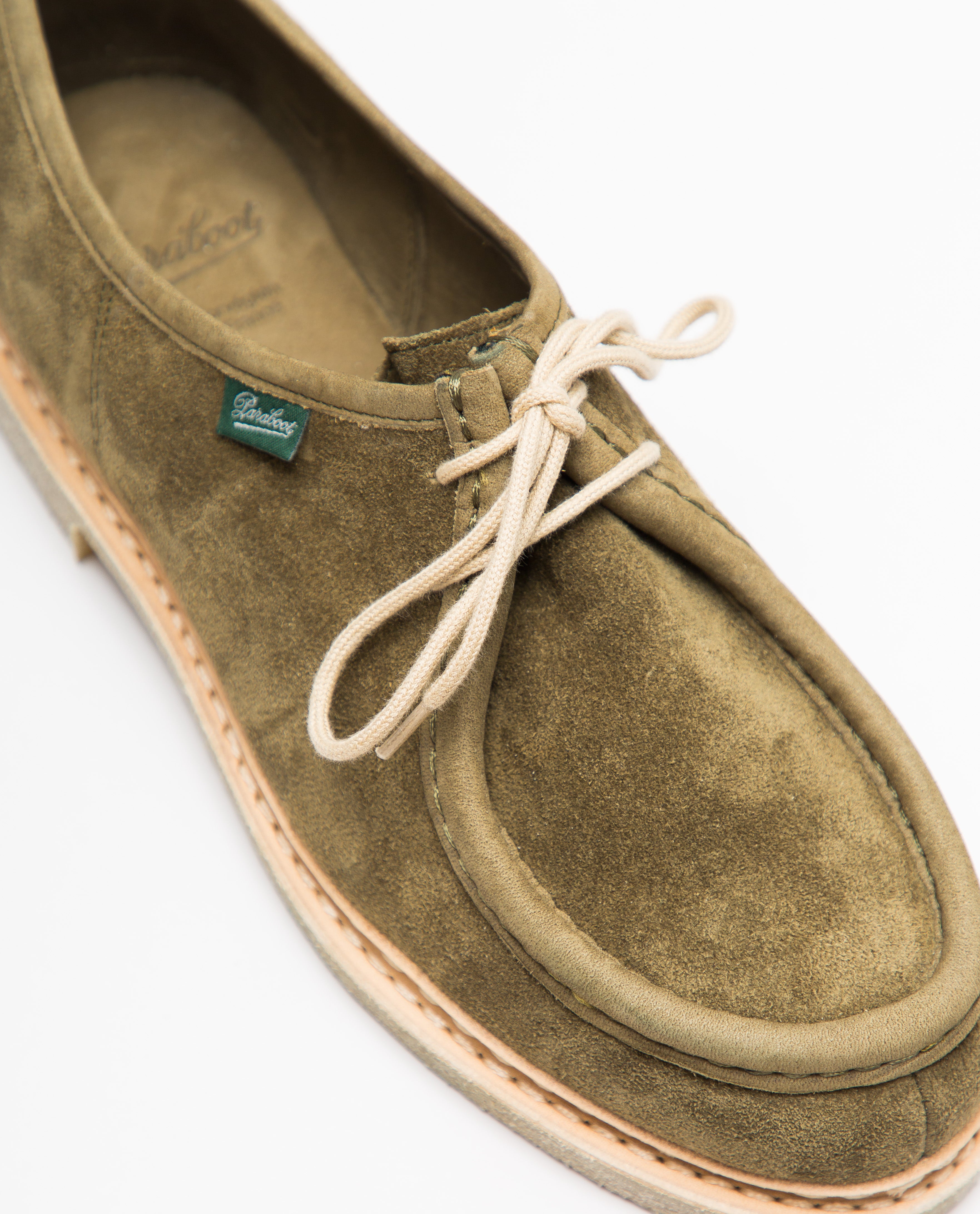 Upgrade your style with the Micka derby in green by Paraboot. This modern take on the iconic Michael model offers a sleek, unlined design for unmatched comfort. Made with premium suede leather and a durable rubber sole, and featuring a Norwegian welt construction, the Micka combines sophistication and long-lasting wear.