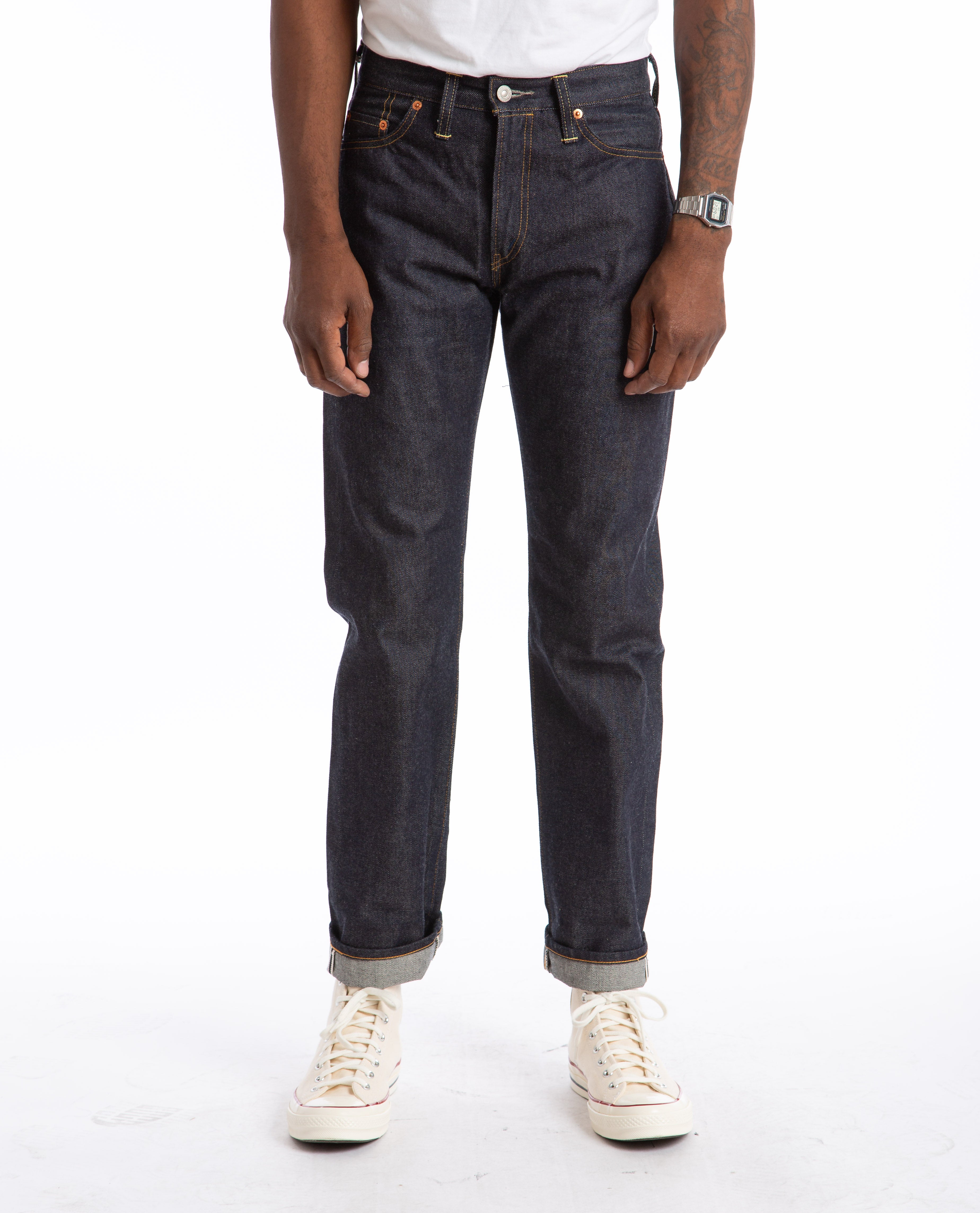 1954 501 Original Fit Selvedge Jeans in rigid denim by Levi's Vintage Clothing. "501 Z" style with zipper instead of buttons, iconic silhouette, rivets, and durable denim. Includes double-needle arcuate stitching and two hidden rivet back pockets, crafted from organic cotton.