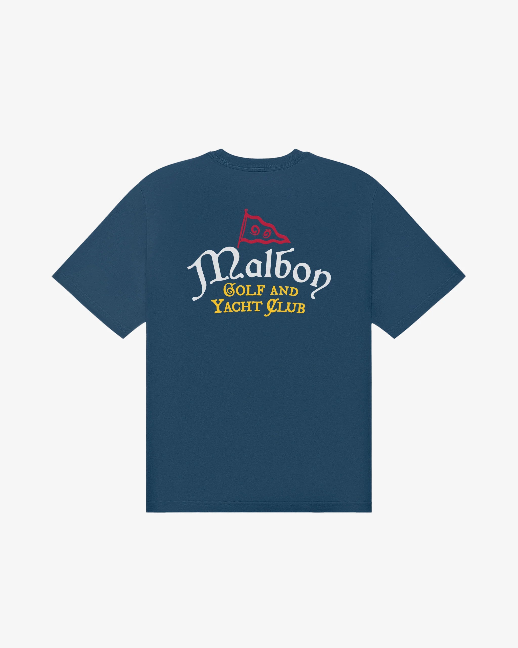 Bermuda Yacht Club Tee in navy by Malbon. Premium cotton essential with a relaxed fit, featuring printed Malbon Golf and Yacht Club graphics. Made in the USA.