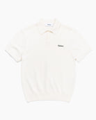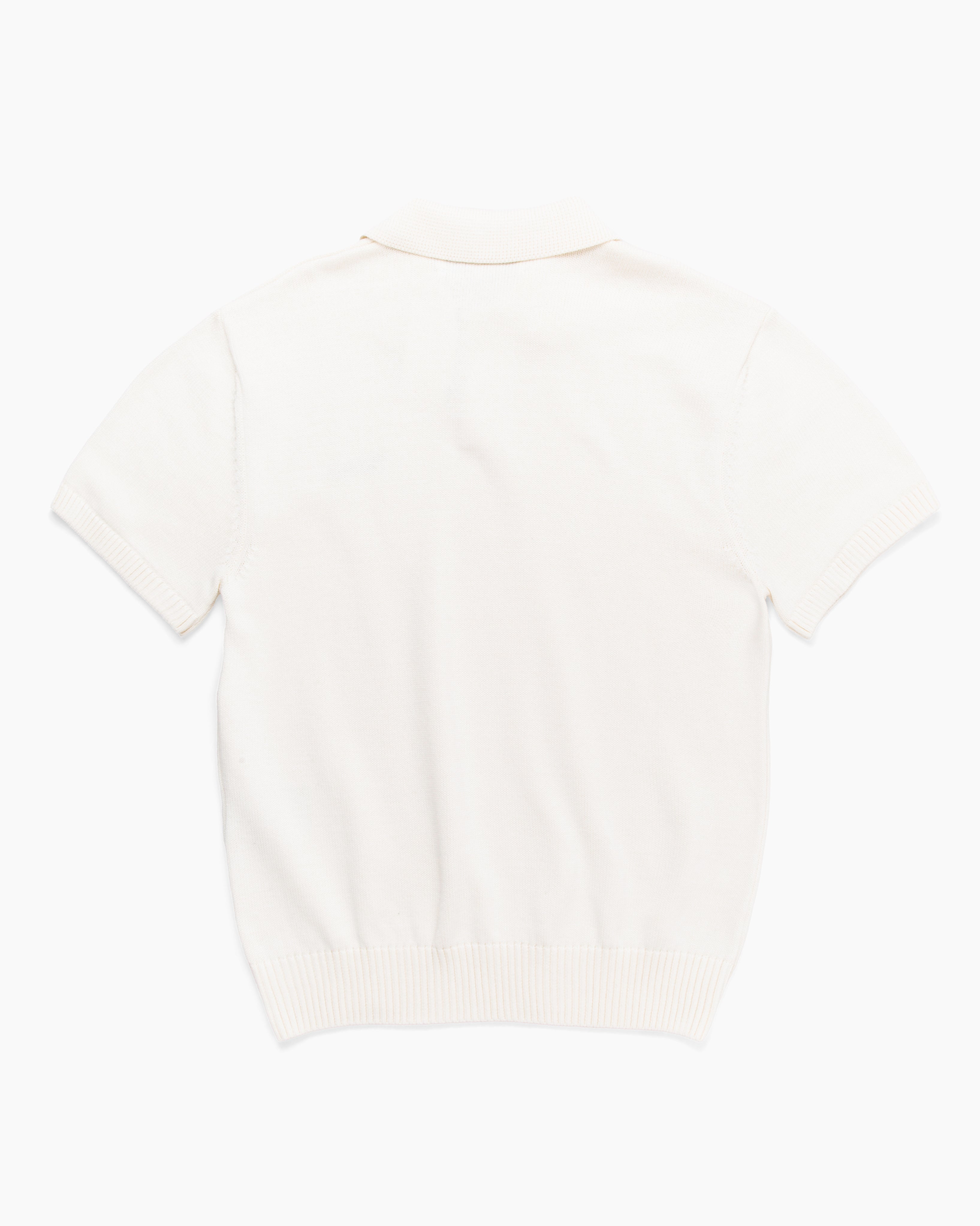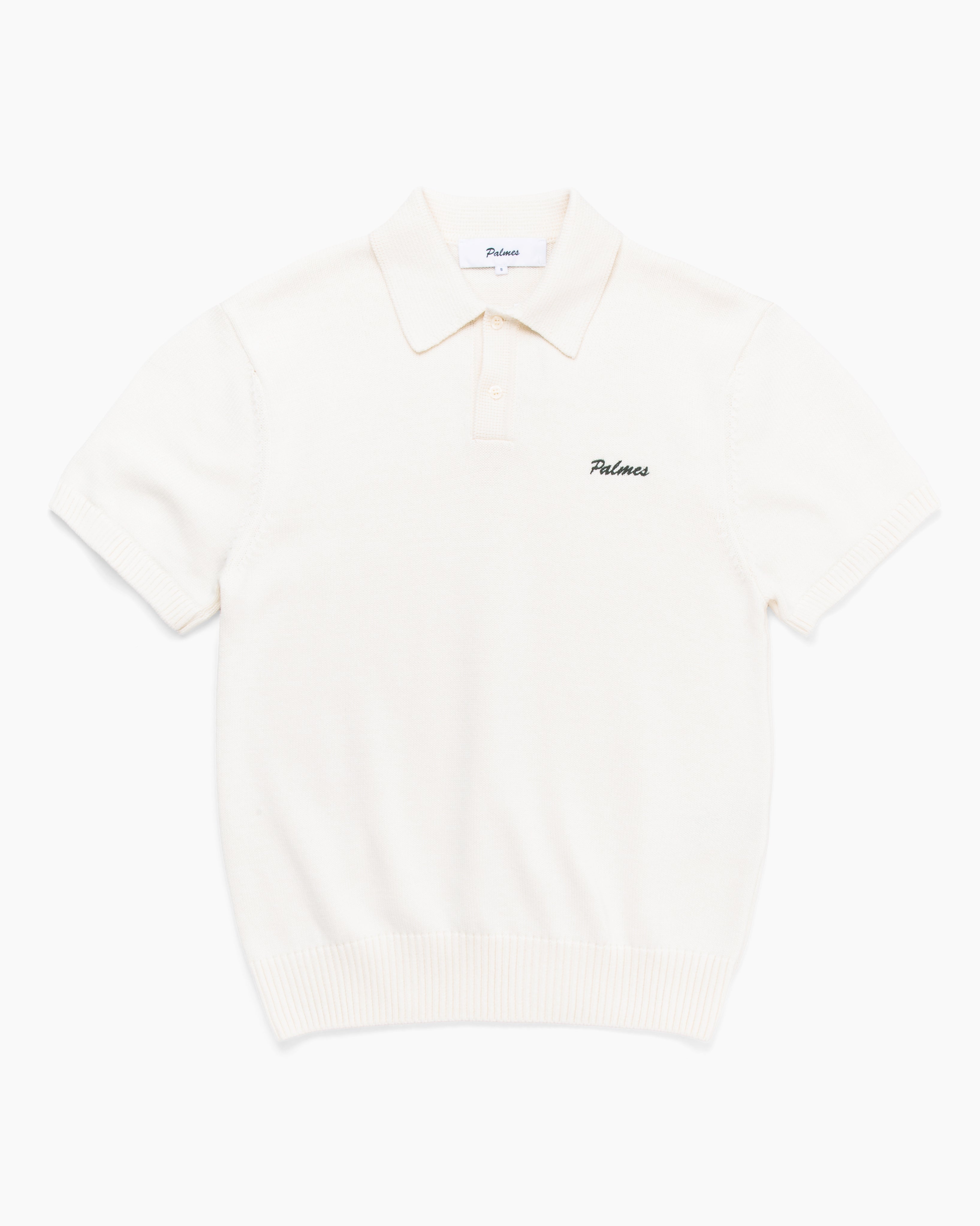 Cotton Knit Polo by Palmes in off white. Crafted from organic cotton with a refined 7-gauge knit, ribbed cuff and hem, and embroidered signature detail.