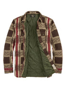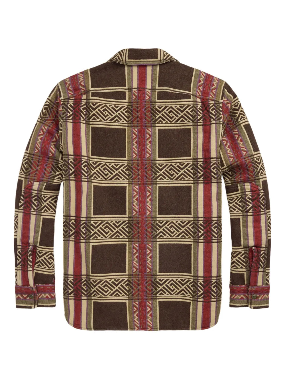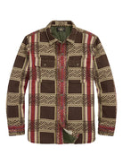 The Jacquard Overshirt in brown by RRL is crafted from jacquard-woven cotton inspired by vintage blankets. It features an onion-quilted lining with lightweight down-alternative fill, two buttoned chest pockets, side seam pockets, and vintage metal buttons.