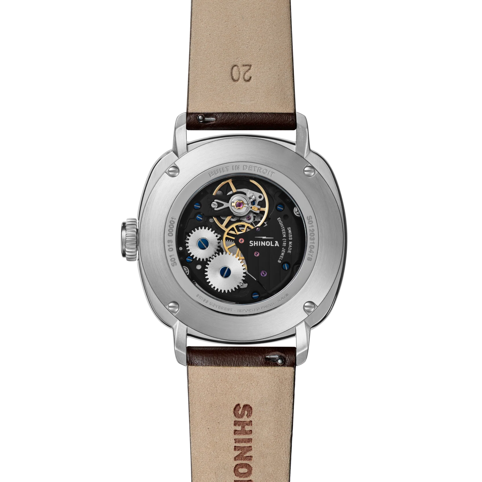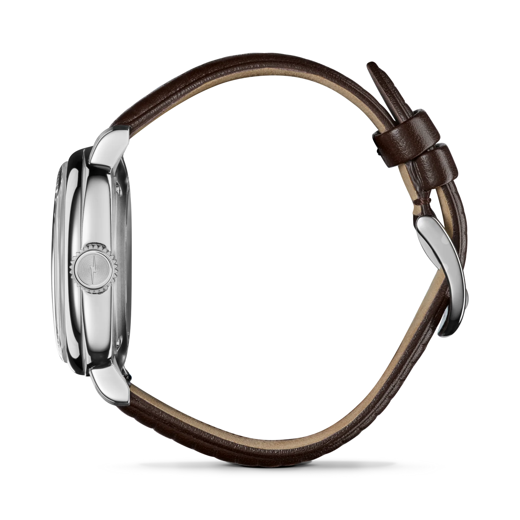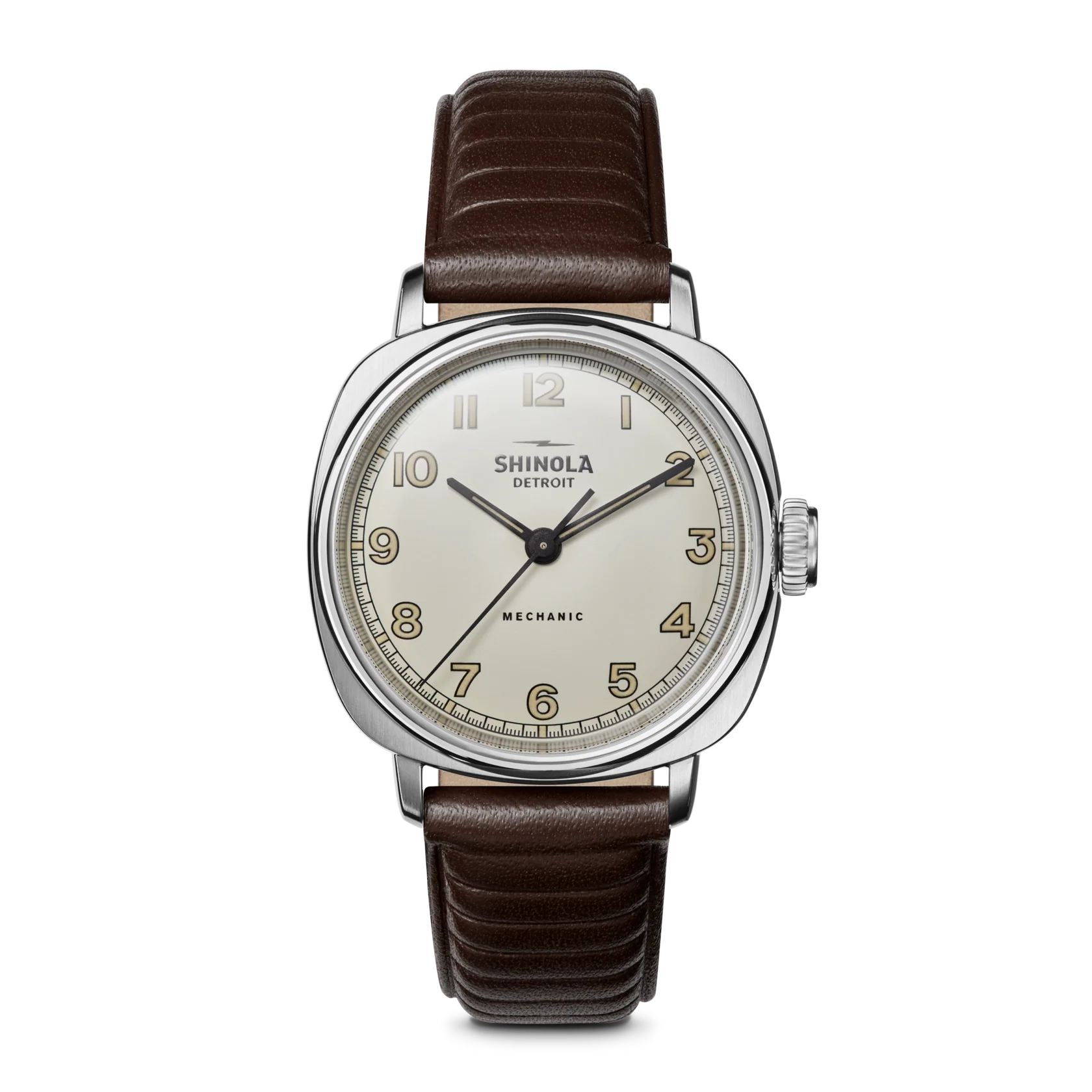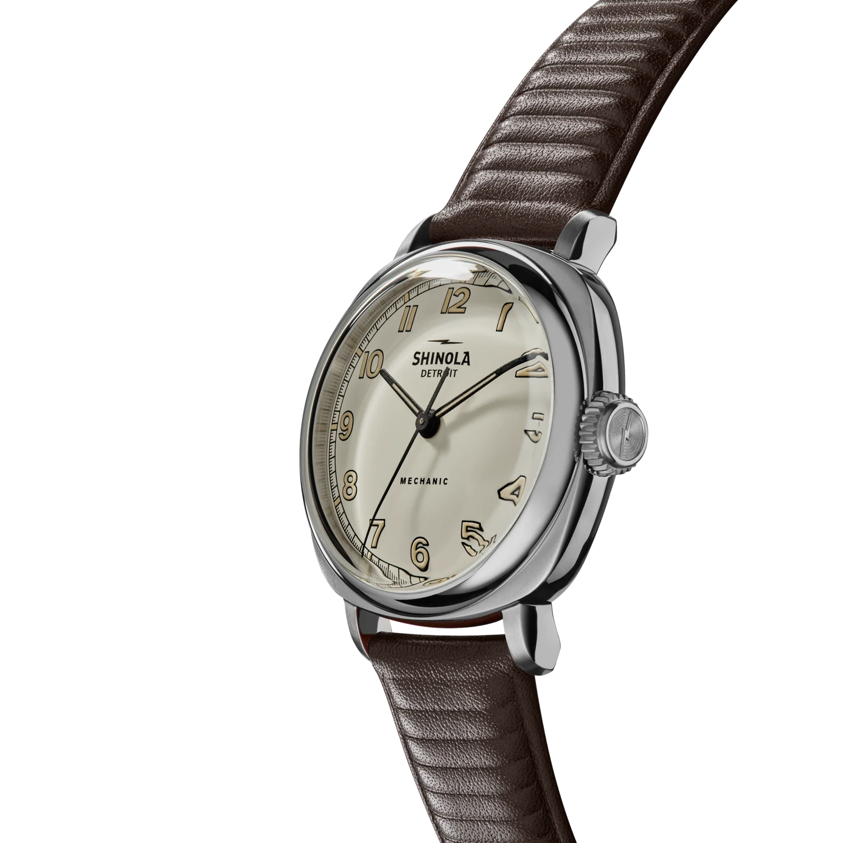 A hand-wound mechanical watch with vintage charm and modern craftsmanship. The Mechanic features a domed alabaster dial, box crystal, and exhibition caseback revealing its manual-wind movement. Finished in polished stainless steel with a brown leather strap, it delivers 42 hours of power reserve. Built for those who appreciate tactile, analog timekeeping.