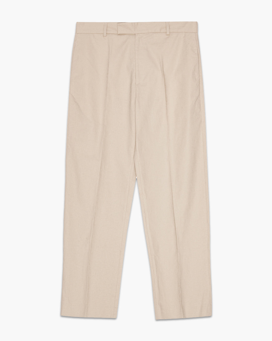 Palmes' Pleated Linen Trousers in bone offer a relaxed tapered fit with side seam front pockets, welted back pockets, and a zip fly. Made of a blend of 50% Linen, 48% Cotton, and 2% Elastane.