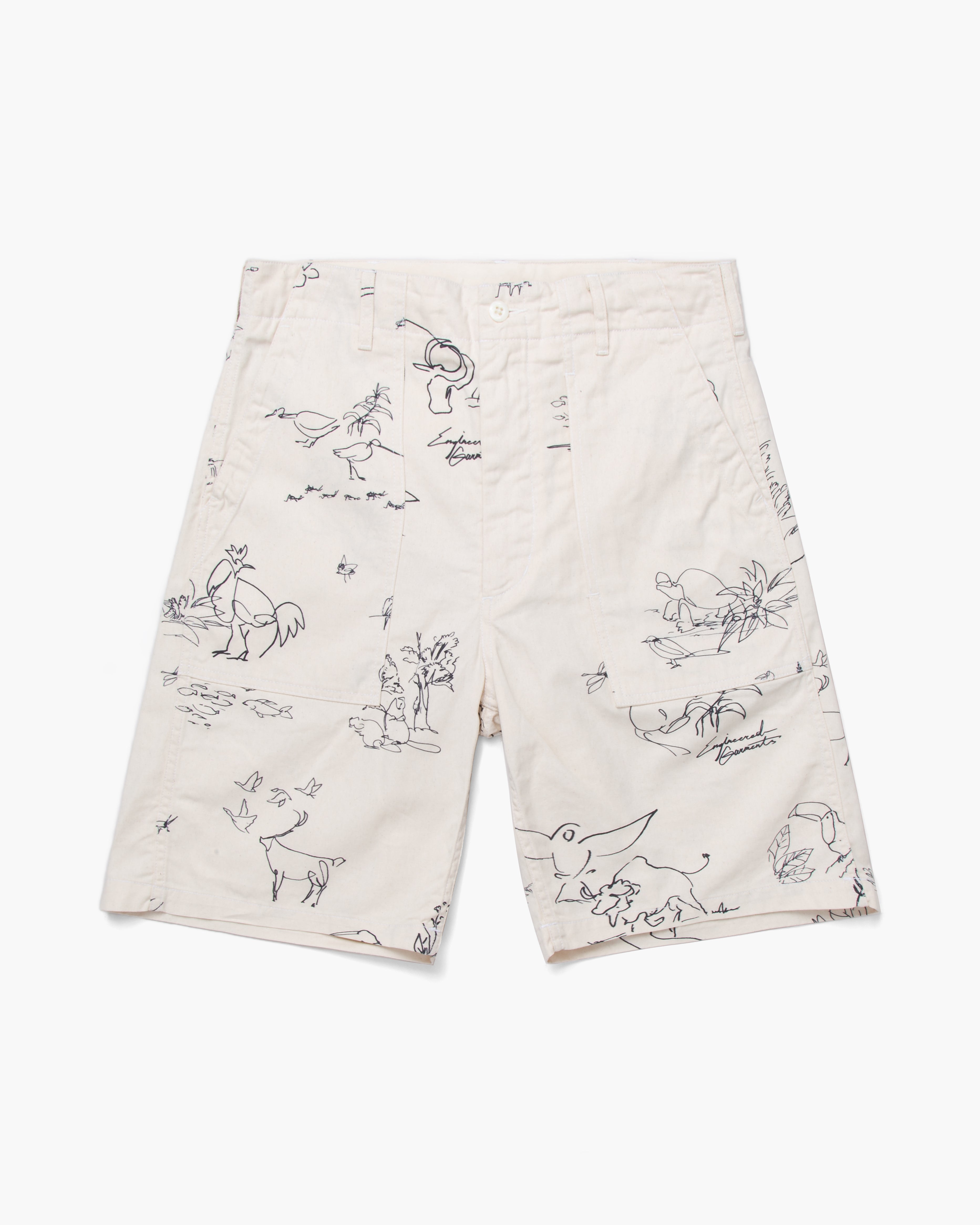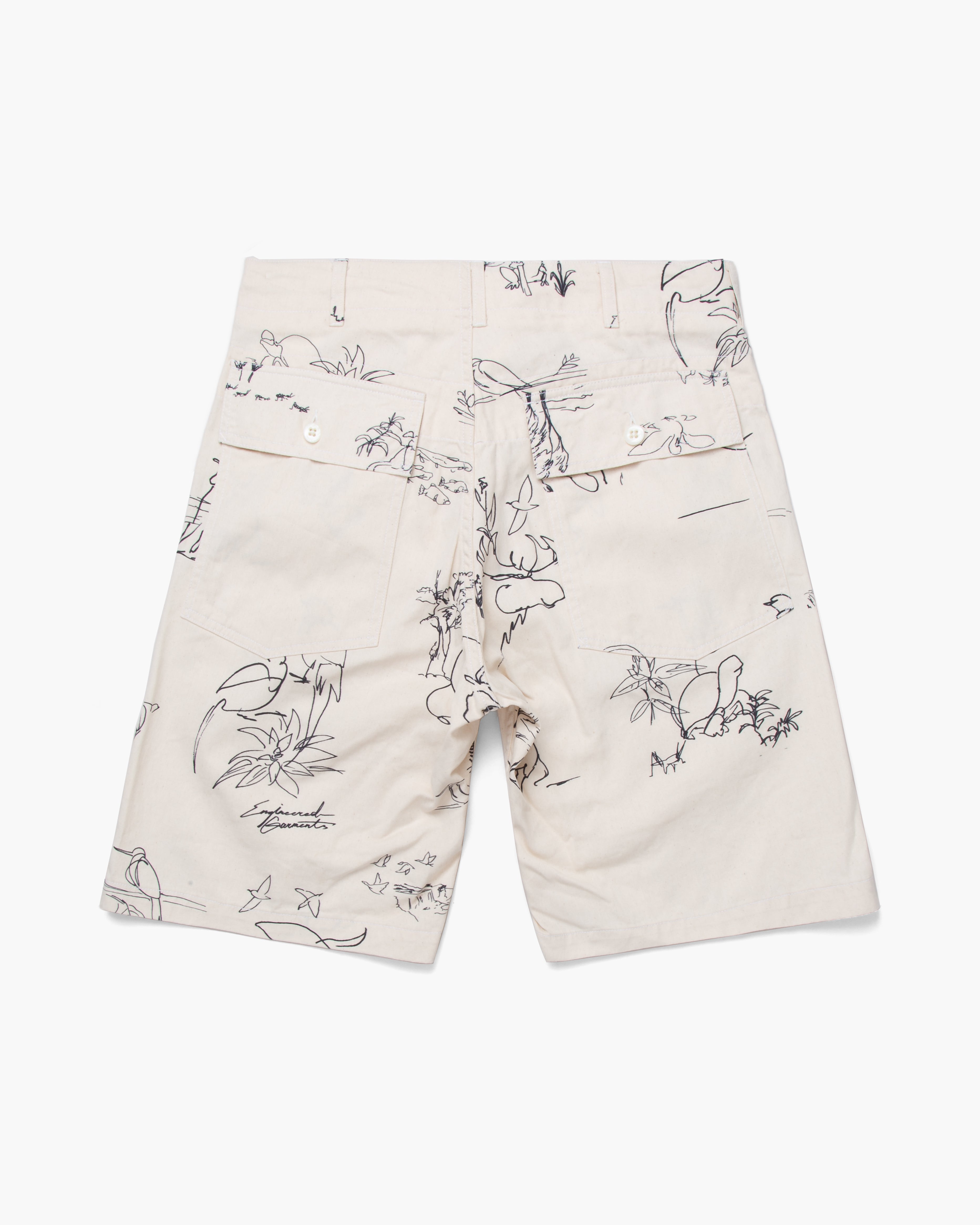 Engineered Garments' Fatigue Short in natural features printed tropical sketches throughout. Drawing inspiration from military fatigue pants, these shorts contain front and back flap patch pockets, and have a regular fit leg cut that stops just above the knees.